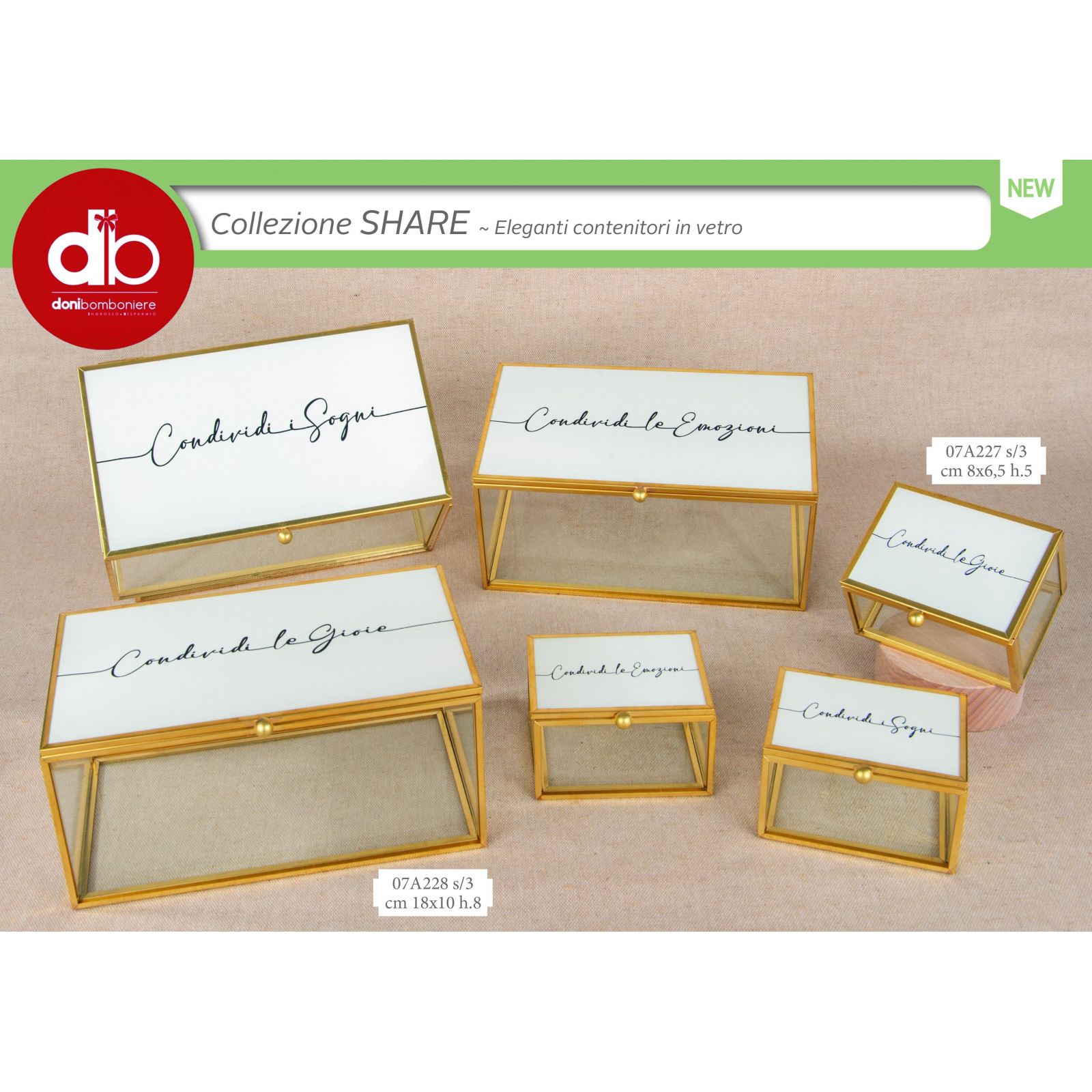 Scoprire un modo per celebrare i momenti speciali è fondamentale per rendere ogni evento indimenticabile. Le nostre eleganti scatole in vetro rettangolare, disponibili in tre modelli con le frasi "Condividi i Sogni", "Condividi la Gioia" e "Condividi le Emozioni", sono la scelta perfetta per le tue bomboniere. Questi piccoli scrigni di bellezza non solo racchiudono dolci confetti, ma anche un messaggio profondo di amore e condivisione, rendendo ogni celebrazione ancor più significativa.