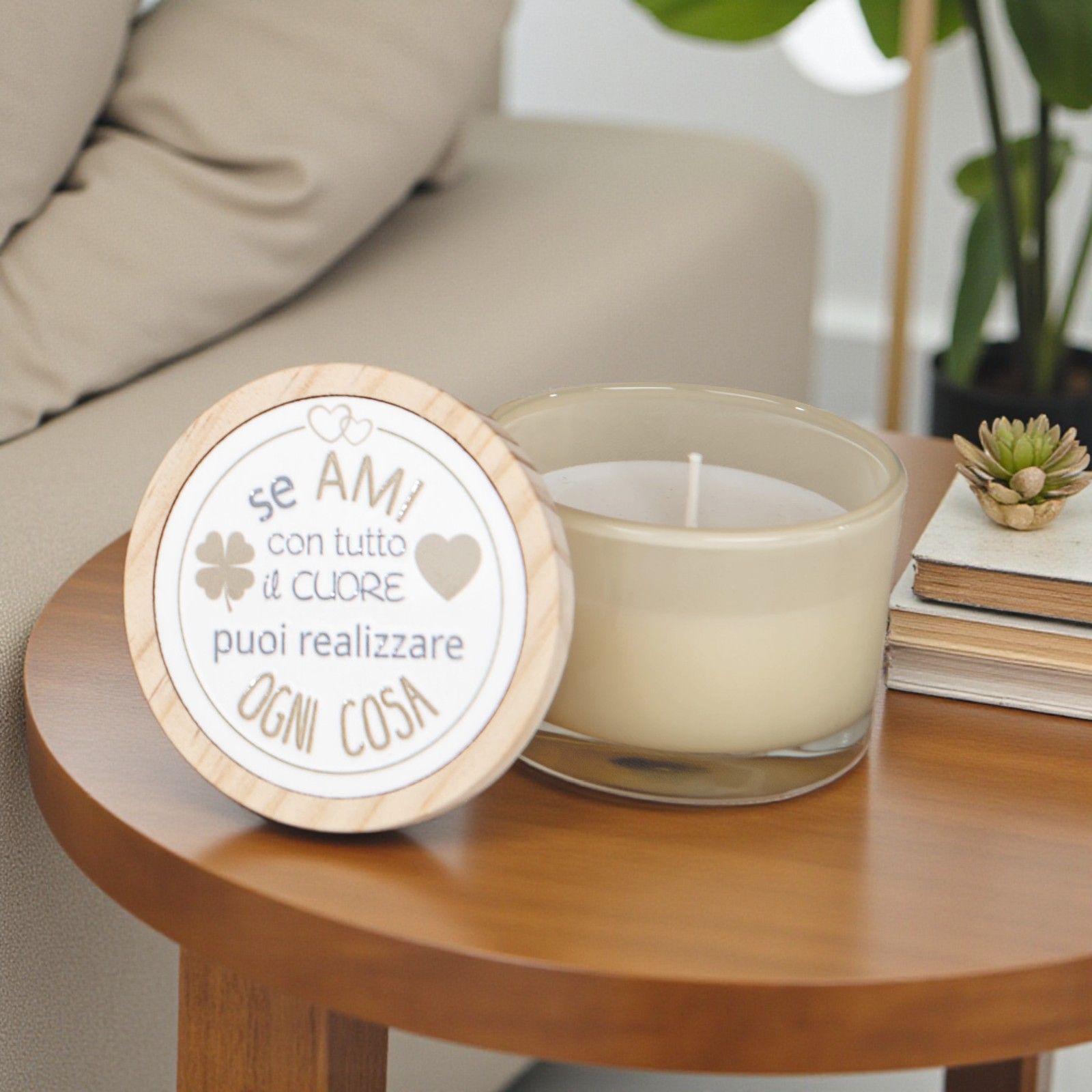 Celebra l'amore con questa bomboniera elegante: un portacandela in vetro con tappo in legno, impreziosito dalla frase "Se ami con tutto il cuore puoi realizzare ogni cosa". Perfetta per matrimoni, anniversa ri o promesse, diventa un pensiero speciale da donare agli invitati, simbolo di affetto e dedizione.