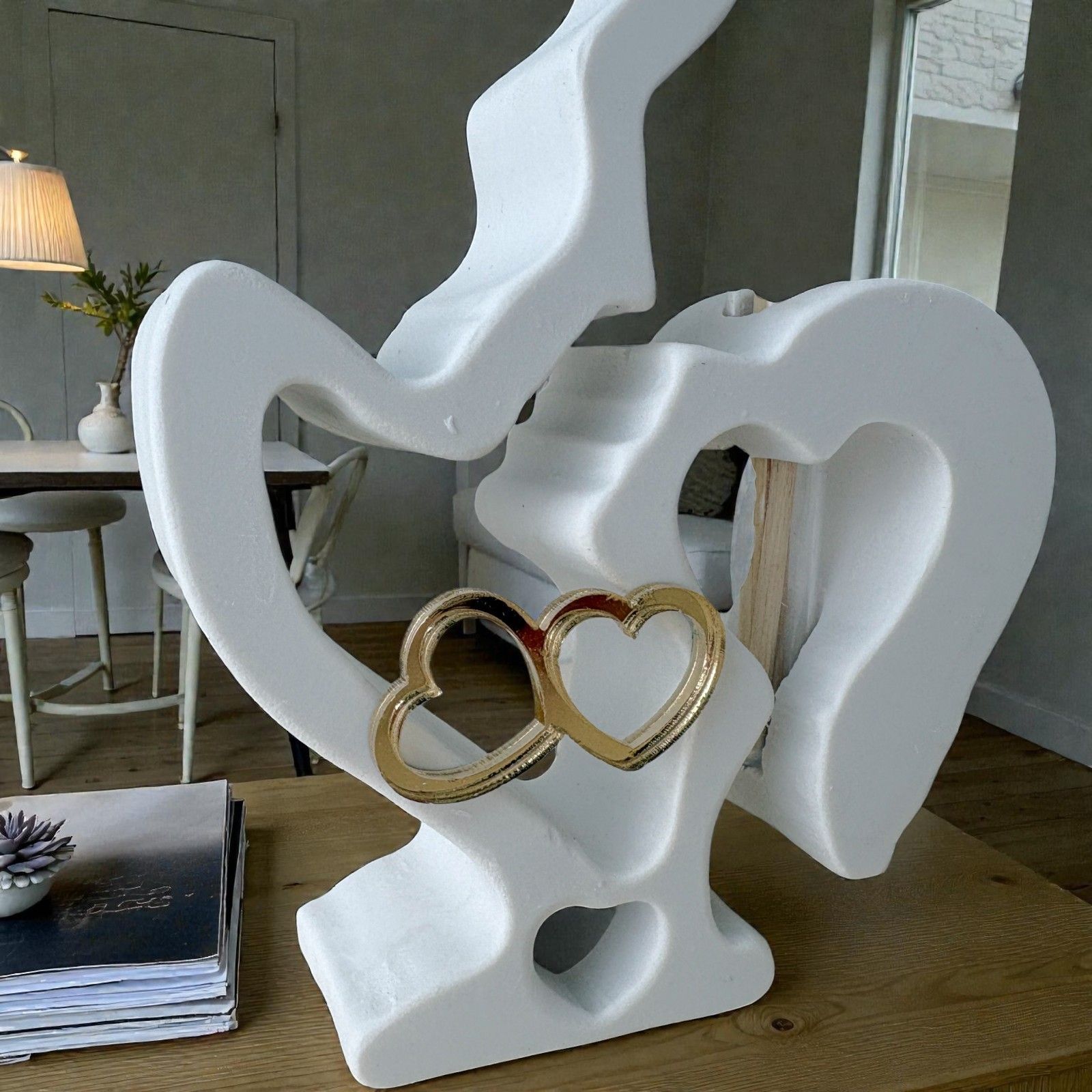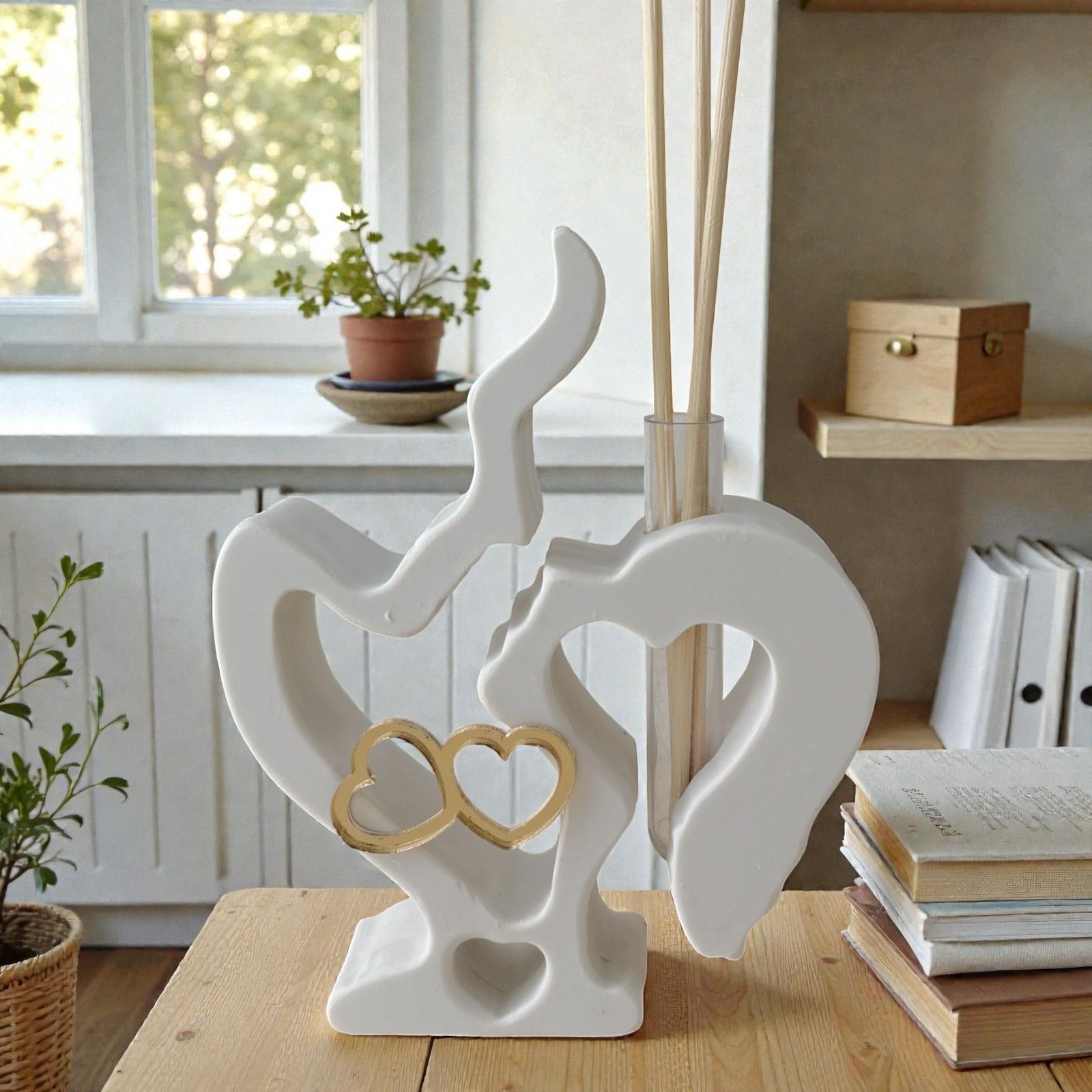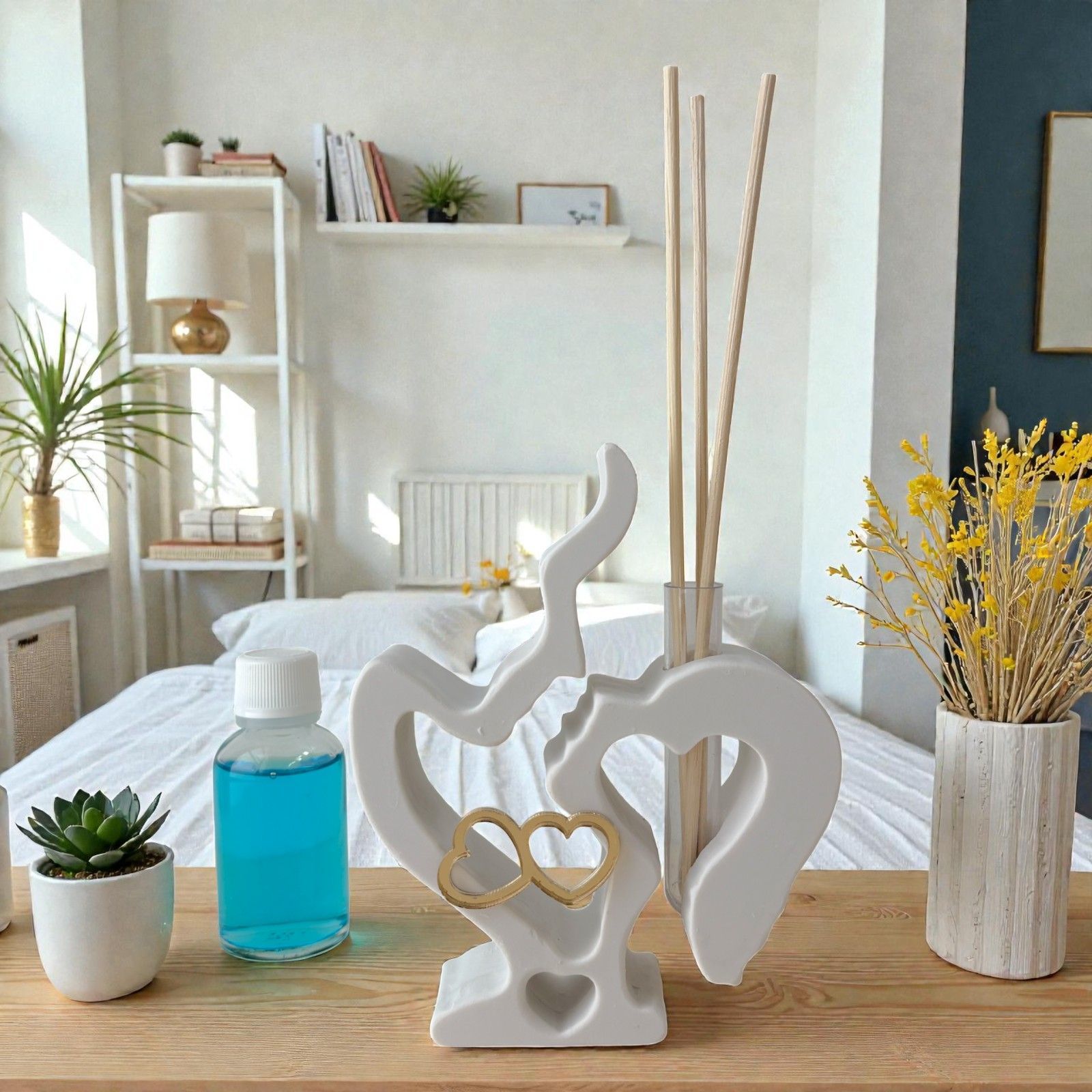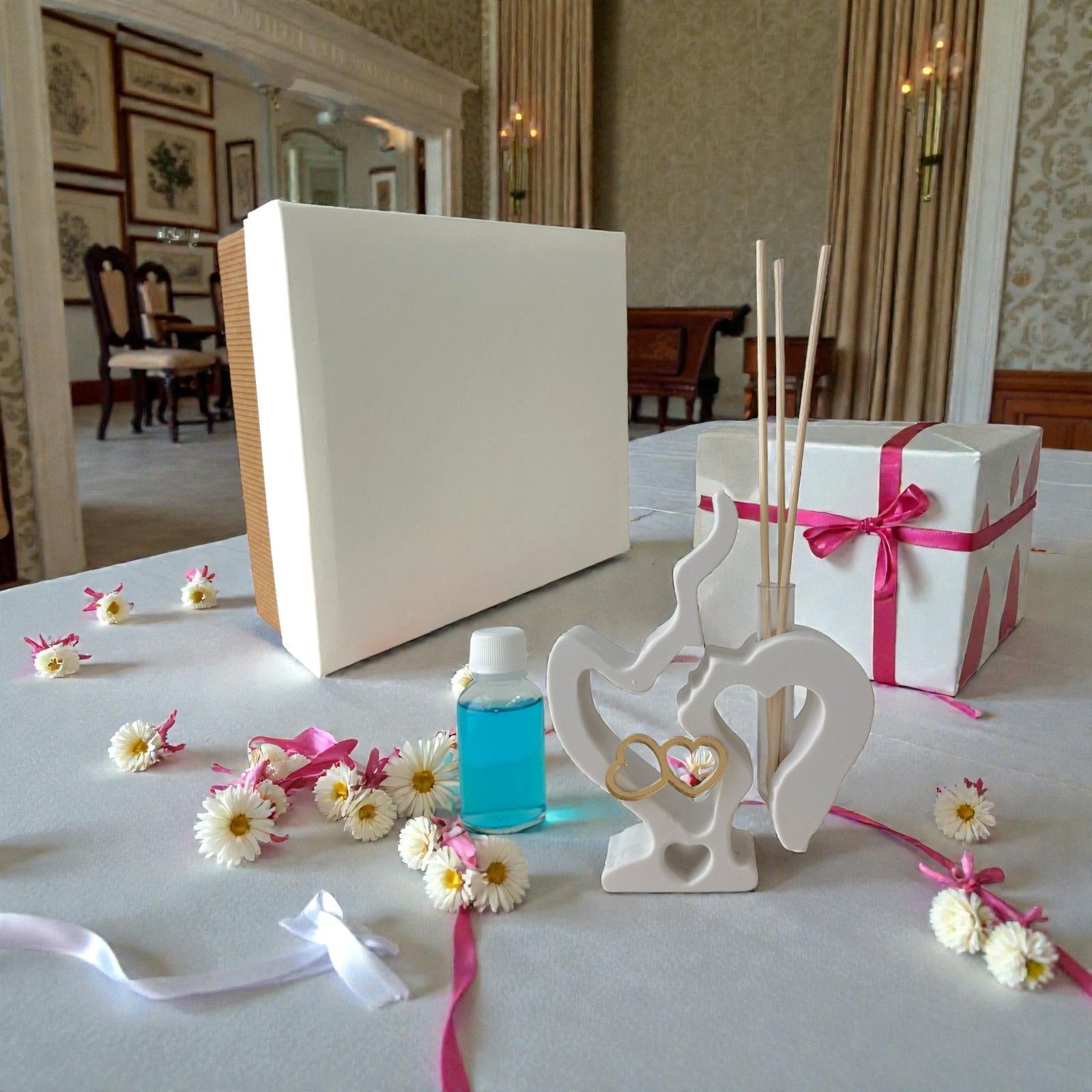 Realizzato in resina di alta qualità, il profumatore presenta una sagoma stilizzata dei volti di una coppia di innamorati, mentre due cuori in plexiglass dorato aggiungono un tocco di eleganza e romanticismo. La fiala in vetro porta profumo, completata da bastoncini e un'essenza profumata, già inclusi, rende questo articolo una bomboniera anniversario perfetta, capace di creare atmosfere incantevoli e indimenticabili.