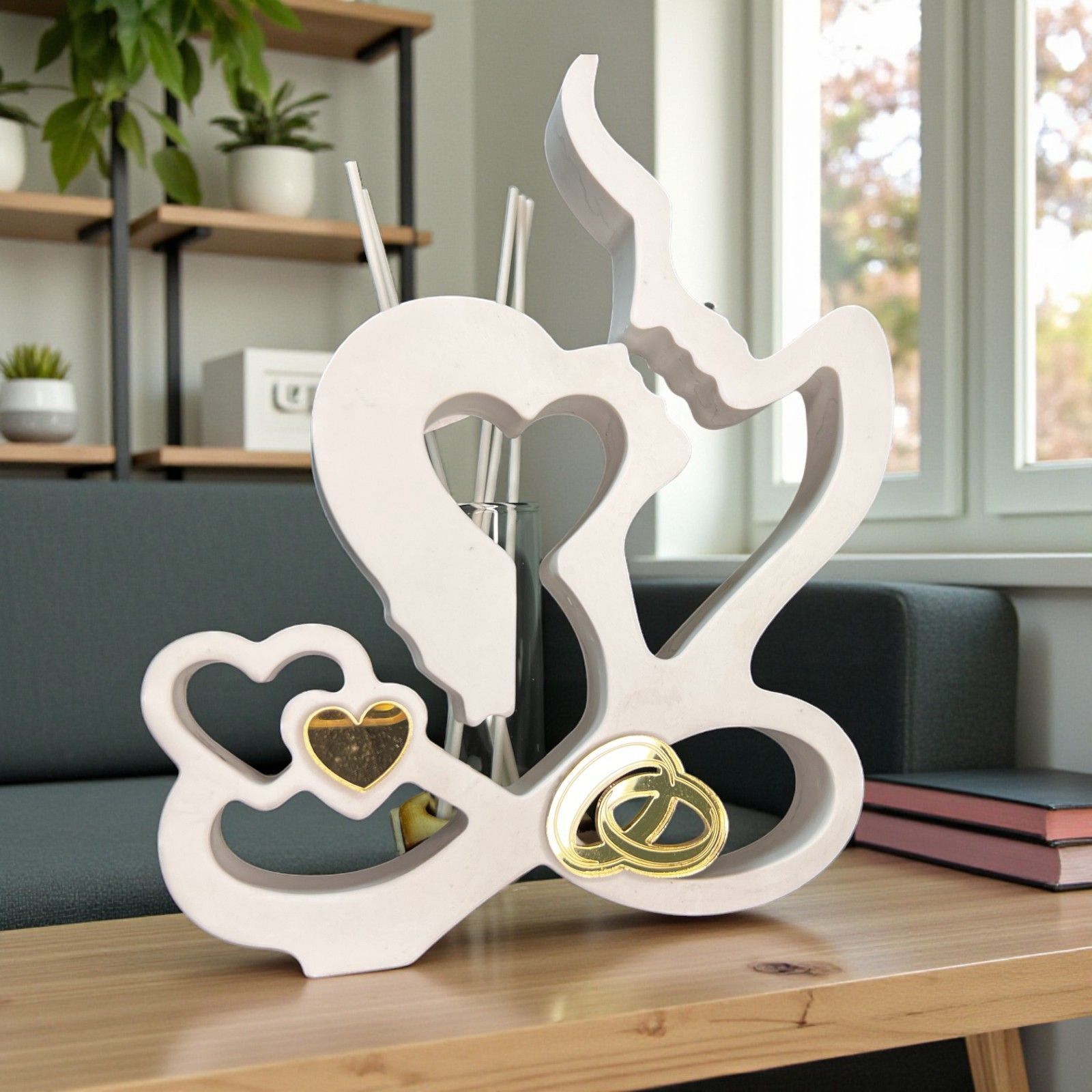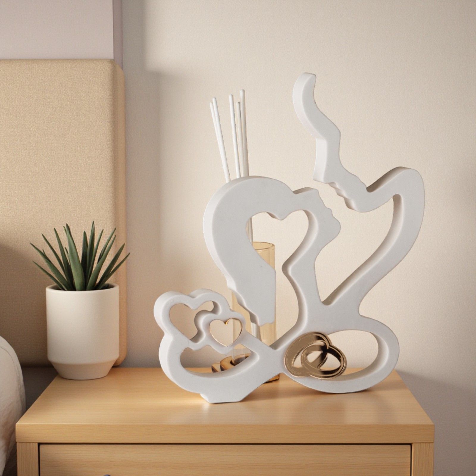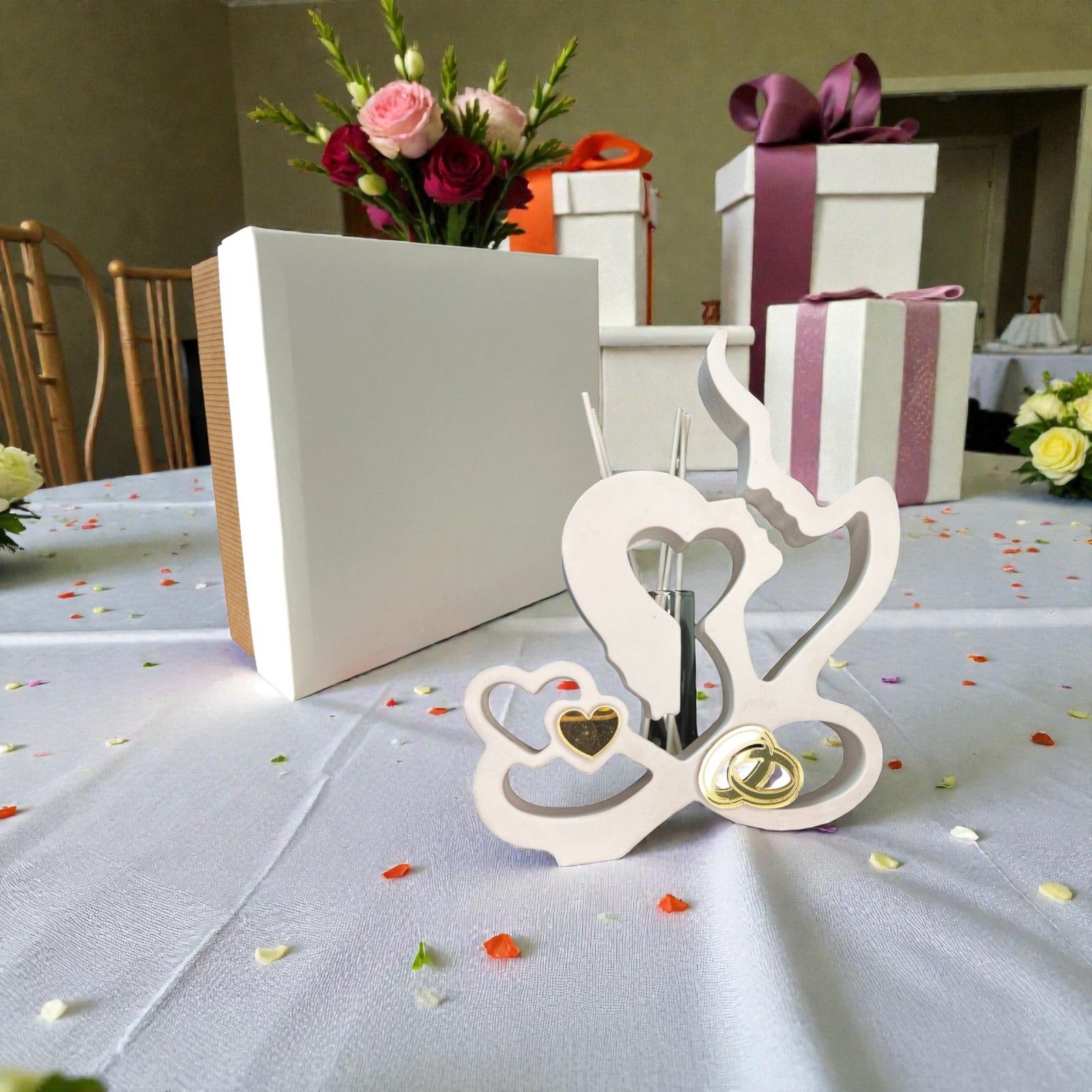 Realizzato in resina di alta qualità, il nostro profumatore è adornato con dettagli dorati in plexiglass, un cuoricino e le fedi intrecciate, simboleggiando l’amore duraturo. La provetta in vetro, posizionata sul retro su una base in legno, è pronta a riempire l’atmosfera con essenze delicate, completa di tappo in sughero.