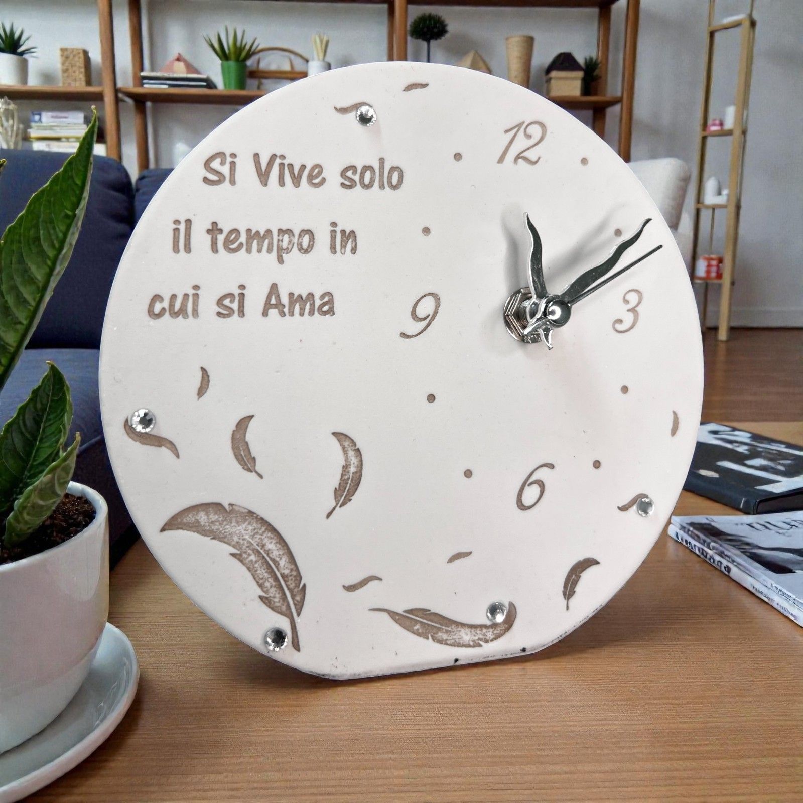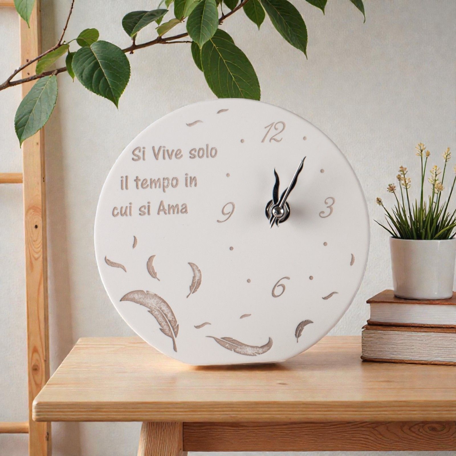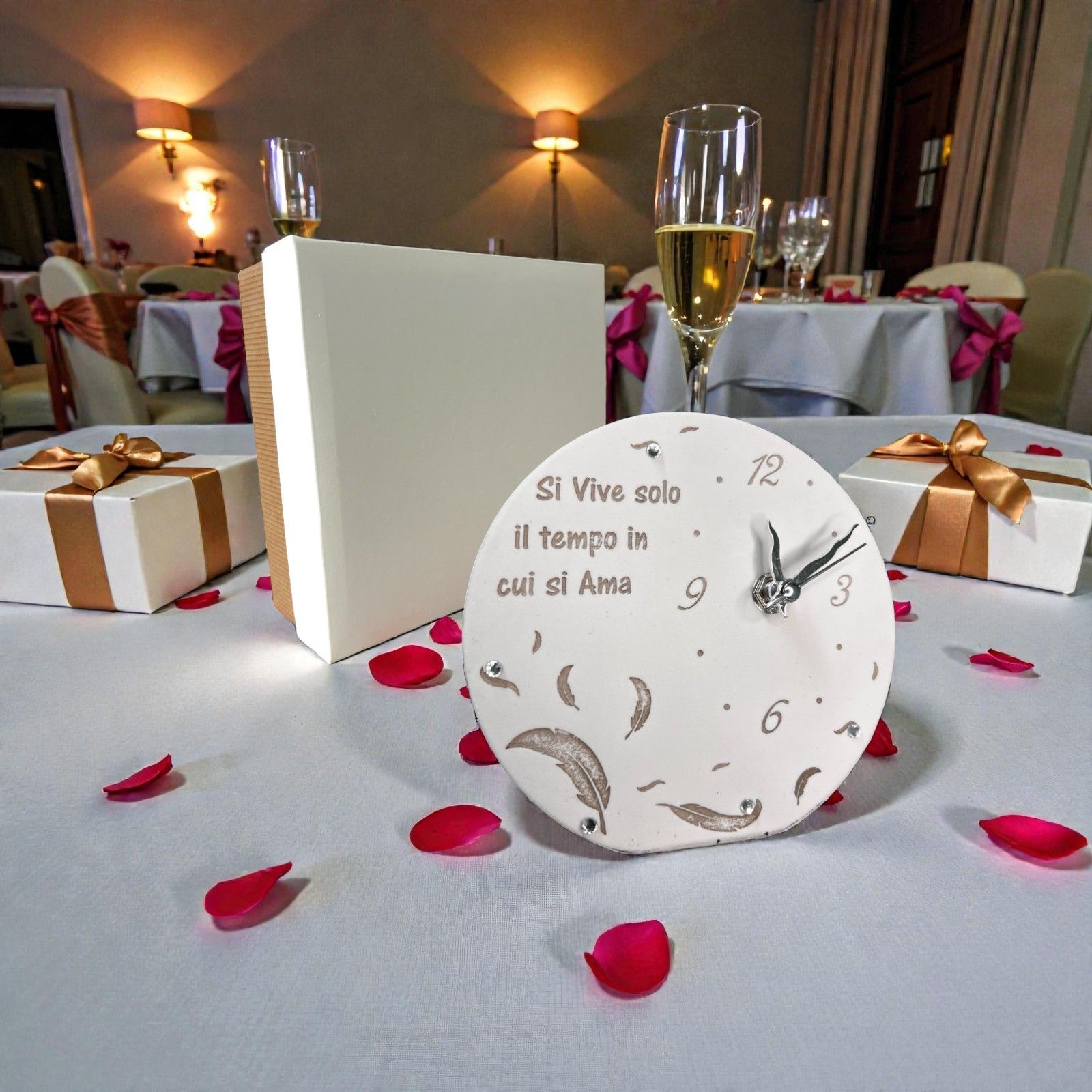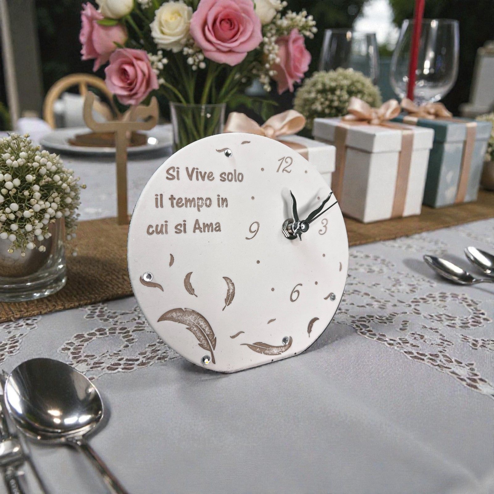 Scopri l'eleganza e la dolcezza delle nostre bomboniere, un regalo pensato per rendere ogni evento unico e indimenticabile. Questo orologio con piume è molto più di un semplice oggetto decorativo; rappresenta il tempo e l'amore, un messaggio profondo da condividere con i tuoi cari. Con la frase incisa "Si vive solo il tempo in cui si ama", questo pezzo speciale sarà un simbolo di affetto e di ricordi preziosi.