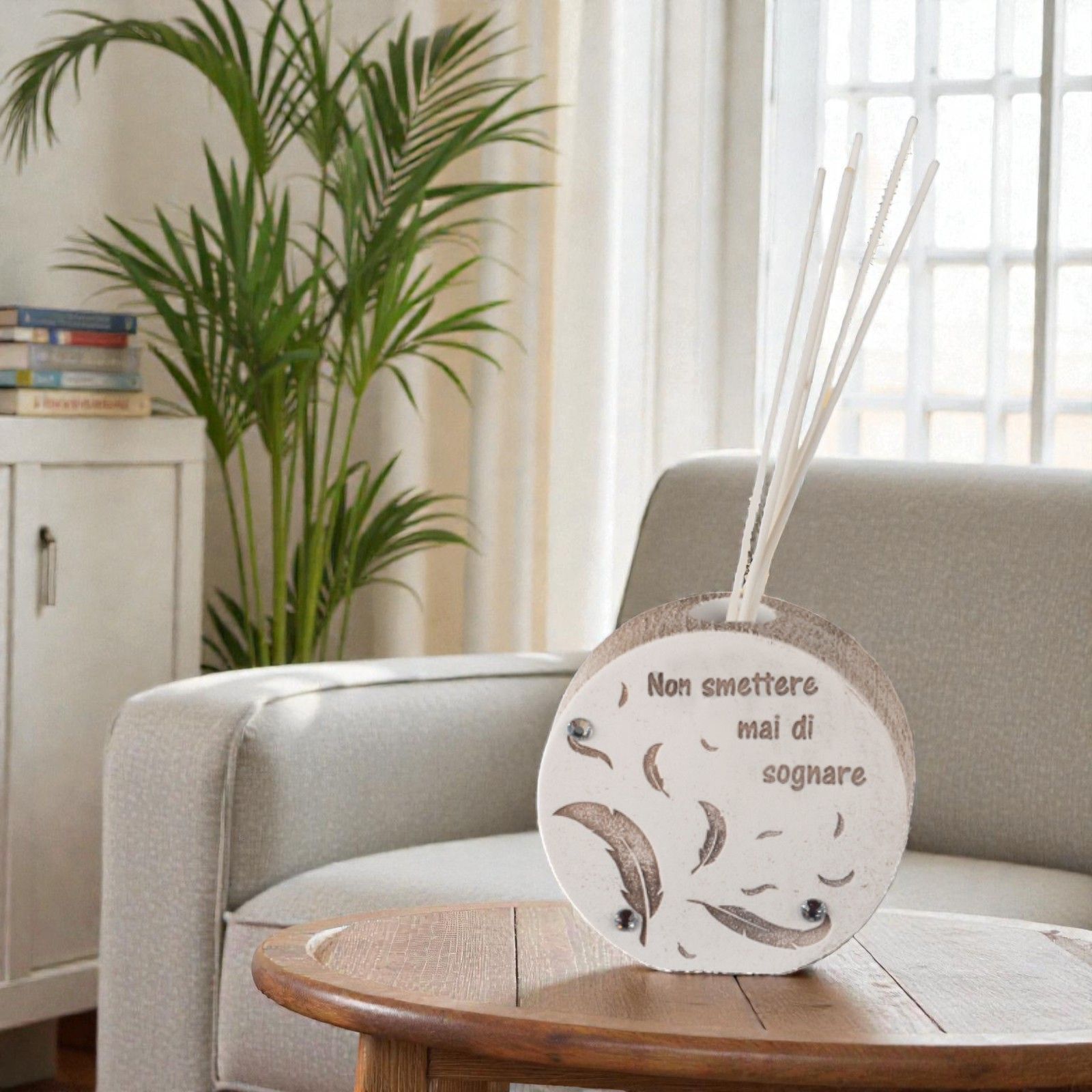 Realizzato in resina di alta qualità, il nostro diffusore tondo è decorato con piume incise di un delicato colore tortora e arricchito da tre scintillanti strass. La frase "Non smettere mai di sognare" è un dolce promemoria che accompagna chi lo riceve, trasformando ogni ambiente in un luogo di serenità e ispirazione. Con un pratico foro nella parte superiore, sarà semplice inserire la tua essenza preferita e diffondere un profumo che rievoca ricordi preziosi.