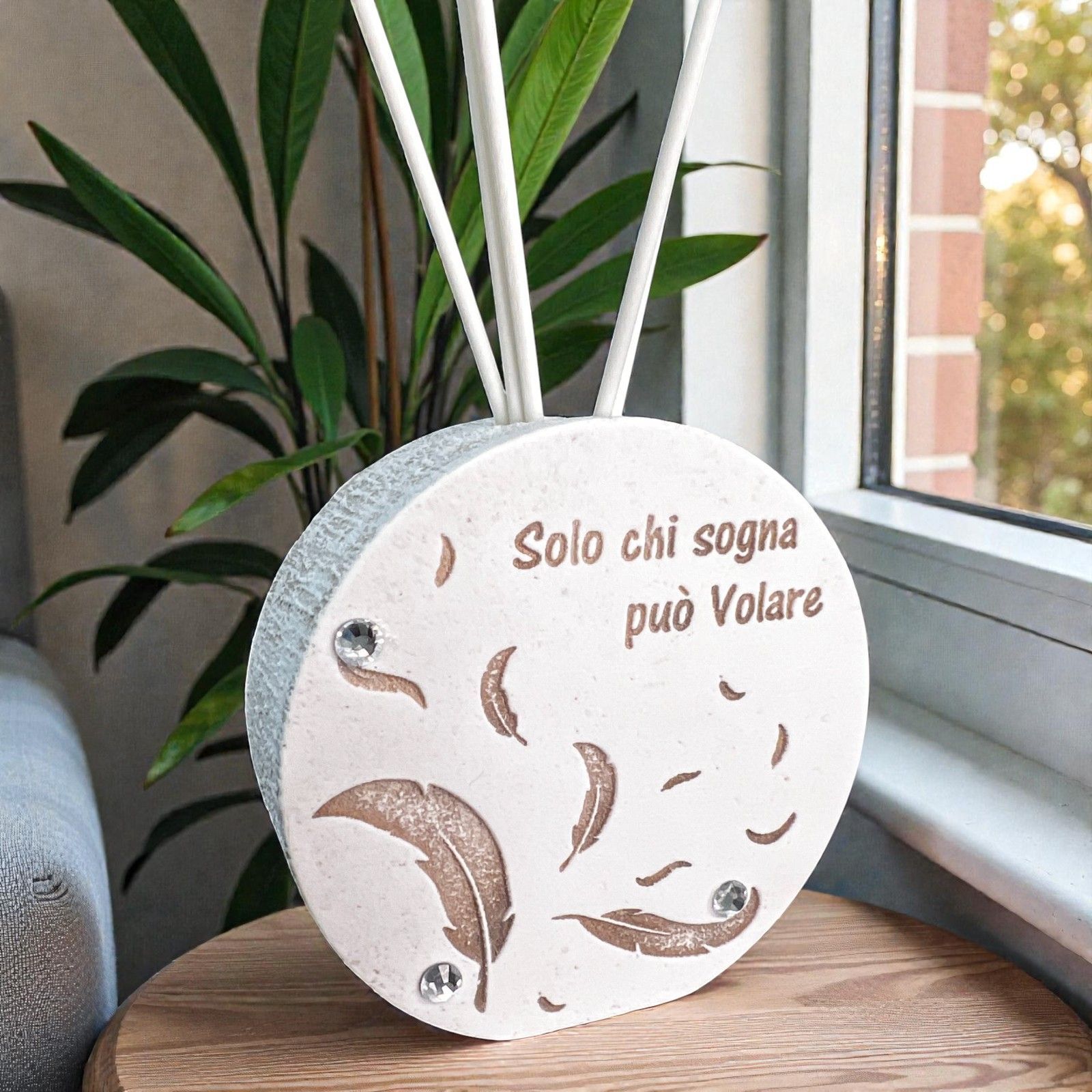 Scopri l'eleganza e la raffinatezza delle nostre bomboniere battesimo, perfette per celebrare i momenti più importanti della vita. Il profuma ambienti con strass e piume tondo è un regalo che non solo profuma, ma racconta anche una storia. La frase incisa "Solo chi sogna può volare" invita a sognare e a vivere ogni istante con gioia, rendendo questo oggetto un simbolo di speranza e felicità.