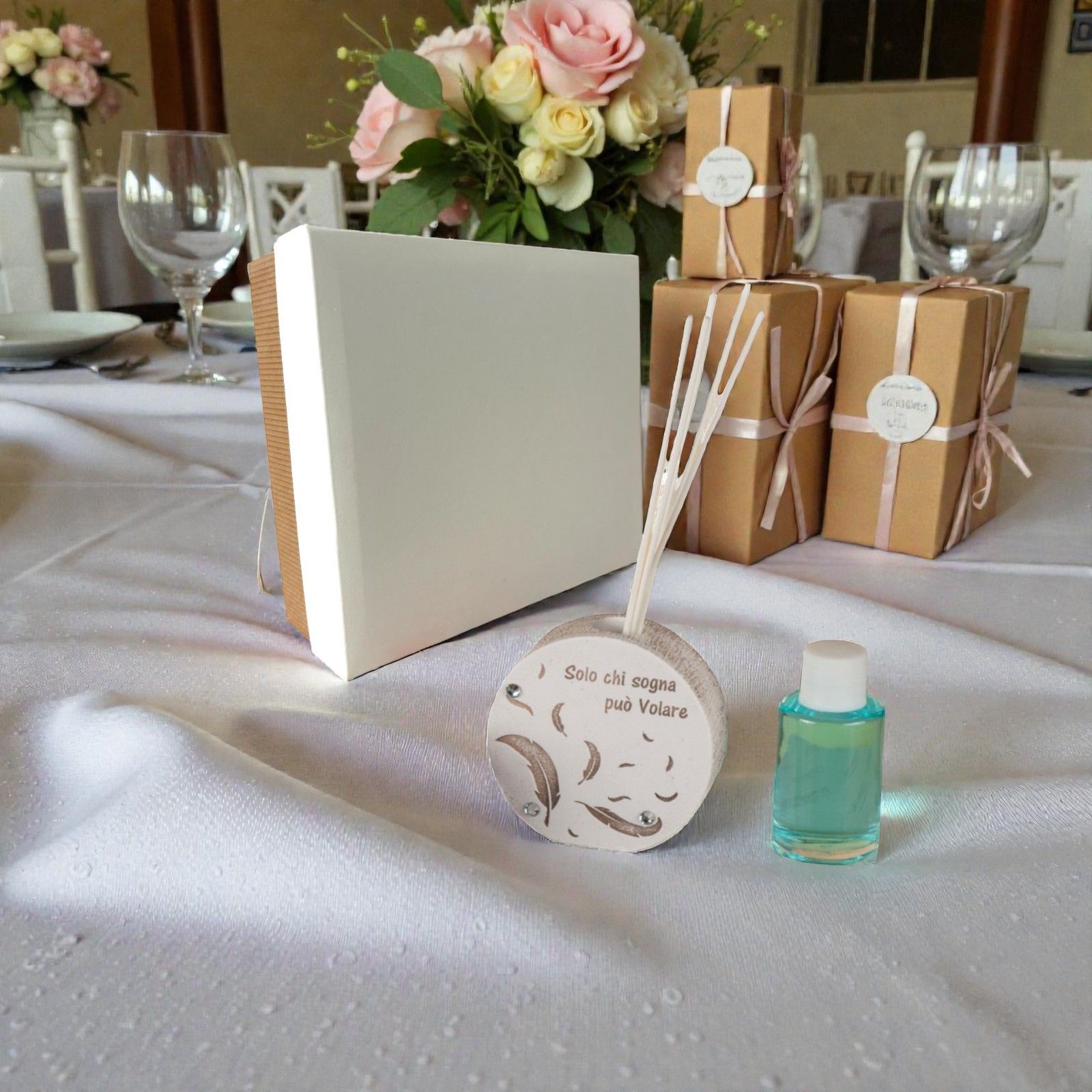 Ogni profumatore è fornito di scatola regalo, bastoncini ed essenza, tutto pensato per offrire un'esperienza completa e meravigliosa. Scegli la nostra bomboniera per un regalo che sarà apprezzato e custodito, un gesto che resterà nel cuore di chi lo riceve.