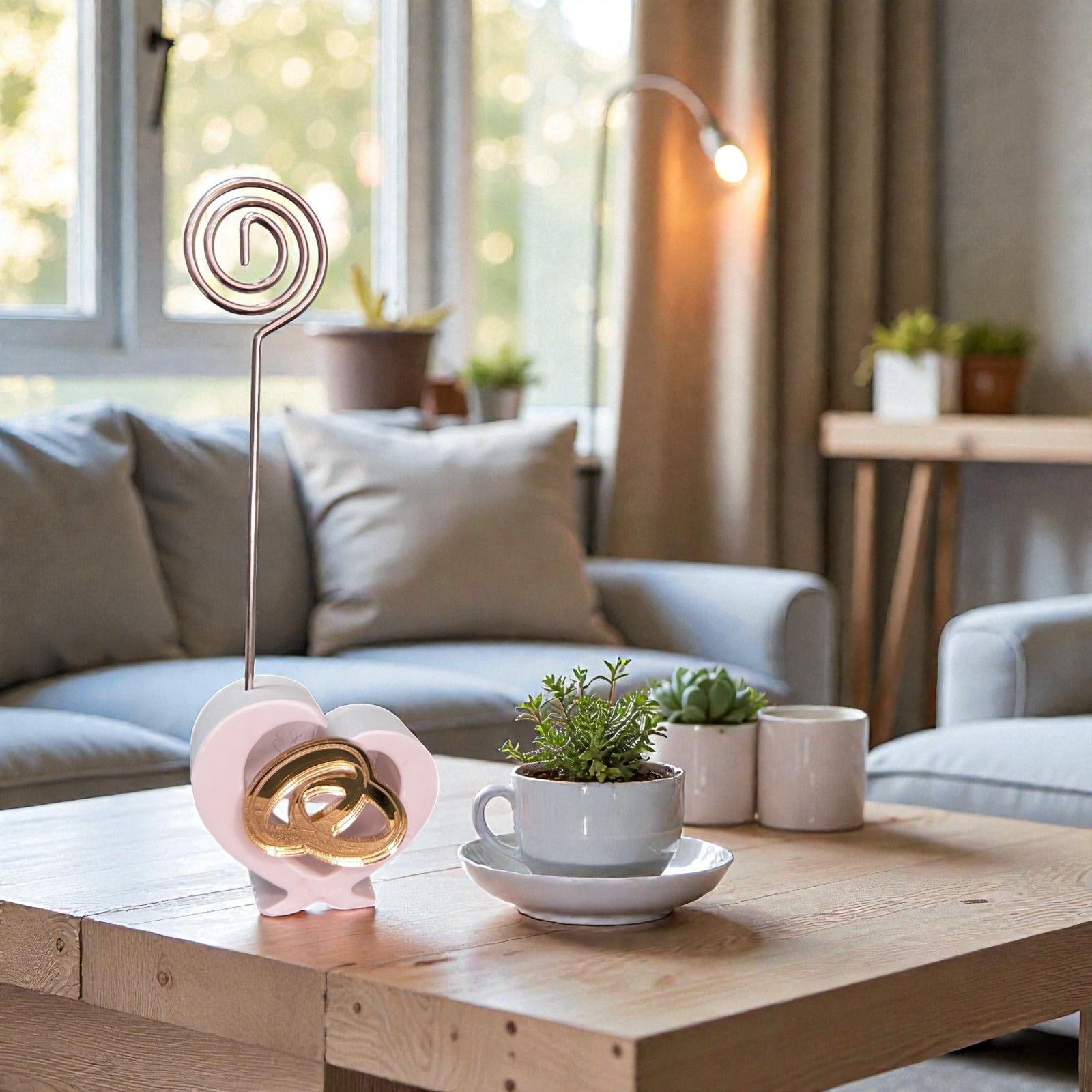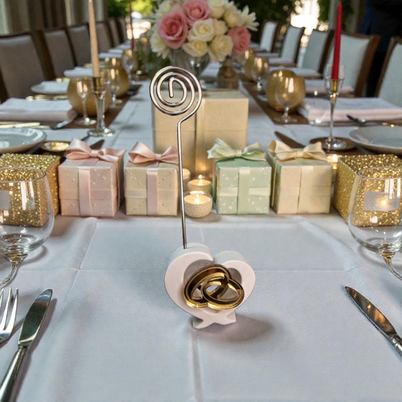 Realizzato in resina di alta qualità, questo delizioso segnaposto portamemo non è solo un elegante articolo decorativo, ma anche un modo per tenere viva la memoria degli attimi più belli. La sua asta in metallo a spirale permette di inserire una foto o un bigliettino personalizzato, mentre l'applicazione dorata in plexiglass, che rappresenta fedi intrecciate, simboleggia l'unione e l'amore eterno.