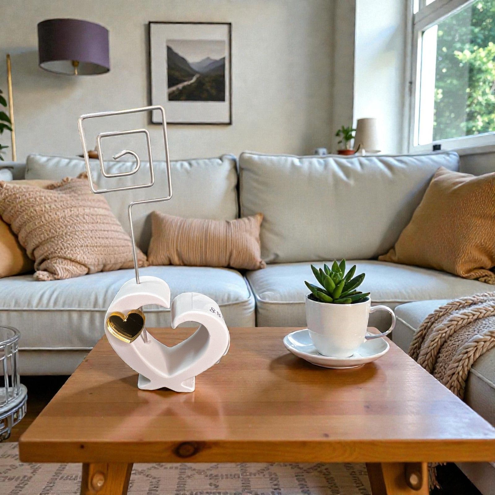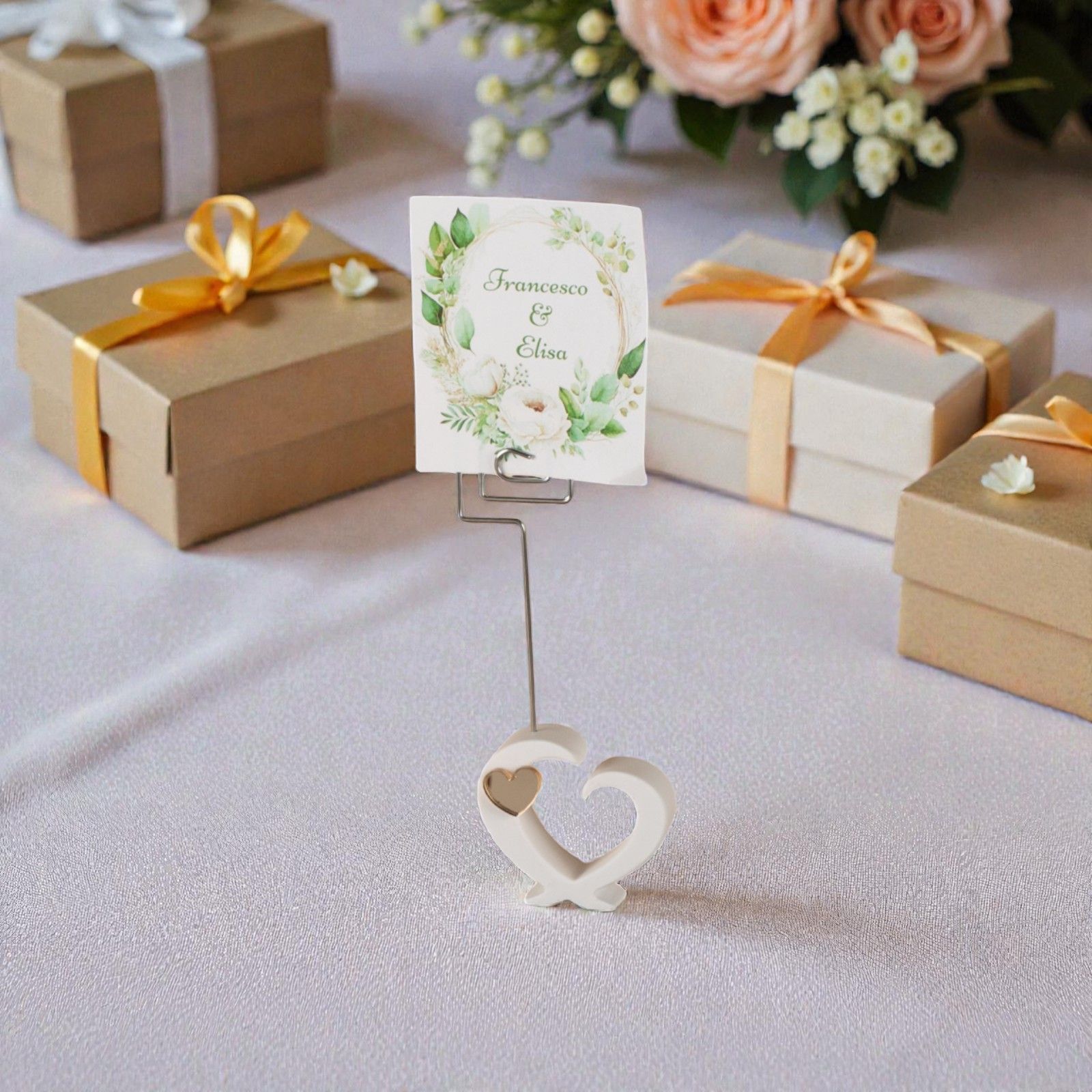 Realizzato in resina di alta qualità, il nostro segnaposto portamemo è decorato con un'applicazione dorata in plexiglass a forma di cuoricino, perfetta per esprimere la dolcezza di ogni momento condiviso. La pratica asta in metallo a spirale consente di inserire facilmente una foto o un bigliettino, rendendo questo prodotto un’ottima scelta per le bomboniere nozze o le bomboniere anniversario. Ogni dettaglio è pensato per suscitare emozioni e ricordi indelebili.