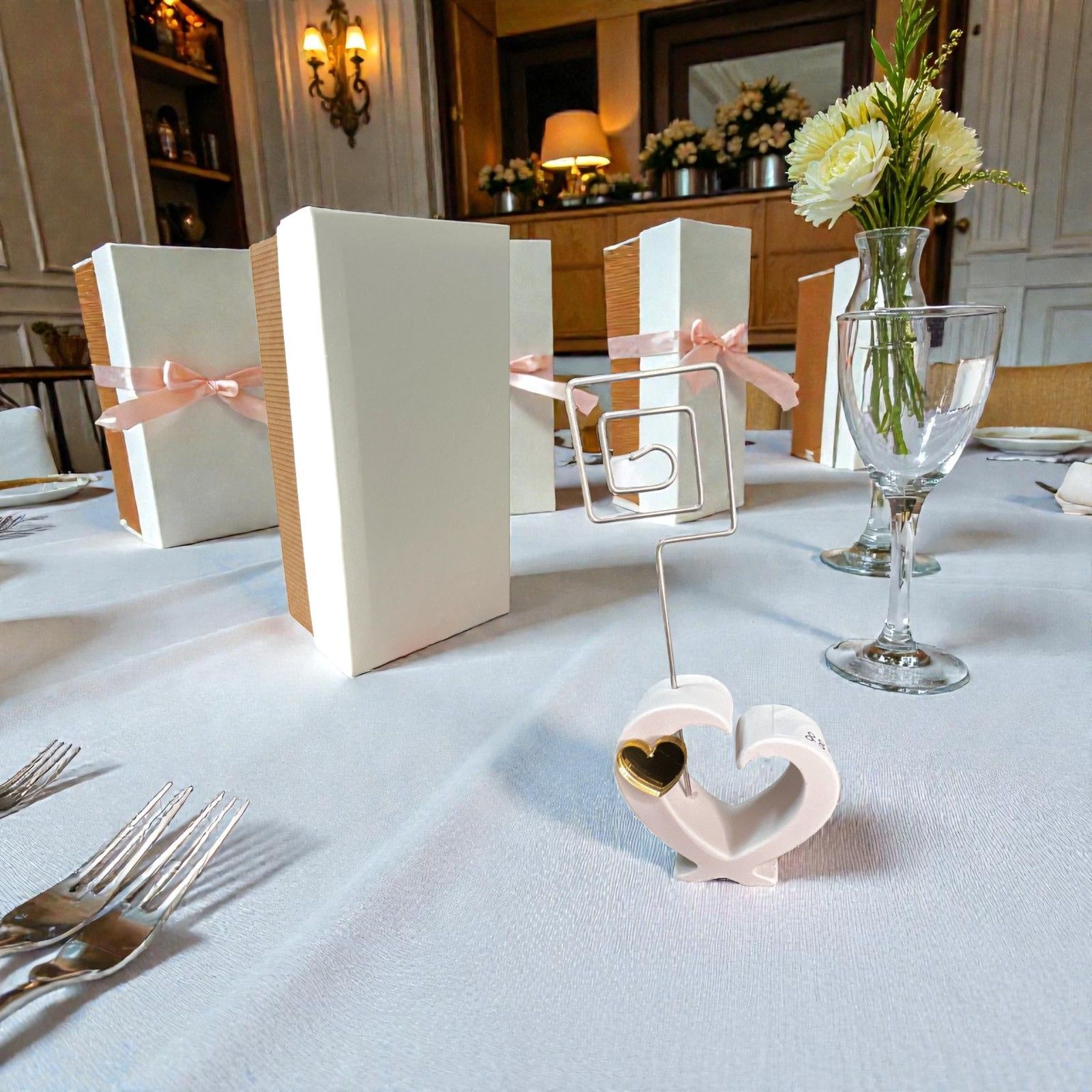 Rendi indimenticabili i tuoi eventi speciali con il nostro MemoClip a forma di cuore segnaposto. Questo delizioso portafoto non è solo un semplice accessorio, ma un simbolo d'amore e di affetto, ideale per matrimoni e anniversari. Con il suo design elegante e romantico, ogni tavola si trasformerà in un palcoscenico di emozioni, dove ogni sguardo sarà catturato dalla bellezza di questo omaggio prezioso.