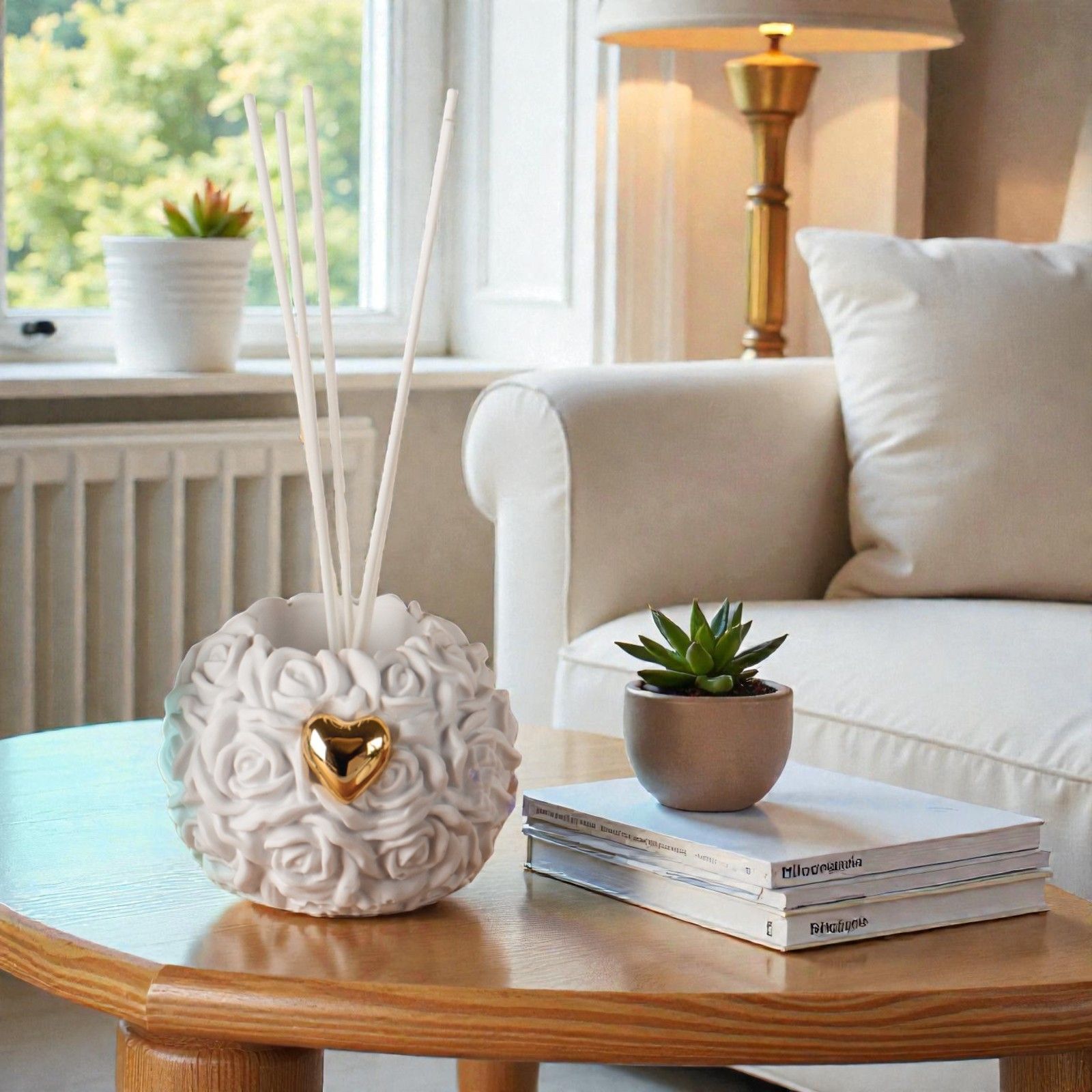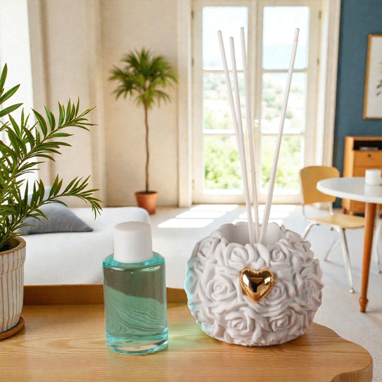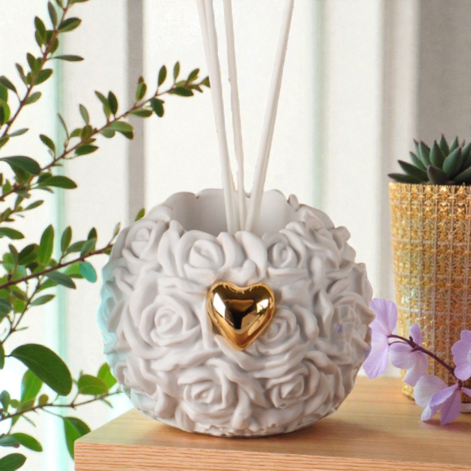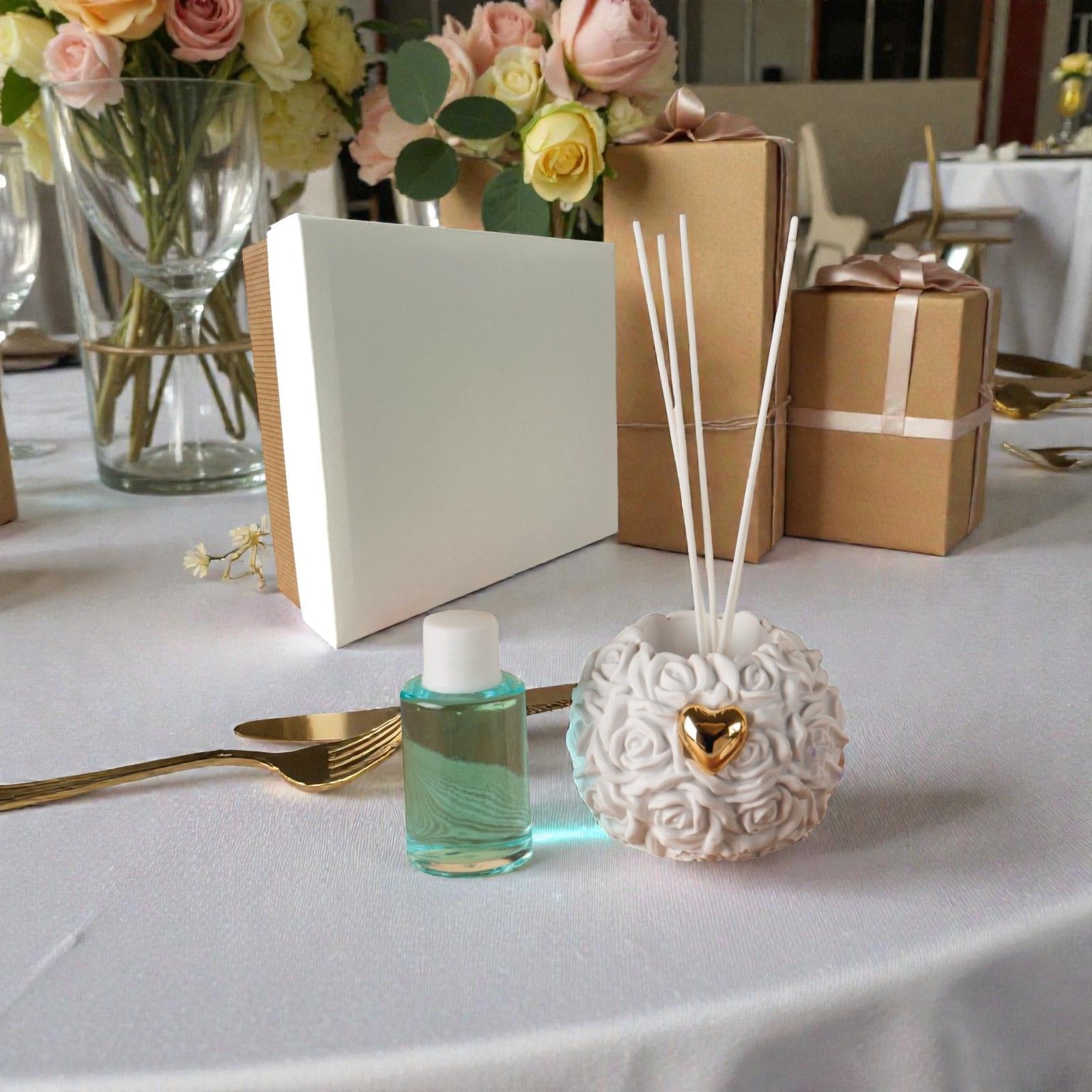 Scopri l'eleganza e la raffinatezza del nostro profumatore bianco con rose, un'idea regalo perfetta per le tue bomboniere comunione, nozze e anniversari. Ogni dettaglio di questo diffusore è pensato per trasmettere un'emozione: le rose in rilievo e il cuore dorato al centro simboleggiano l'amore e la gioia di condividere momenti speciali con le persone più care. Regalare questo profumatore significa donare un'esperienza sensoriale che ricorderà per sempre i momenti di felicità.
