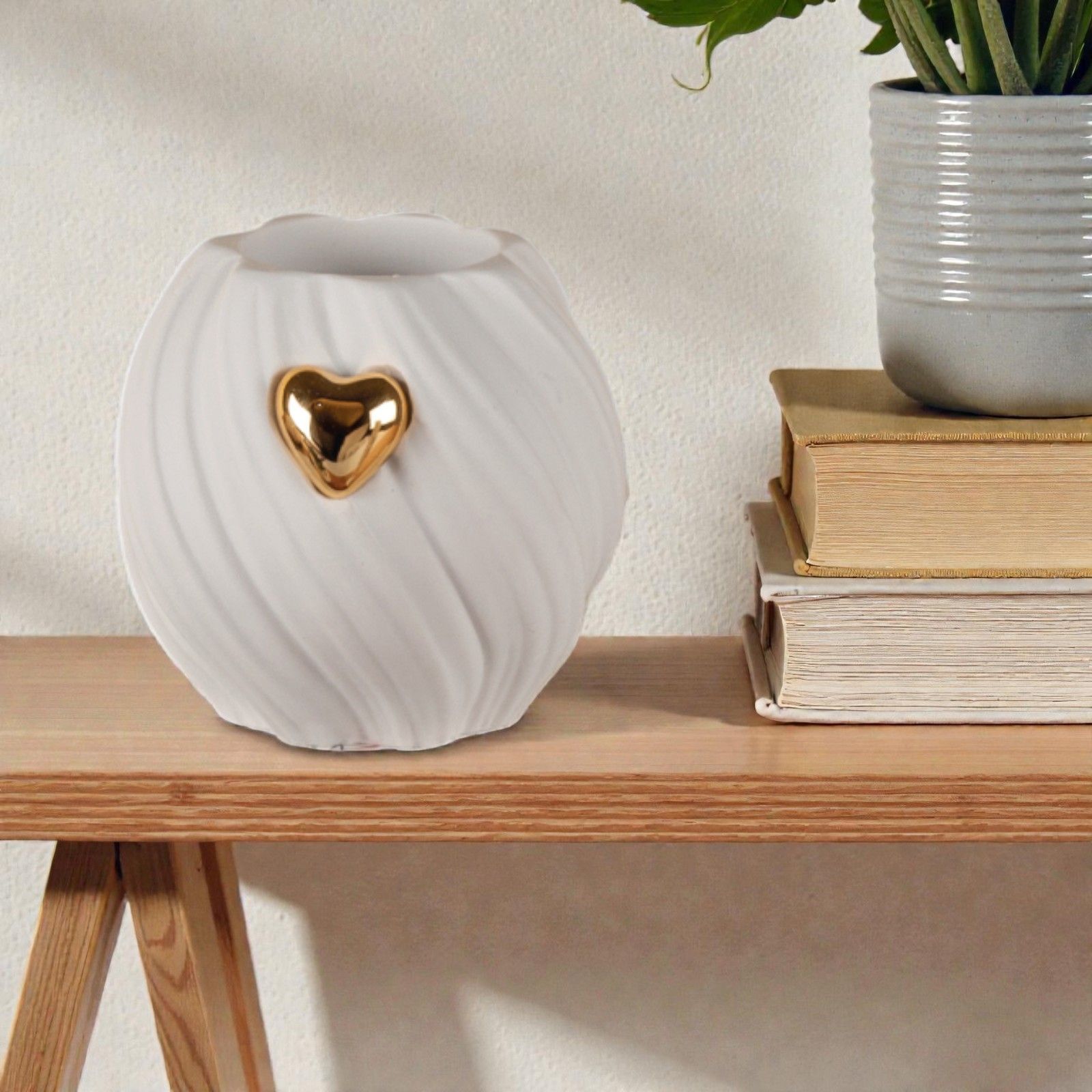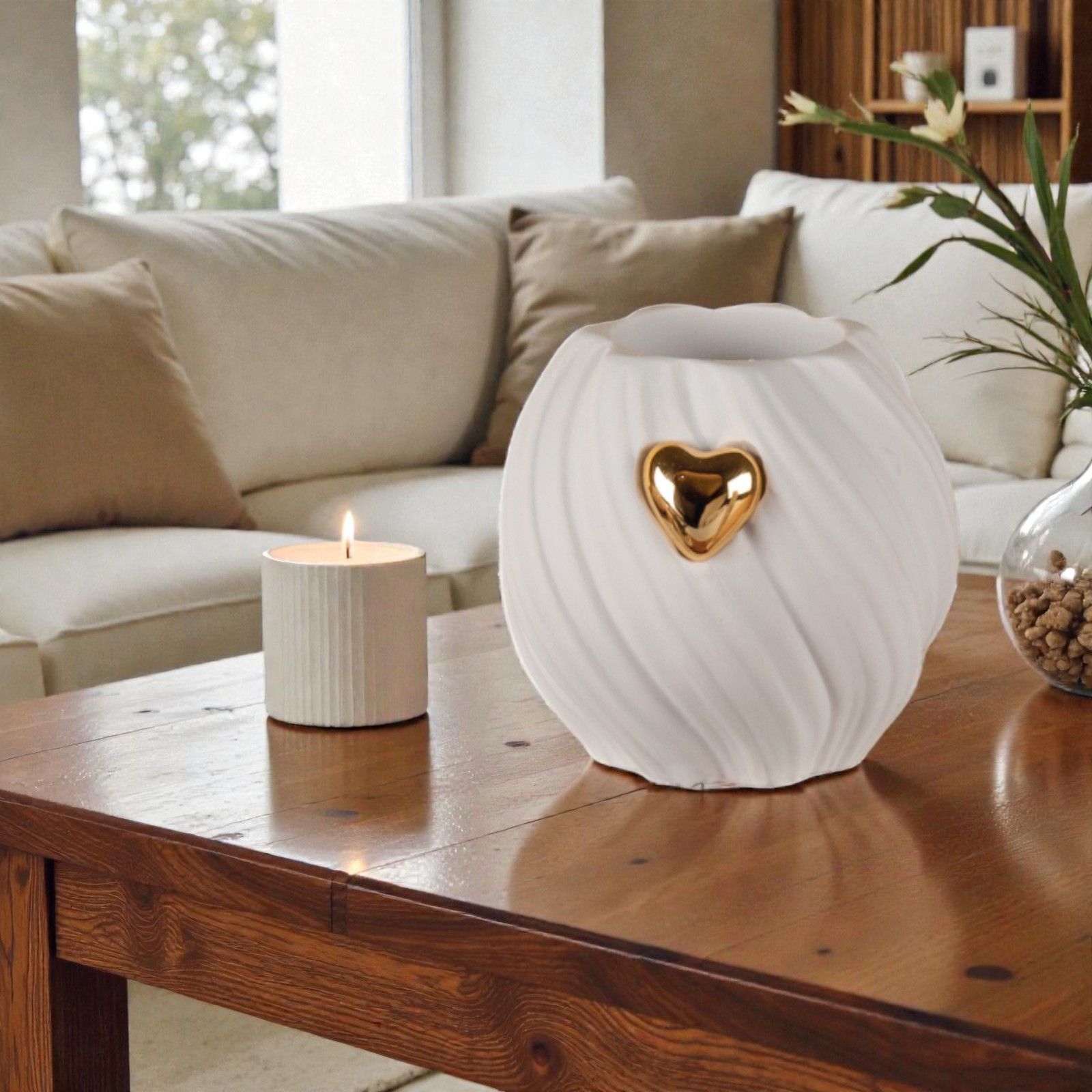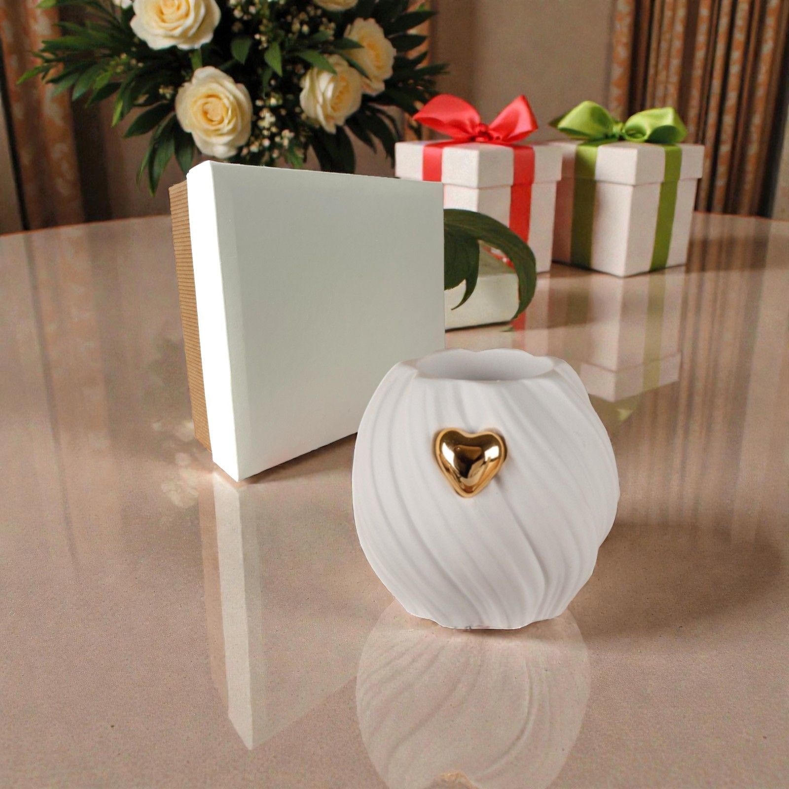 Realizzato in resina di alta qualità e proposto in un elegante colore bianco, questo porta candela è accompagnato da un cuore dorato specchiato al centro, simbolo di amore e unità. Perfetto per ospitare una tea light (non inclusa), questo accessorio non è solo un elemento decorativo, ma un vero e proprio portatore di emozioni, capace di illuminare i ricordi e i legami più preziosi.