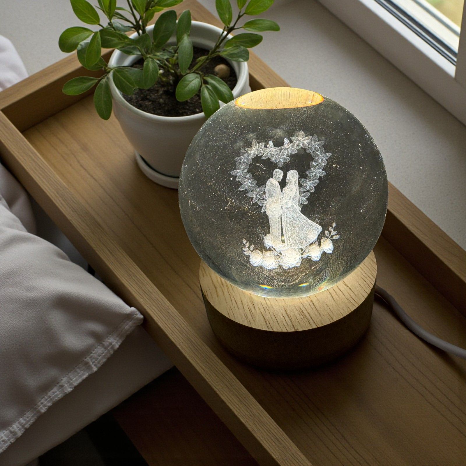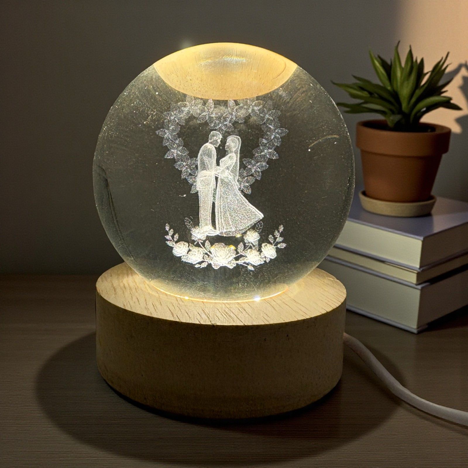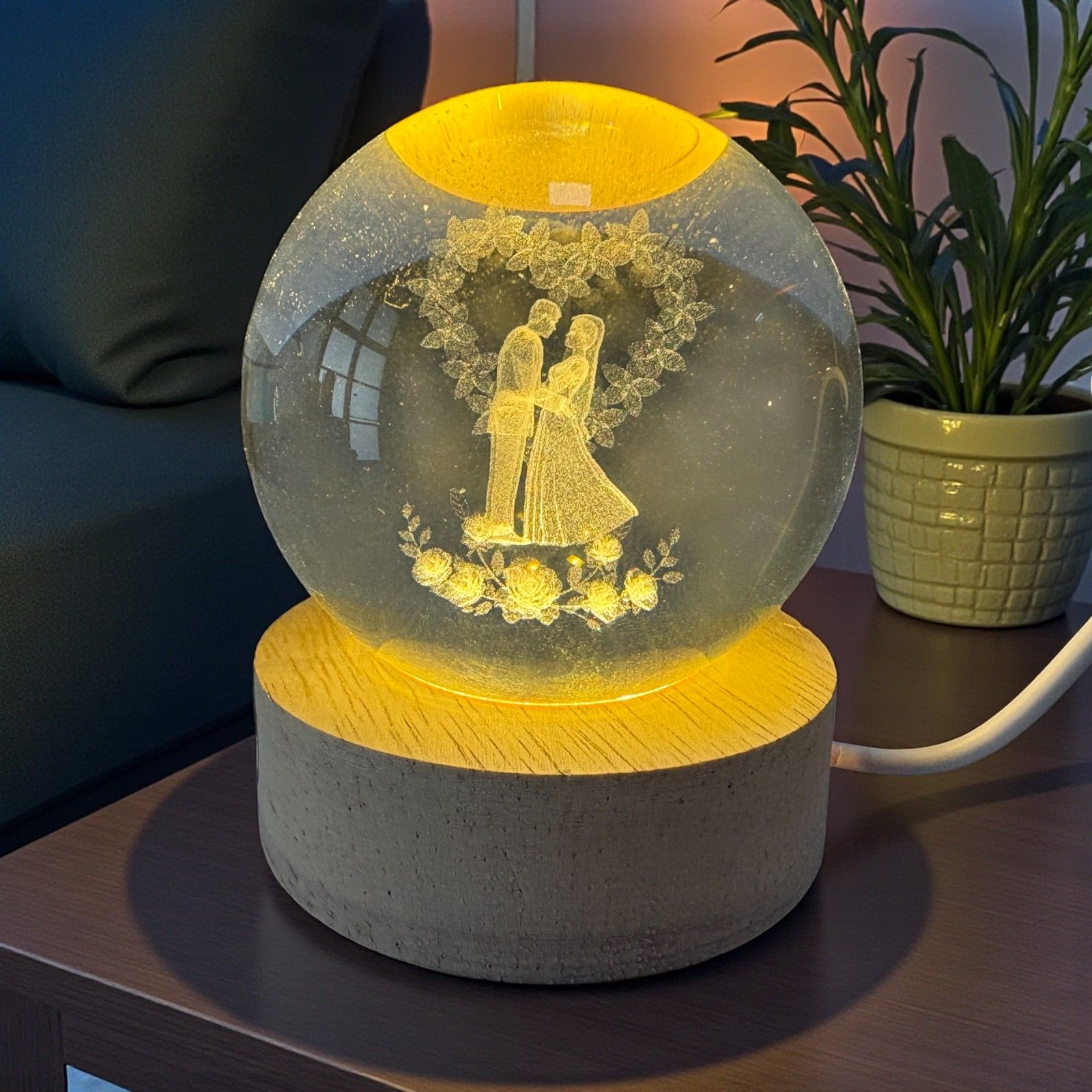Rendi indimenticabile il tuo evento con una bomboniera che unisce eleganza e romanticismo. Questa lampada led a sfera mostra all’interno l’immagine degli sposi abbracciati grazie a un modulo led nascosto nella base in legno, che illumina delicatamente la sfera e fa emergere in chiaro ogni dettaglio della coppia, trasformando il ricordo del tuo matrimonio in un’emozione unica.