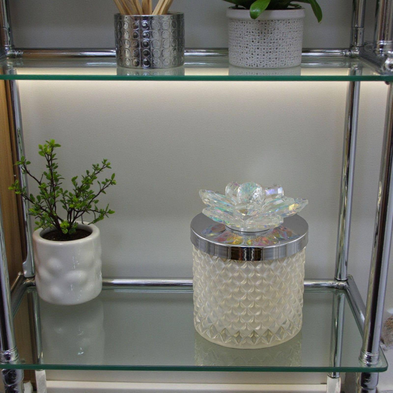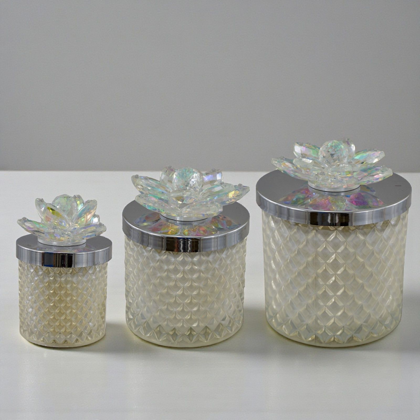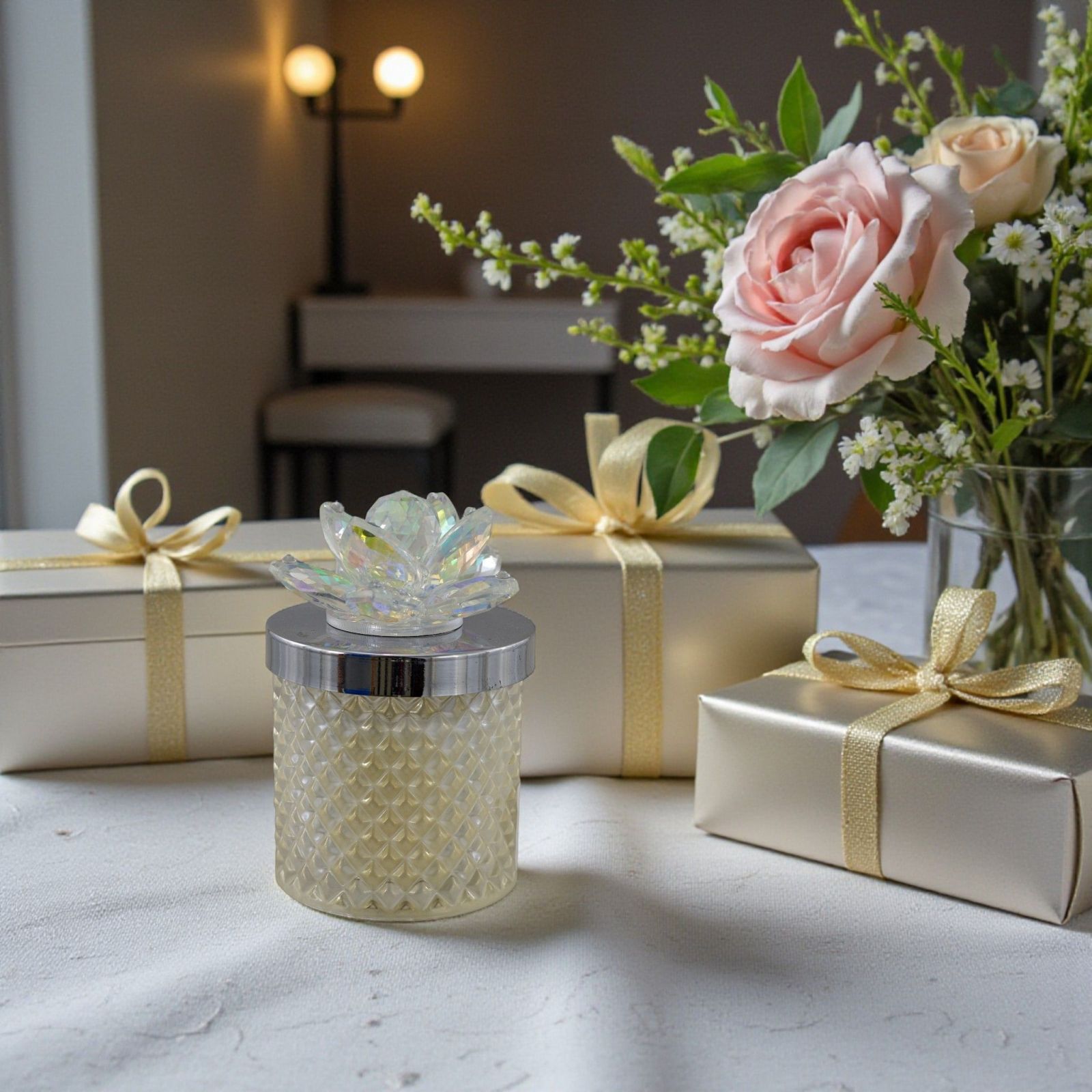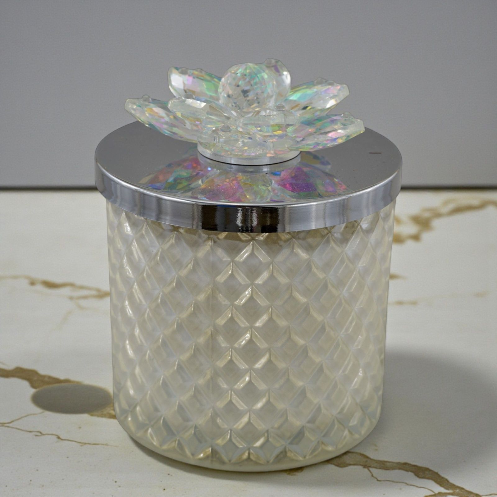 Scopri il fascino senza tempo delle nostre bomboniere con il Portacandela in vetro diamantato, arricchito da un delicato fiore in Swarovski sul coperchio. Questo elegante accessorio non è solo una semplice bomboniera, ma un simbolo di amore e affetto, perfetto per rendere indimenticabili momenti come matrimoni e anniversari. Ogni portacandela è un'opera d'arte che cattura la luce e l'attenzione, regalando calore e bellezza a ogni occasione.