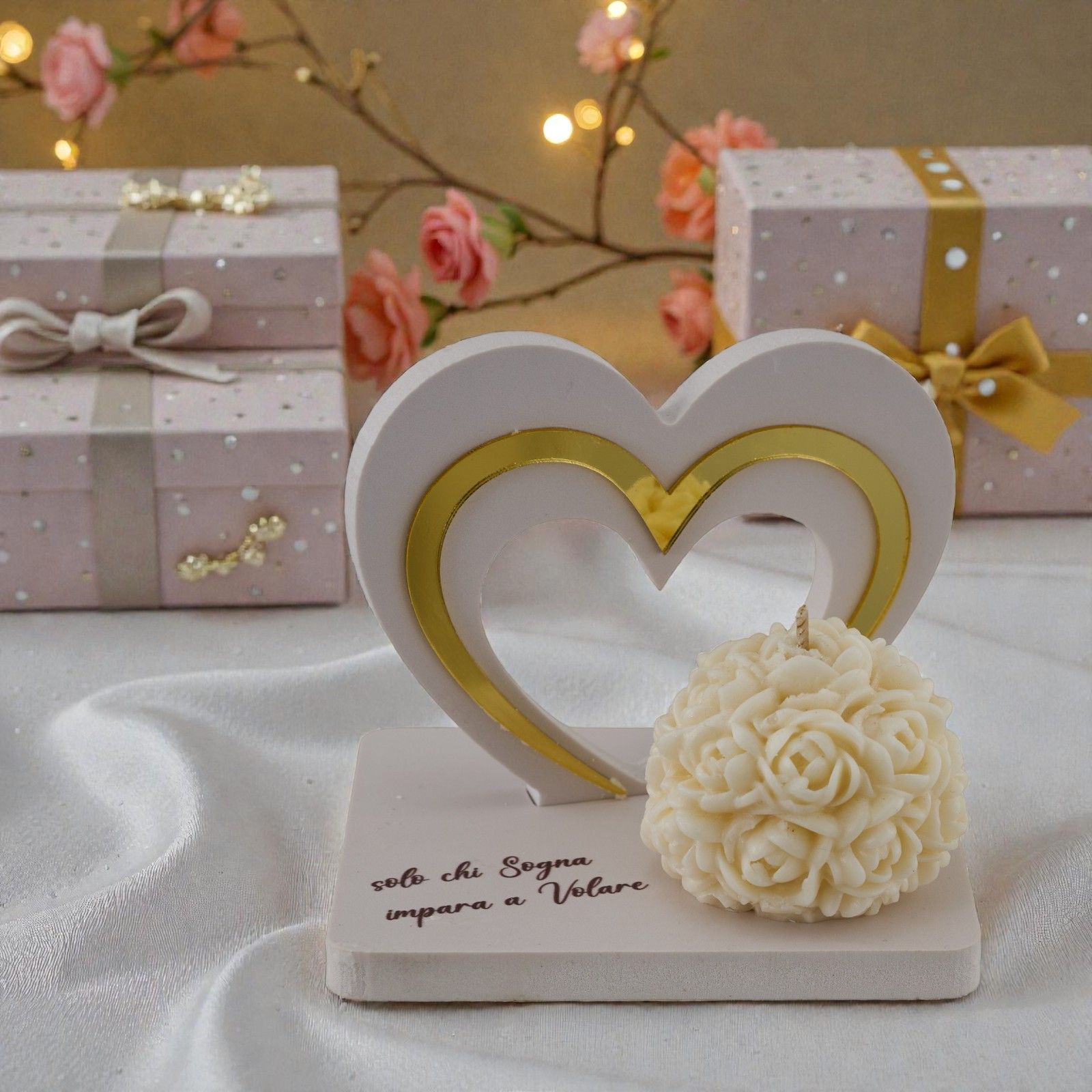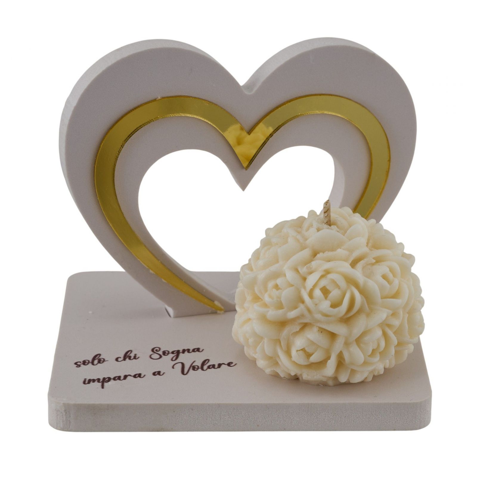 Dona un tocco di poesia ai tuoi momenti più preziosi con la nostra incantevole bomboniera artigianale: una raffinata candela con rose e un cuore stilizzato, ornata dalla frase poetica "Solo chi sogna impara a volare". Questa bomboniera non è solo un elemento decorativo, ma un simbolo di amore e SFERAnza, perfetto per celebrare momenti straordinari come matrimoni e anniversari. Ogni volta che accenderete questa candela, vi ricorderà l'importanza di inseguire i propri sogni insieme.