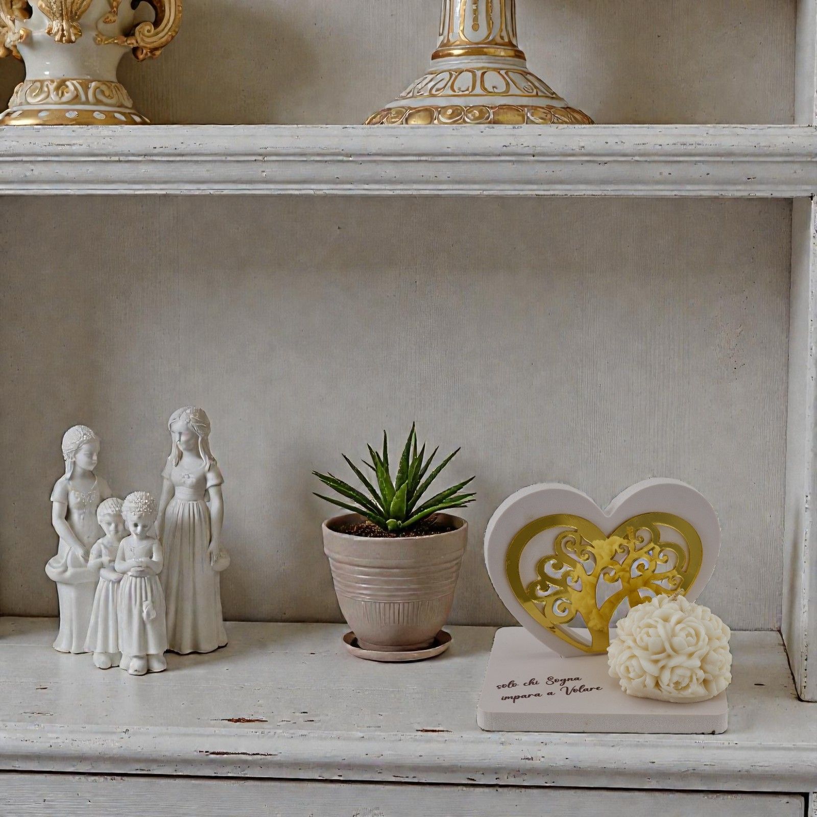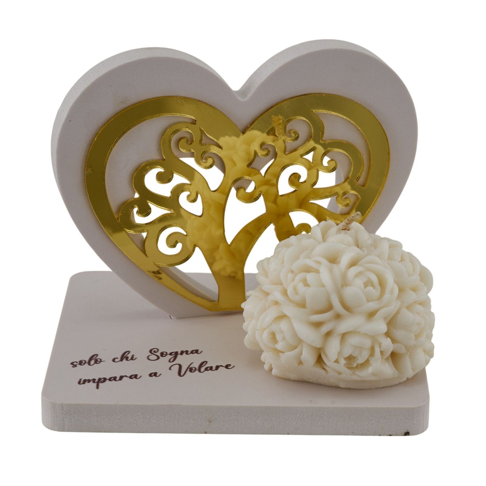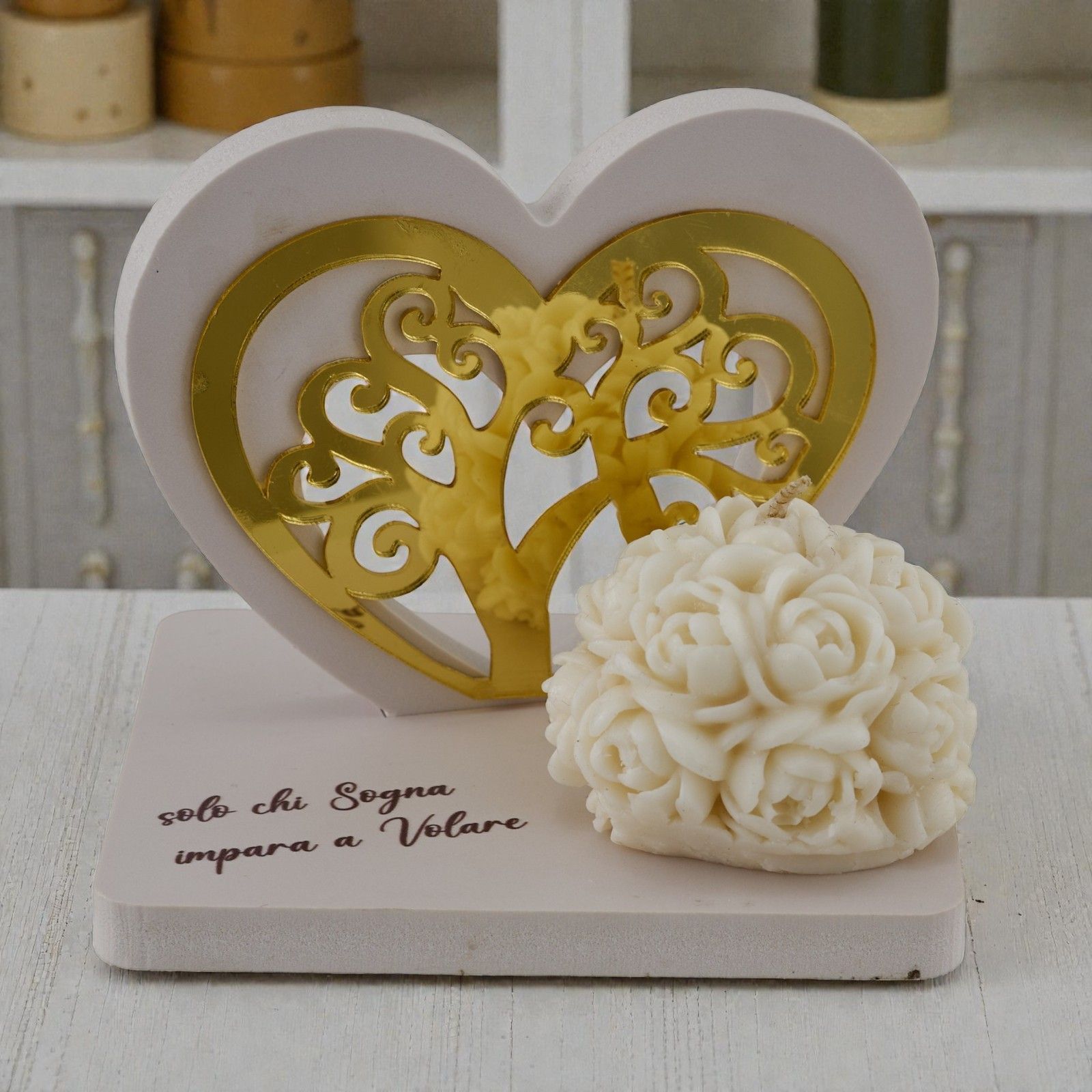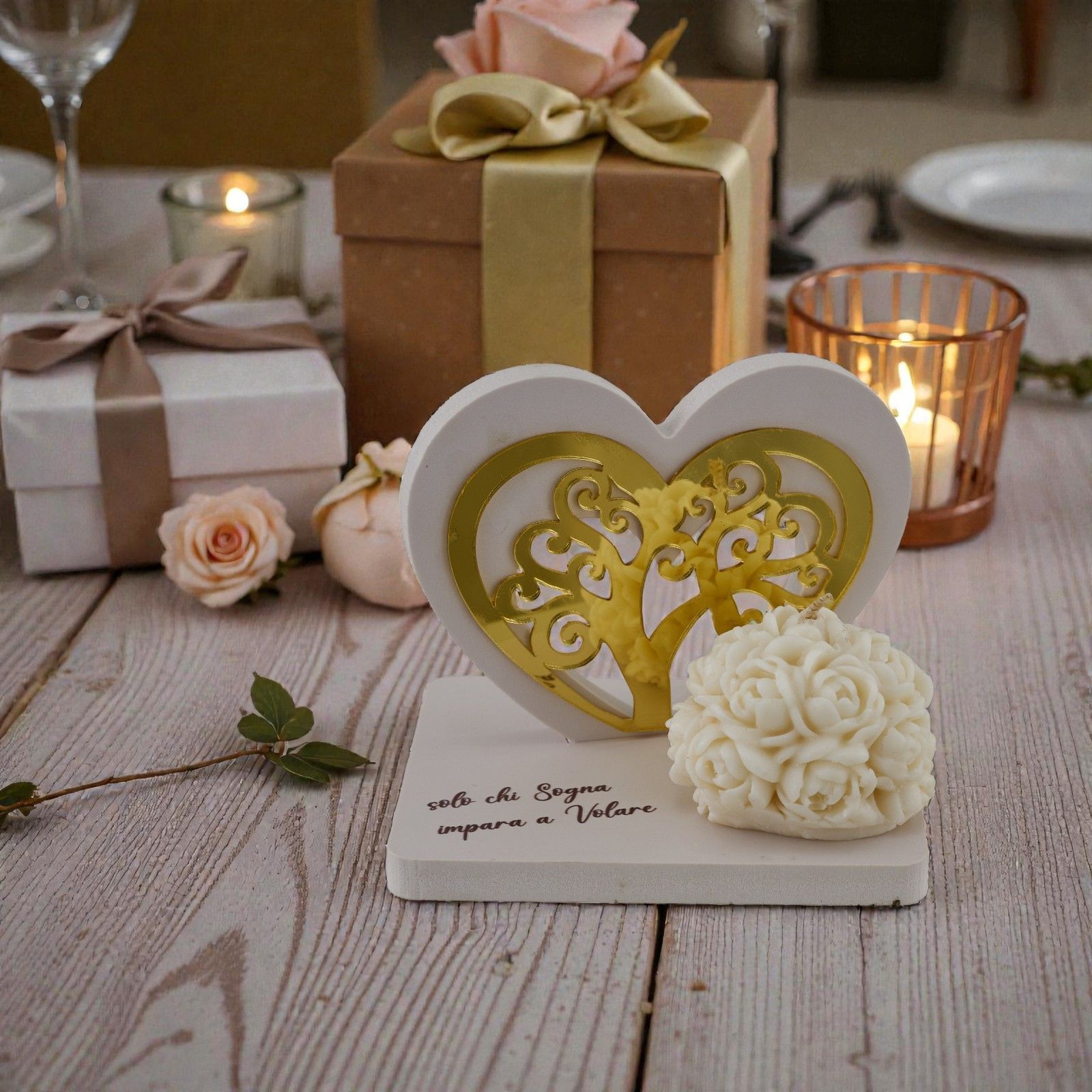 Ispirata al simbolo eterno della vita che cresce e si intreccia, questa elegante candela con albero della vita, rose e cuore stilizzato è arricchita dalla frase “solo chi sogna impara a volare”, diventando una raffinata bomboniera artigianale da donare agli invitati di matrimoni e anniversari come segno di gratitudine e amore condiviso.