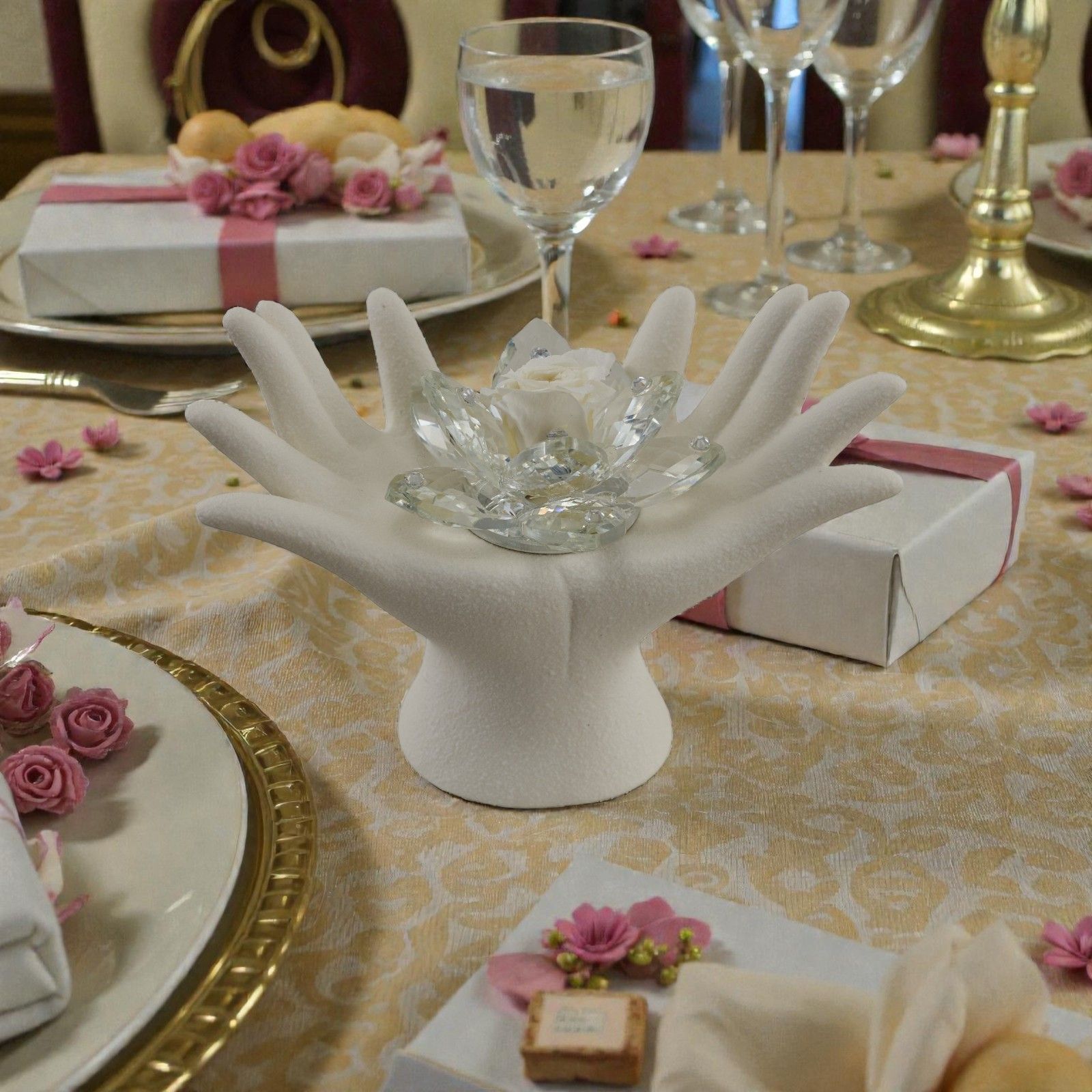 Rendi ogni momento speciale con la nostra elegante bomboniera "Mani Unite con Fiore in Swarovski e Rosa Bianca". Questo raffinato oggetto è un simbolo di amore e unione, perfetto per celebrare matrimoni e anniversari. Rappresenta l'essenza delle emozioni condivise, trasformando ogni celebrazione in un ricordo indelebile.