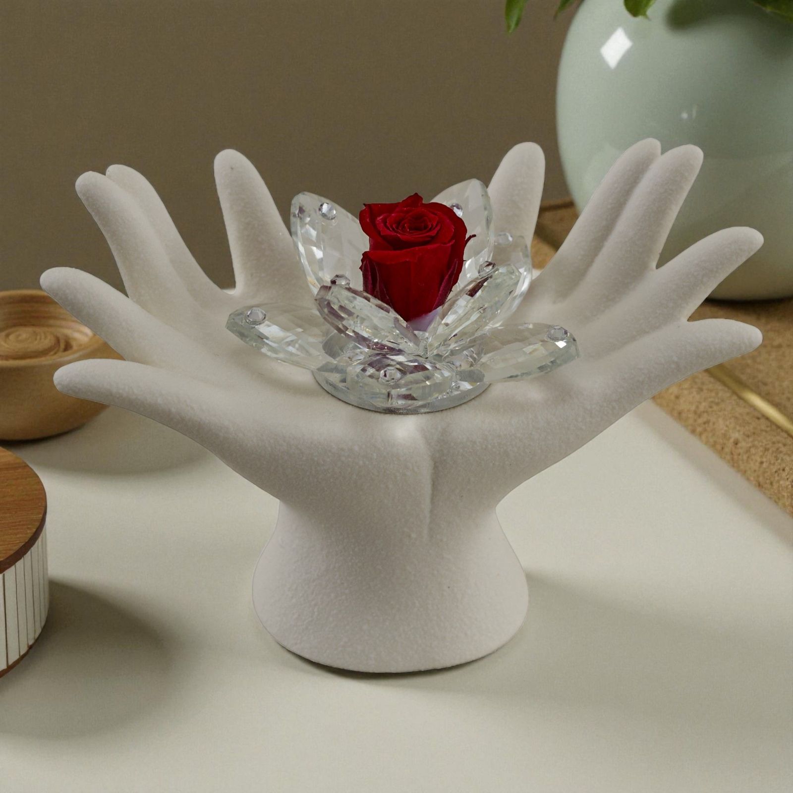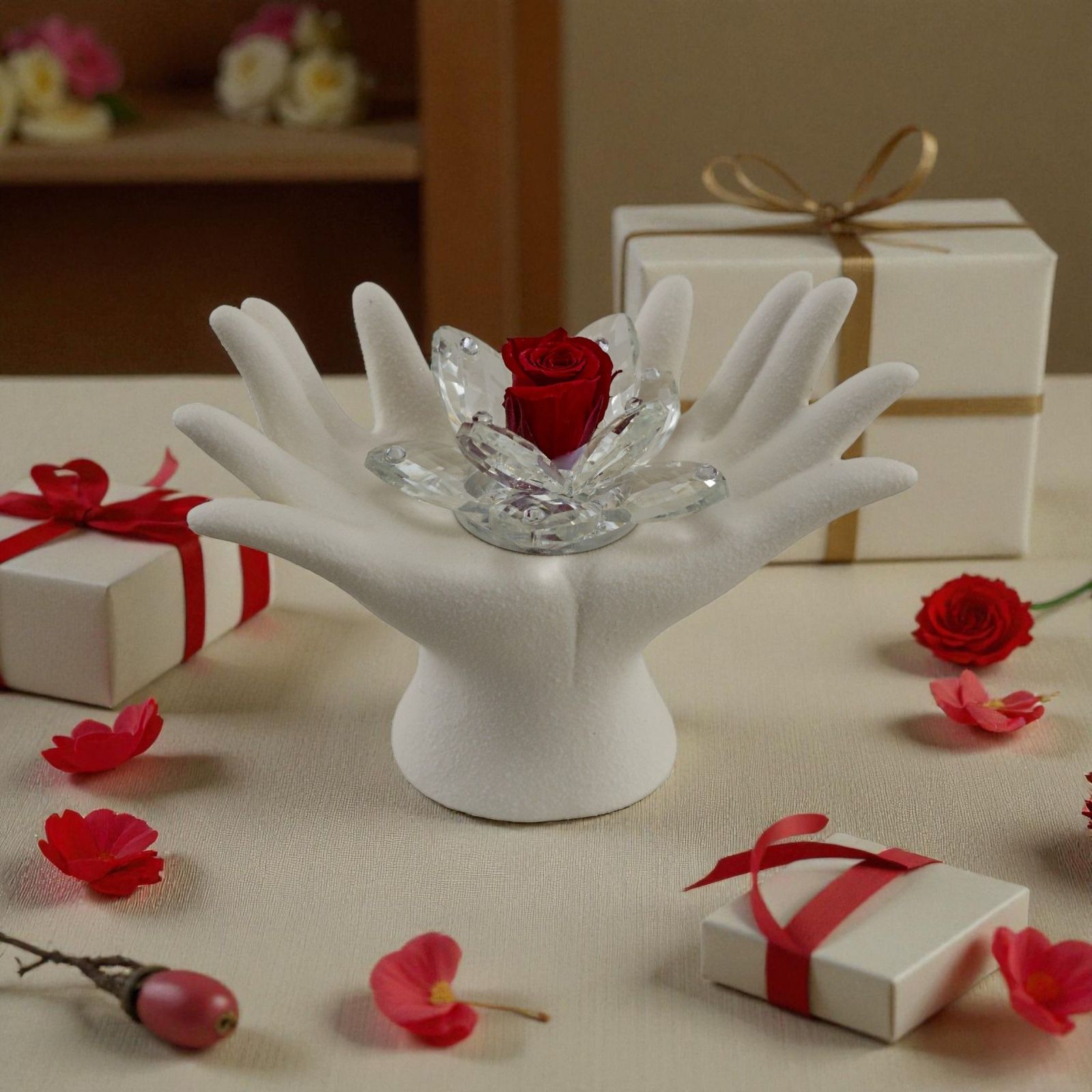 Racchiudi il significato più profondo dell’amore in una bomboniera dal forte impatto emozionale. Le mani unite sorreggono un fiore impreziosito da Swarovski e una delicata rosa rossa, simboli di unione, passione e promessa eterna, rendendo questa creazione una scelta raffinata tra le bomboniere originali per matrimonio e anniversario.