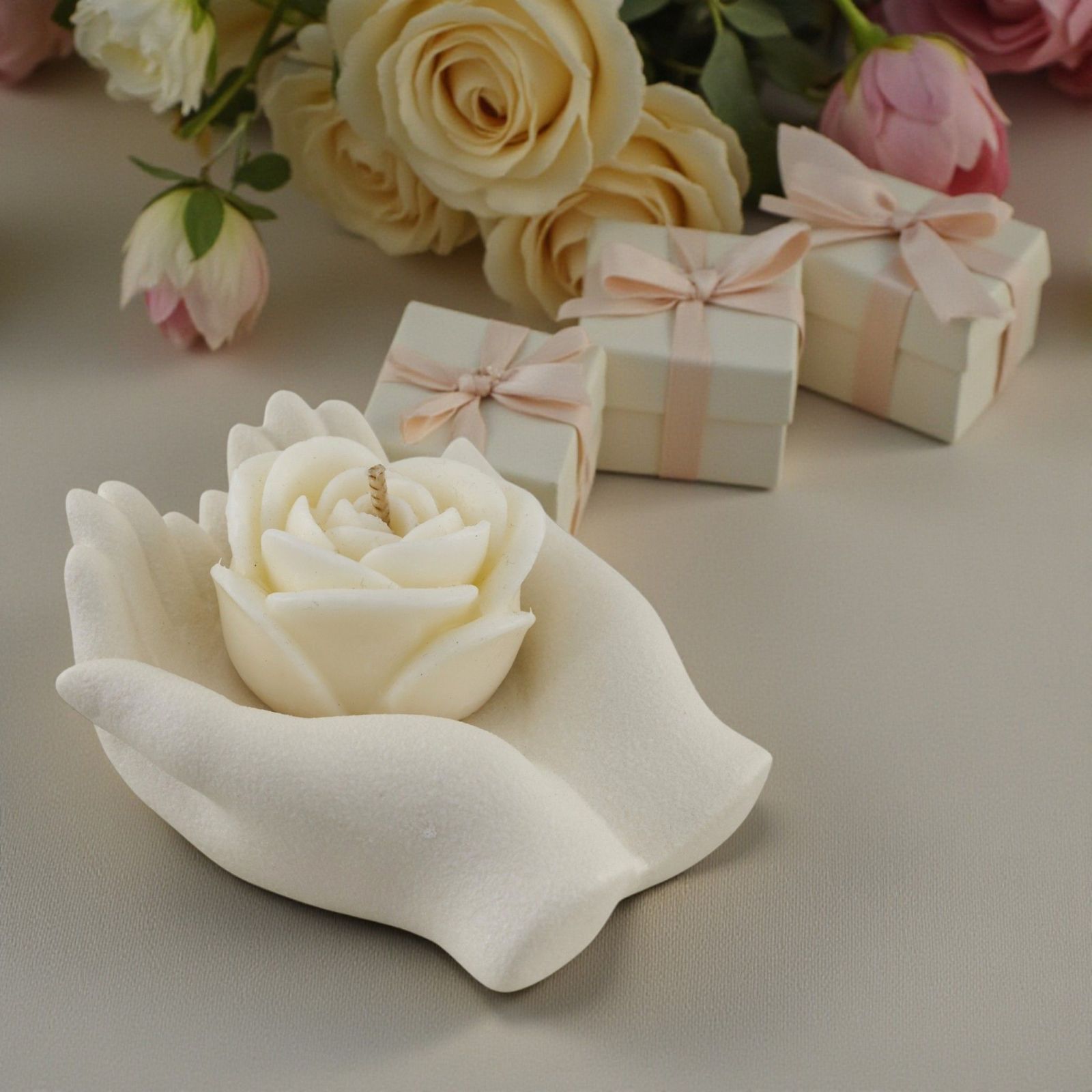 Sorprendi i tuoi invitati con una bomboniera che unisce eleganza e dolcezza. La mano che regge una candela a forma di rosa diventa un simbolo di cura e affetto, perfetta da donare durante comunioni e matrimoni, lasciando un ricordo speciale del tuo giorno indimenticabile.