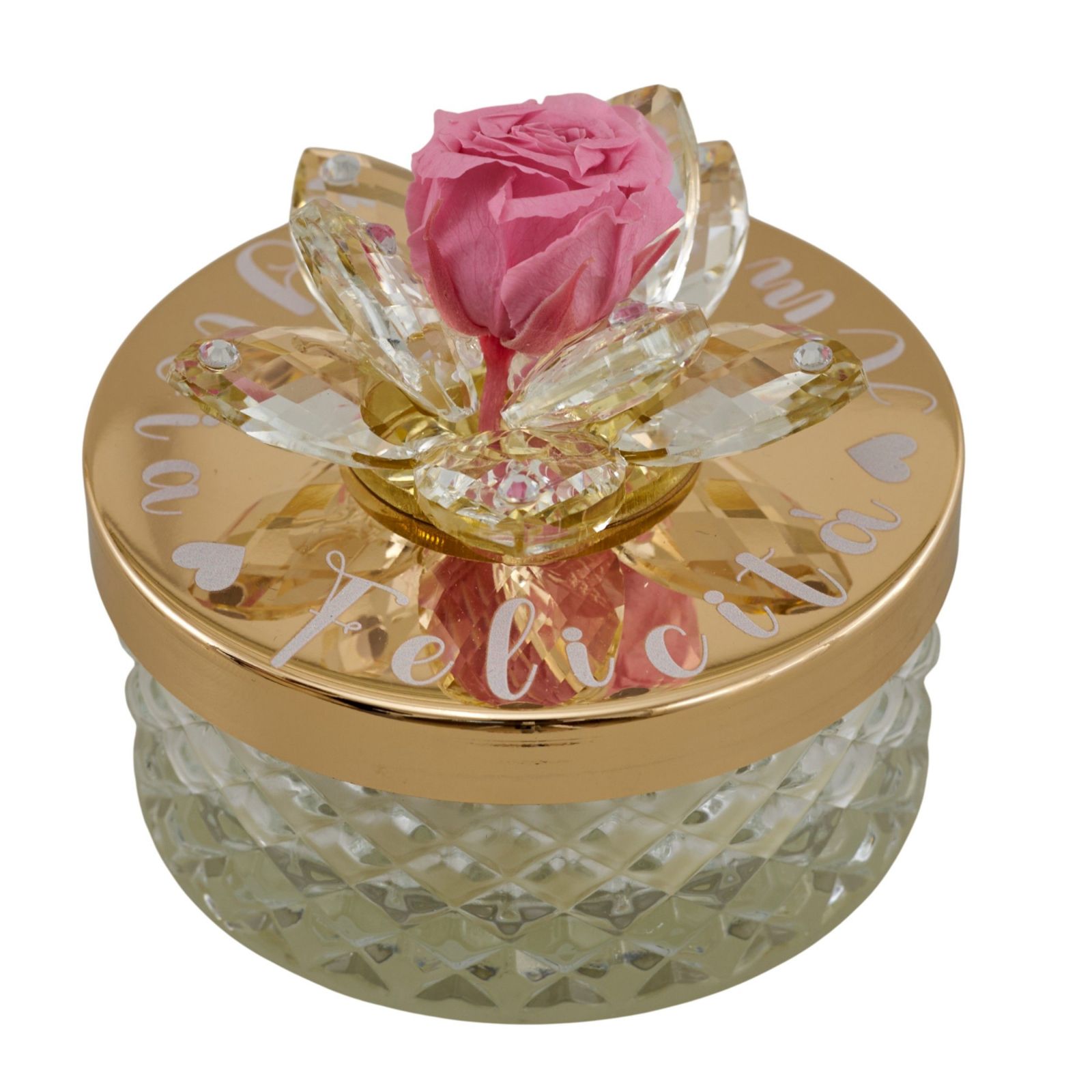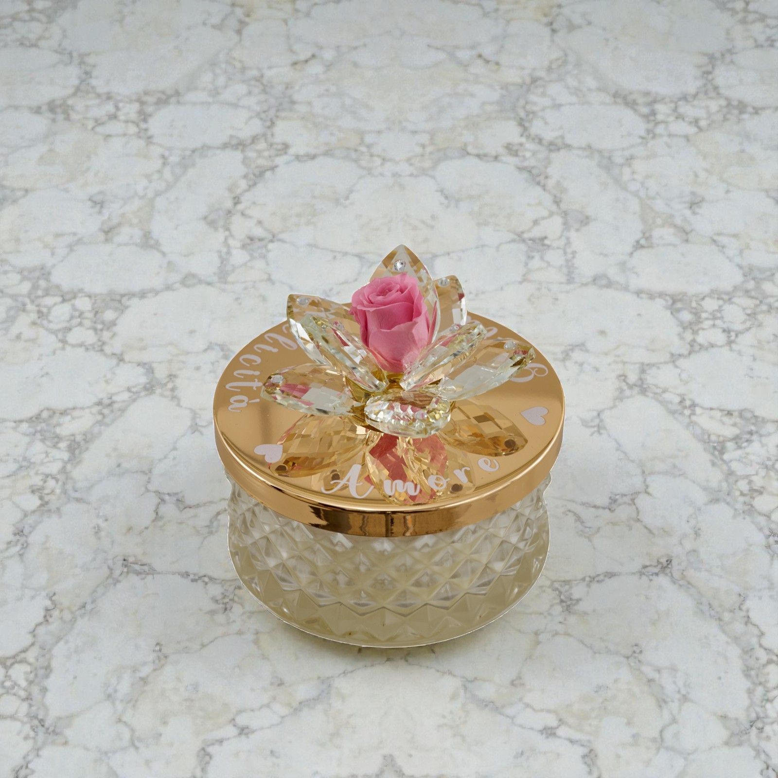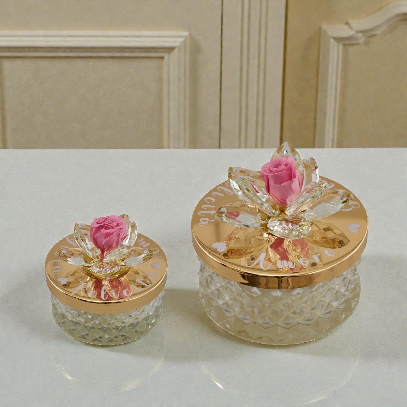 Regala un sorriso ai tuoi invitati con questa splendida bomboniera: un portacandela in vetro diamantato decorato con un fiore in Swarovski e un delicato bocciolo rosa sul coperchio oro. Un piccolo lusso che farà sentire speciali tutti i tuoi ospiti durante il matrimonio o l’anniversario.