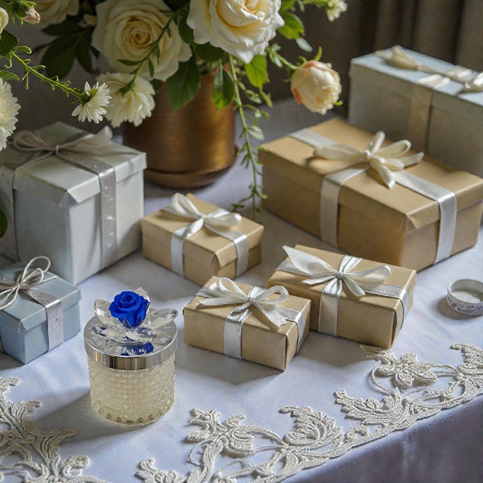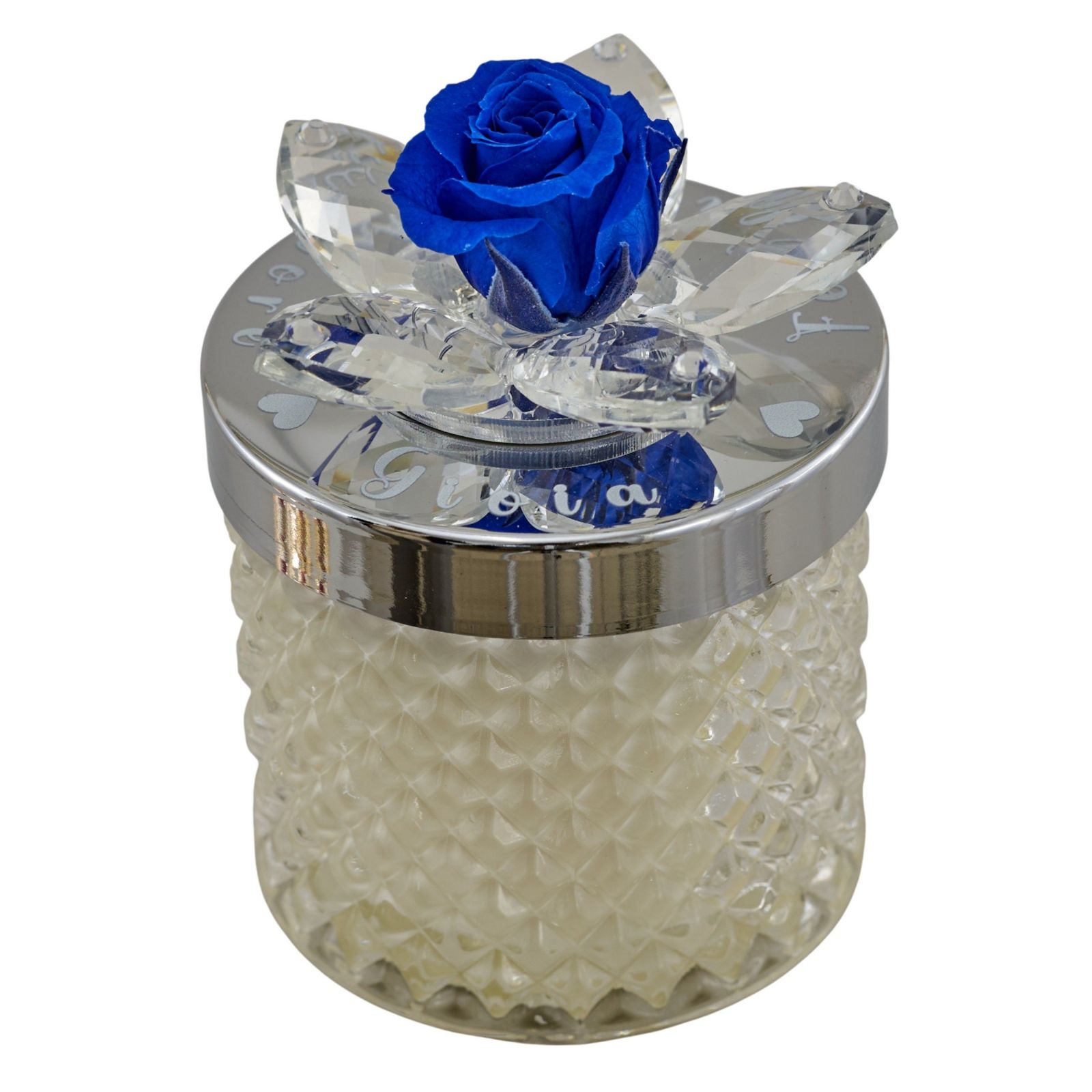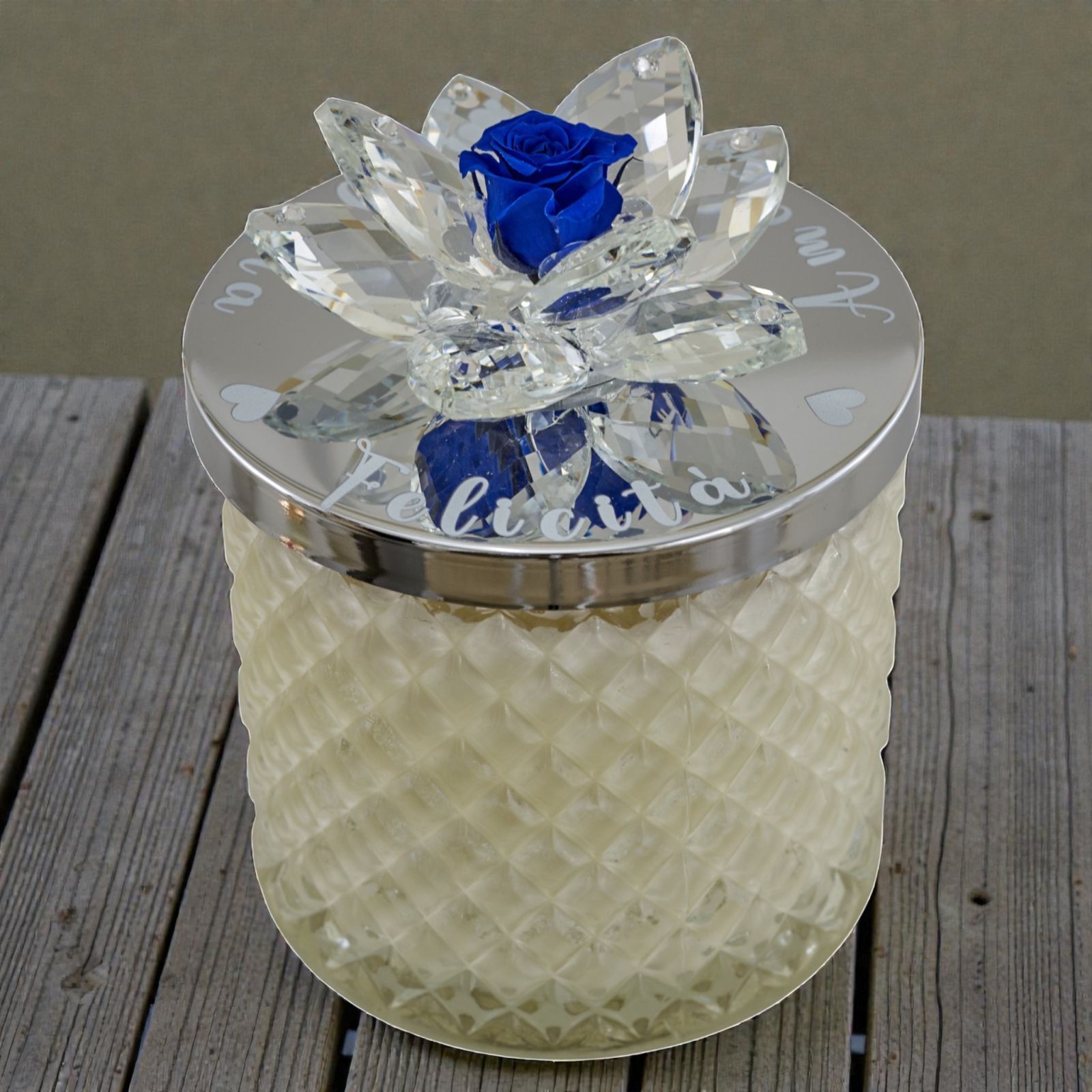 Rendi unico il tuo matrimonio o anniversario con questa splendida bomboniera. Una candela con portacandela in vetro diamantato, impreziosita da un fiore in Swarovski e da una delicata rosa blu sul coperchio oro, pensata per sorprendere e deliziare i tuoi invitati con eleganza e originalità.
