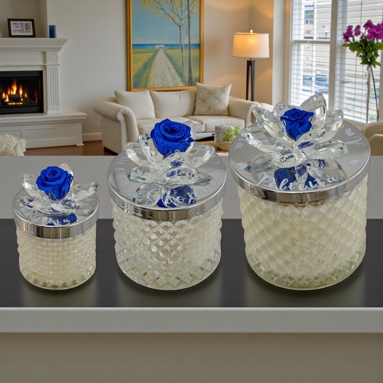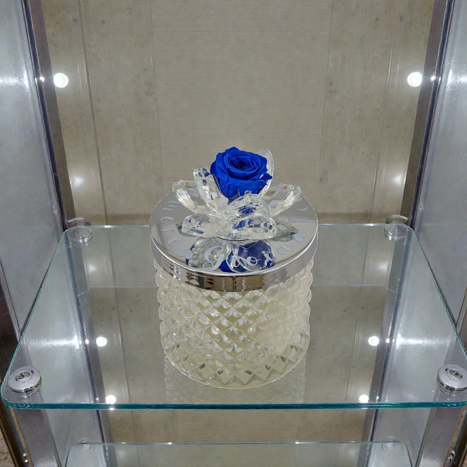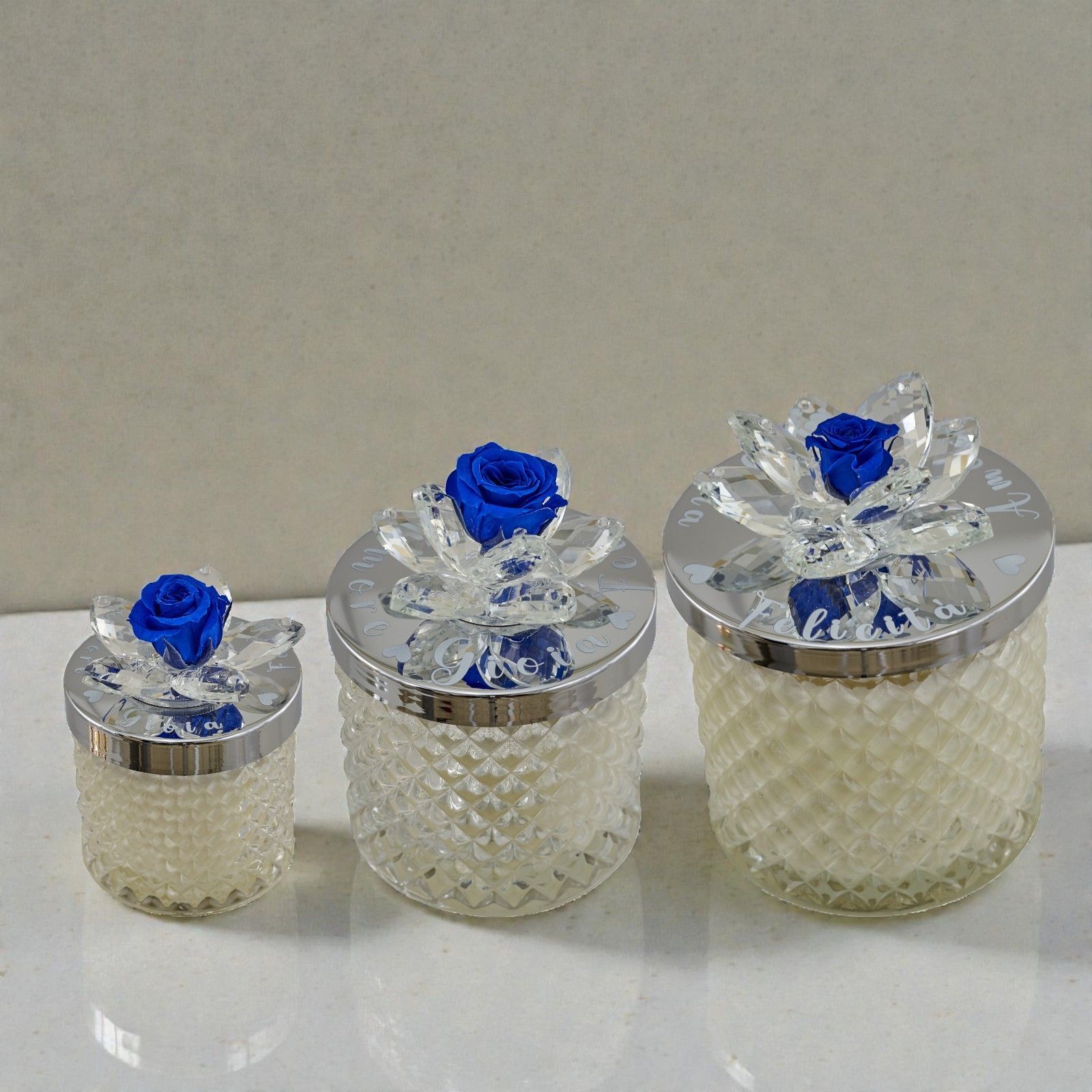 Rendi unico il tuo matrimonio o anniversario con questa splendida bomboniera. Una candela con portacandela in vetro diamantato, impreziosita da un fiore in Swarovski e da una delicata rosa blu sul coperchio oro, pensata per sorprendere e deliziare i tuoi invitati con eleganza e originalità.