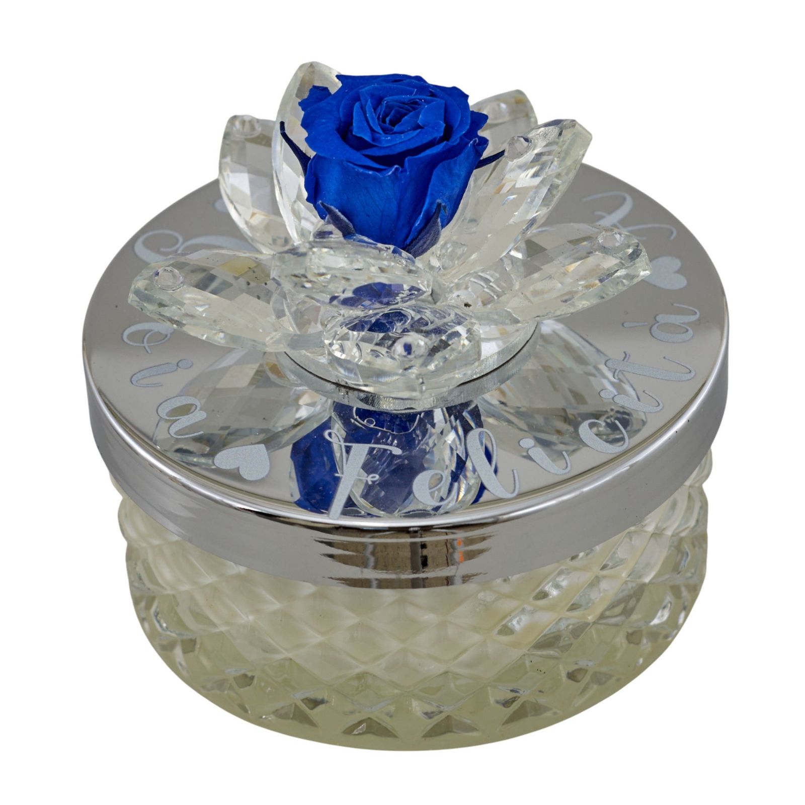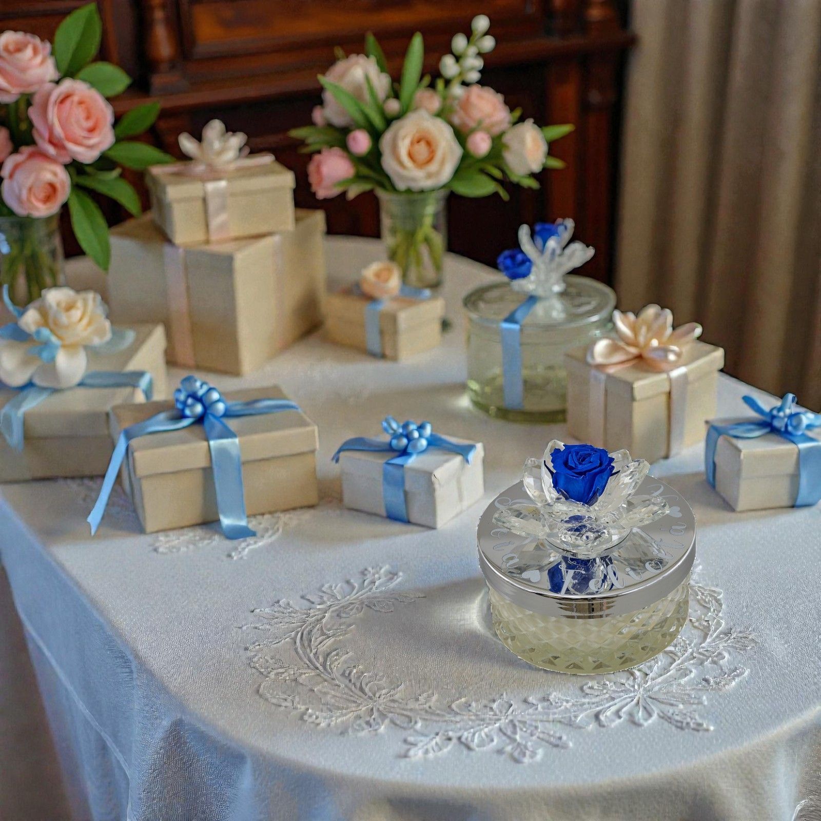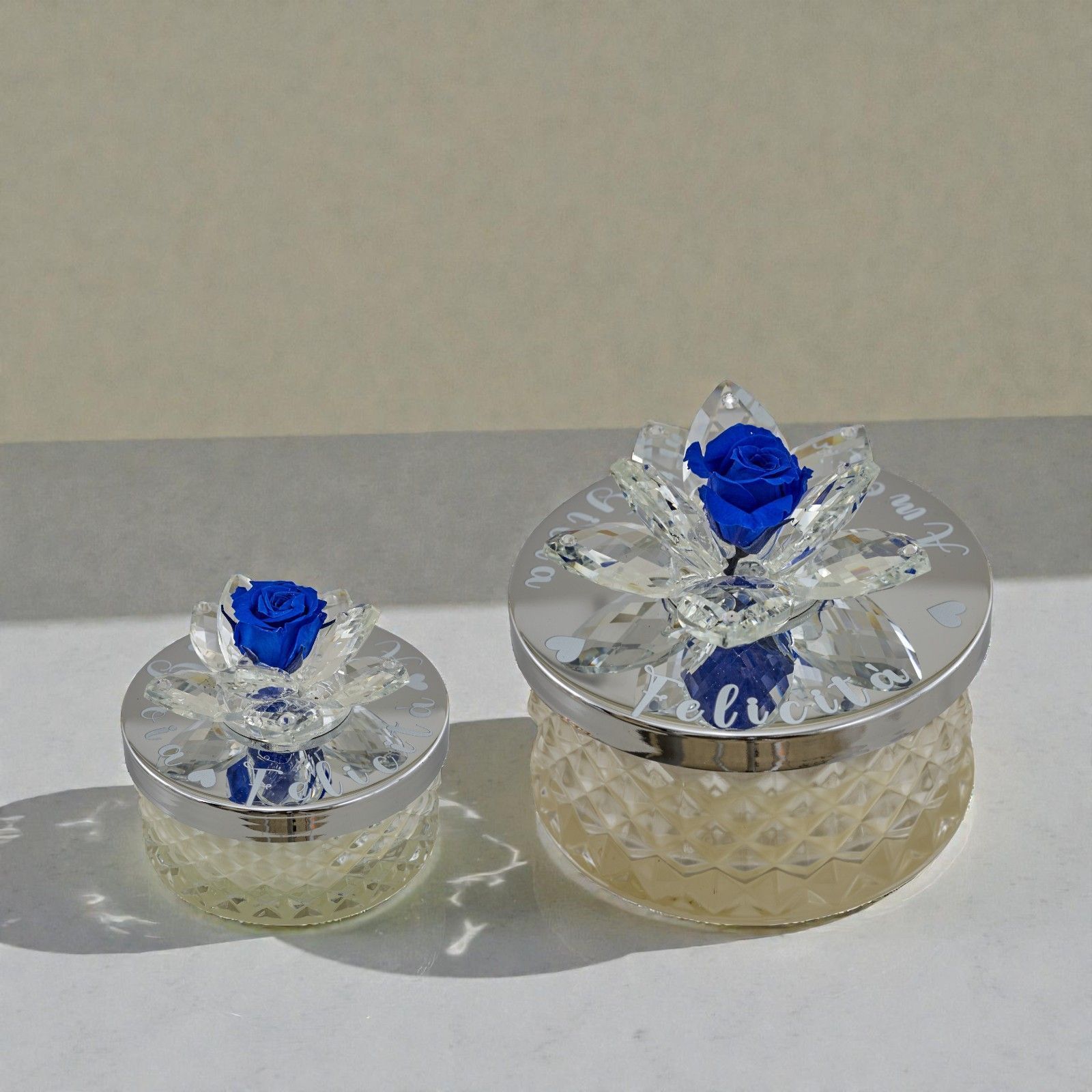 Scopri l'eleganza senza tempo delle nostre bomboniere con un portacandela in vetro diamantato, perfetto per rendere indimenticabili eventi come matrimoni e anniversari. Questo raffinato oggetto è arricchito da un delicato fiore in Swarovski e un affascinante bocciolo di rosa blu sul coperchio, simboli di amore e bellezza. Regala ai tuoi ospiti un ricordo prezioso e originale, un pezzo che illuminerà i loro cuori e le loro case.