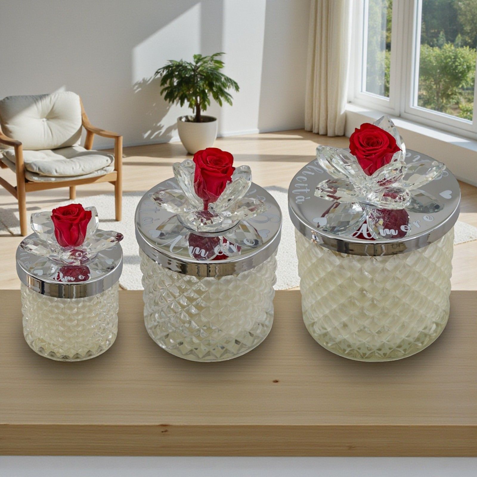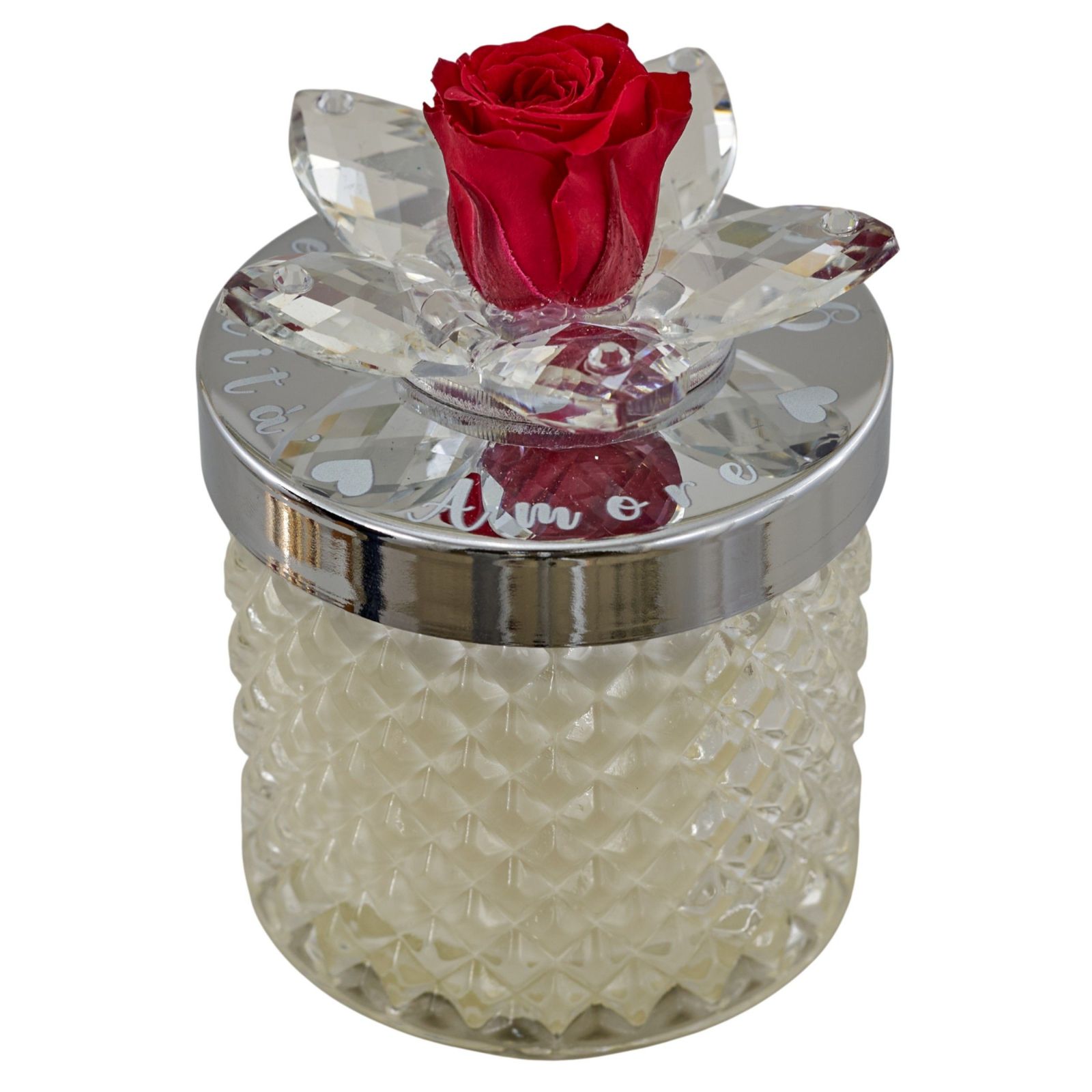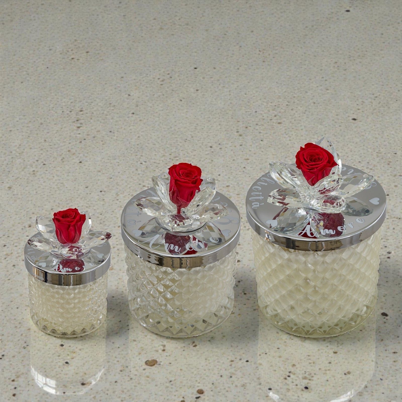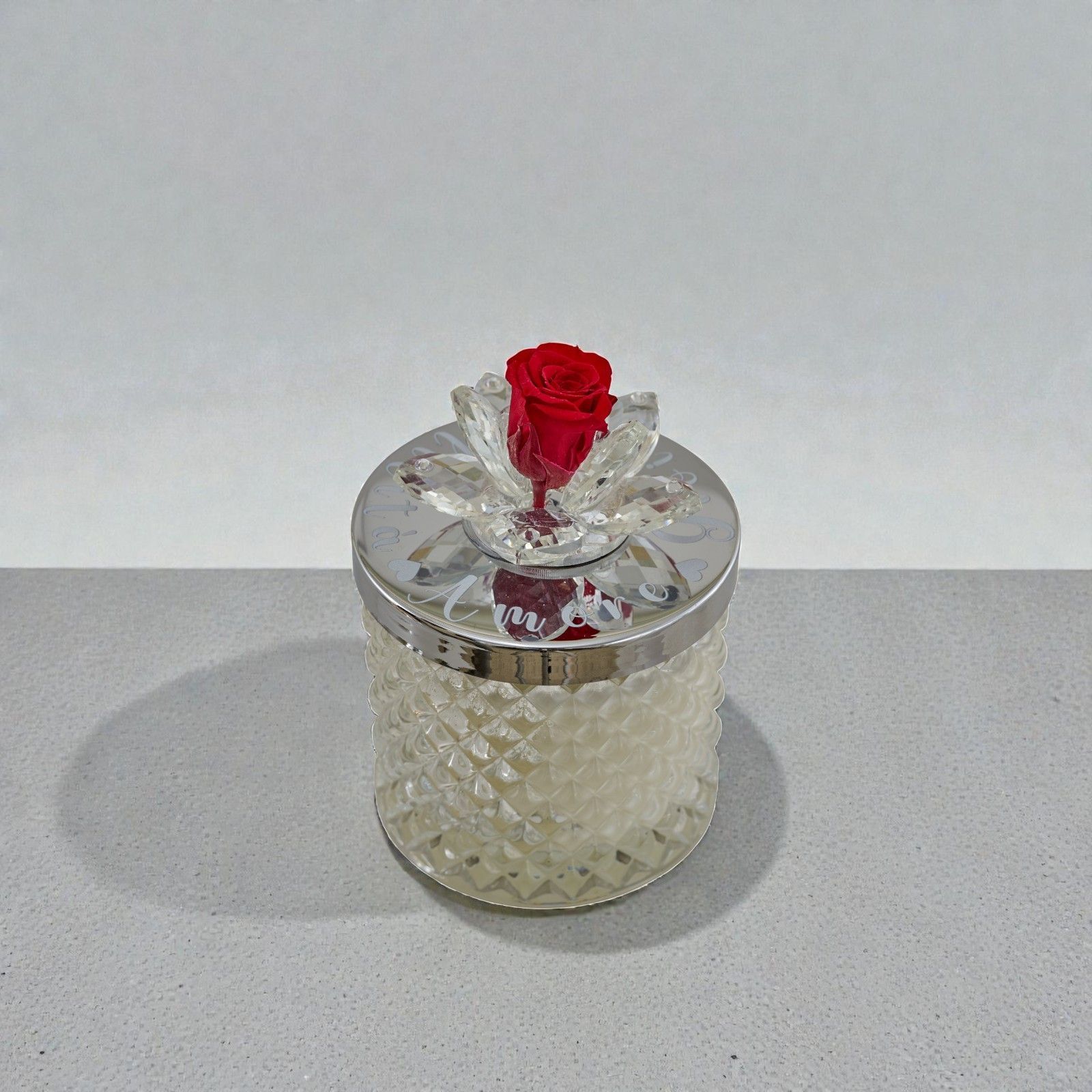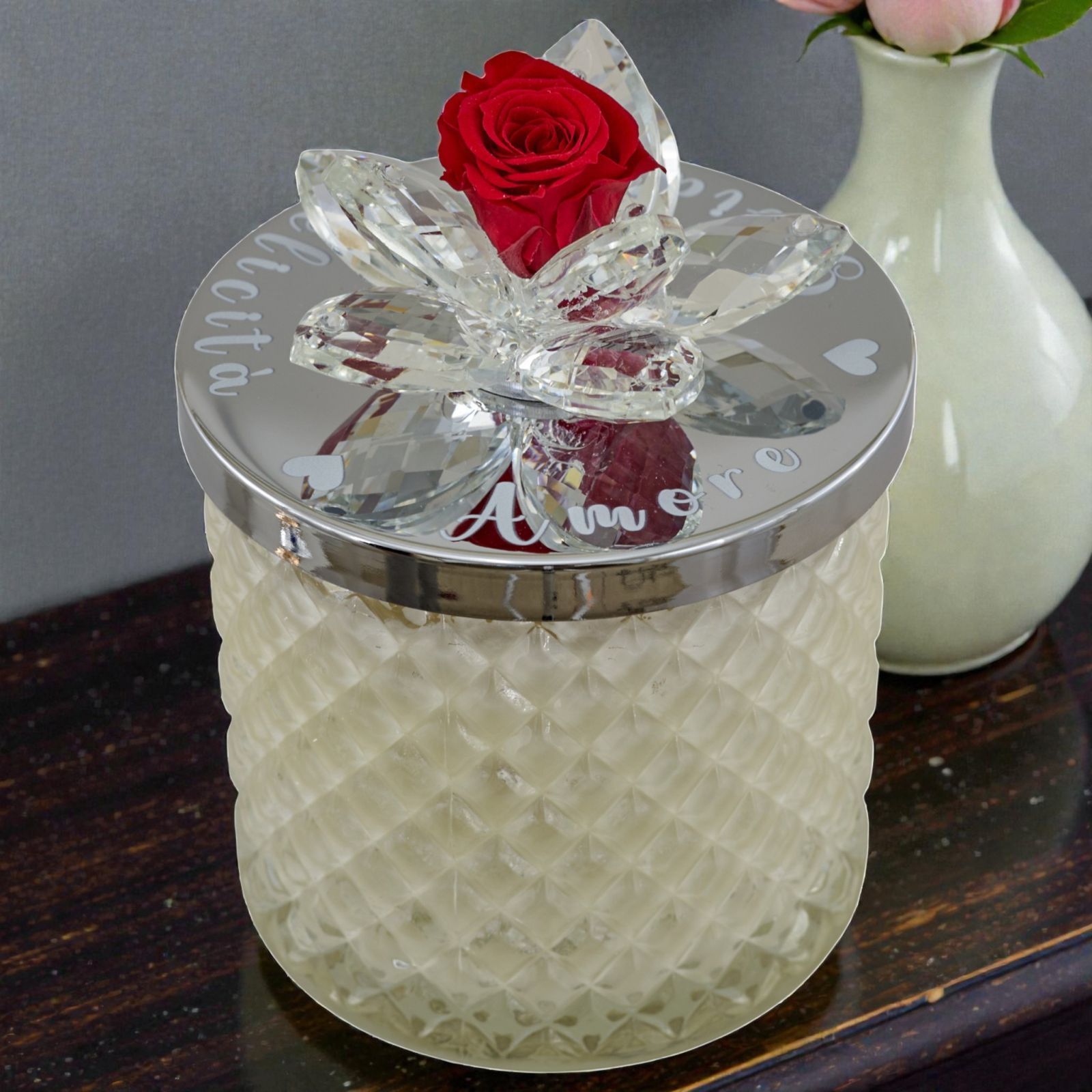 Rendi il tuo evento ancora più speciale con la nostra bomboniera esclusiva: una magnificenza di eleganza racchiusa in una candela e un portacandela in vetro diamantato. Decorato con un raffinato fiore in Swarovski e una romantica rosa rossa sul coperchio dorato, questo regalo è pensato per illuminare i momenti più preziosi del tuo matrimonio o anniversario. Ogni dettaglio è curato per trasmettere emozioni e ricordi indelebili, rendendo ogni occasione unica e memorabile.
