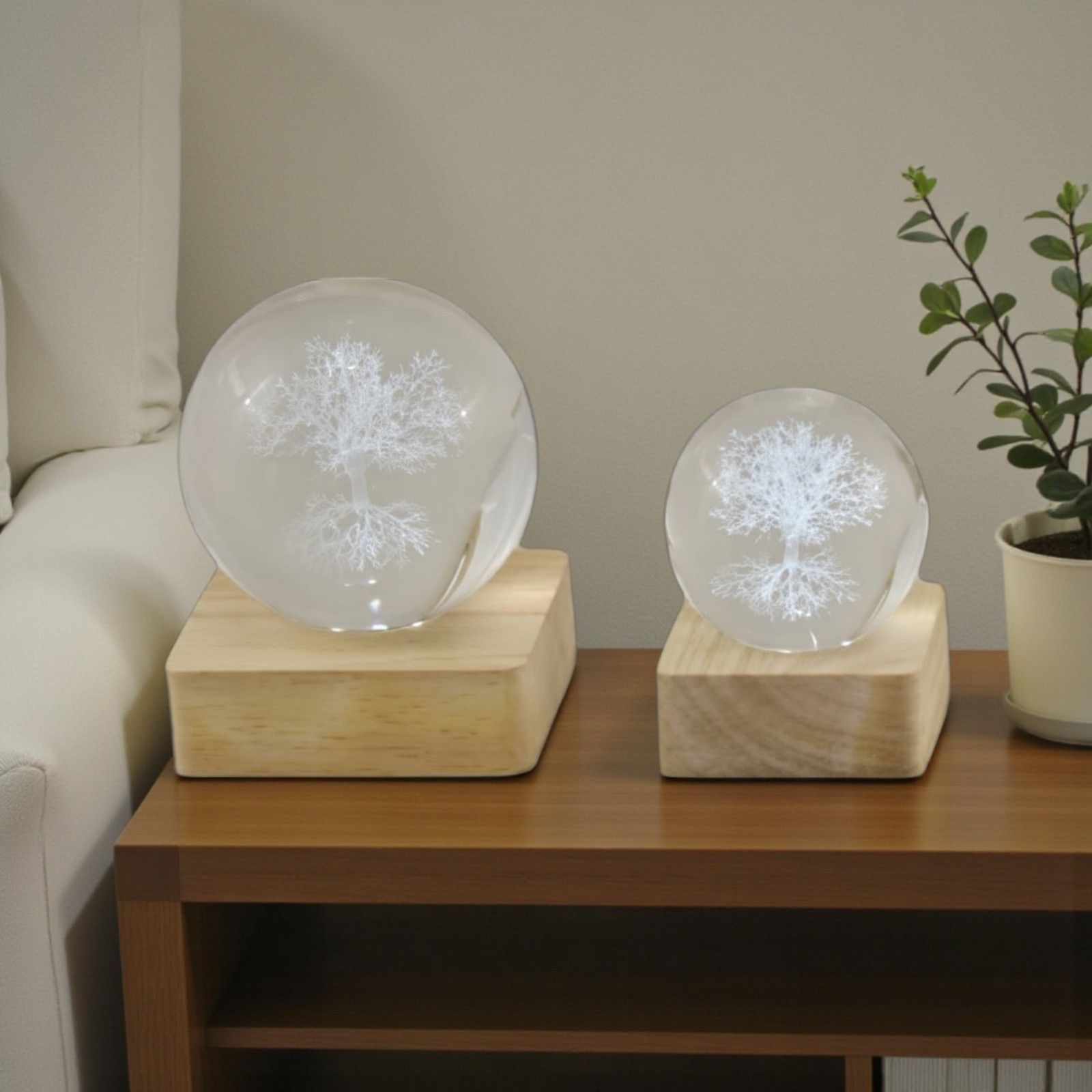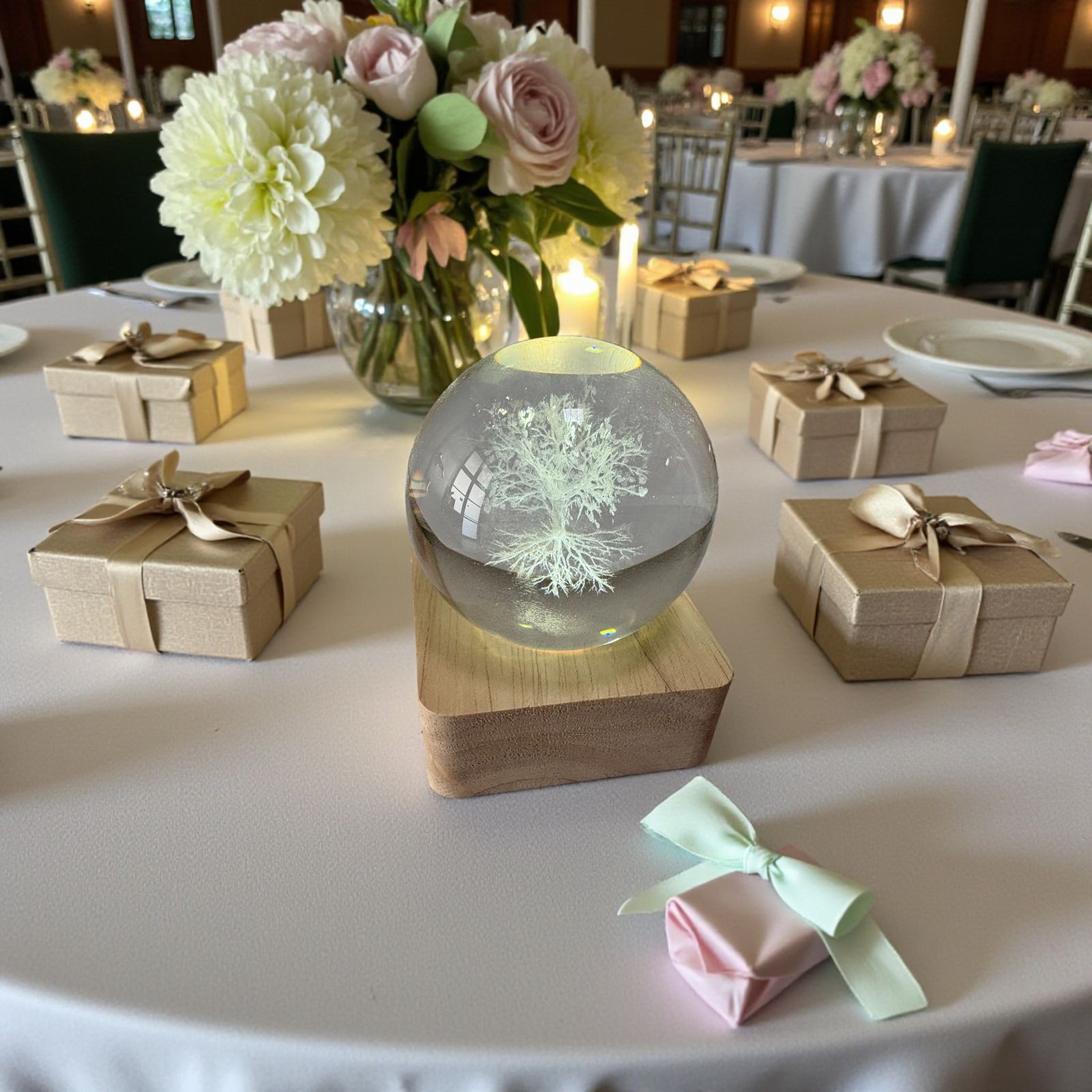 La base in legno naturale conferisce un tocco di eleganza e calore, mentre il vetro trasparente permette di ammirare la luce del LED che illumina l'albero, creando un'atmosfera suggestiva e accogliente. Scegliere questa bomboniera originale significa offrire un ricordo che accompagnerà i vostri cari nel corso degli anni, un faro di affetto e gratitudine.