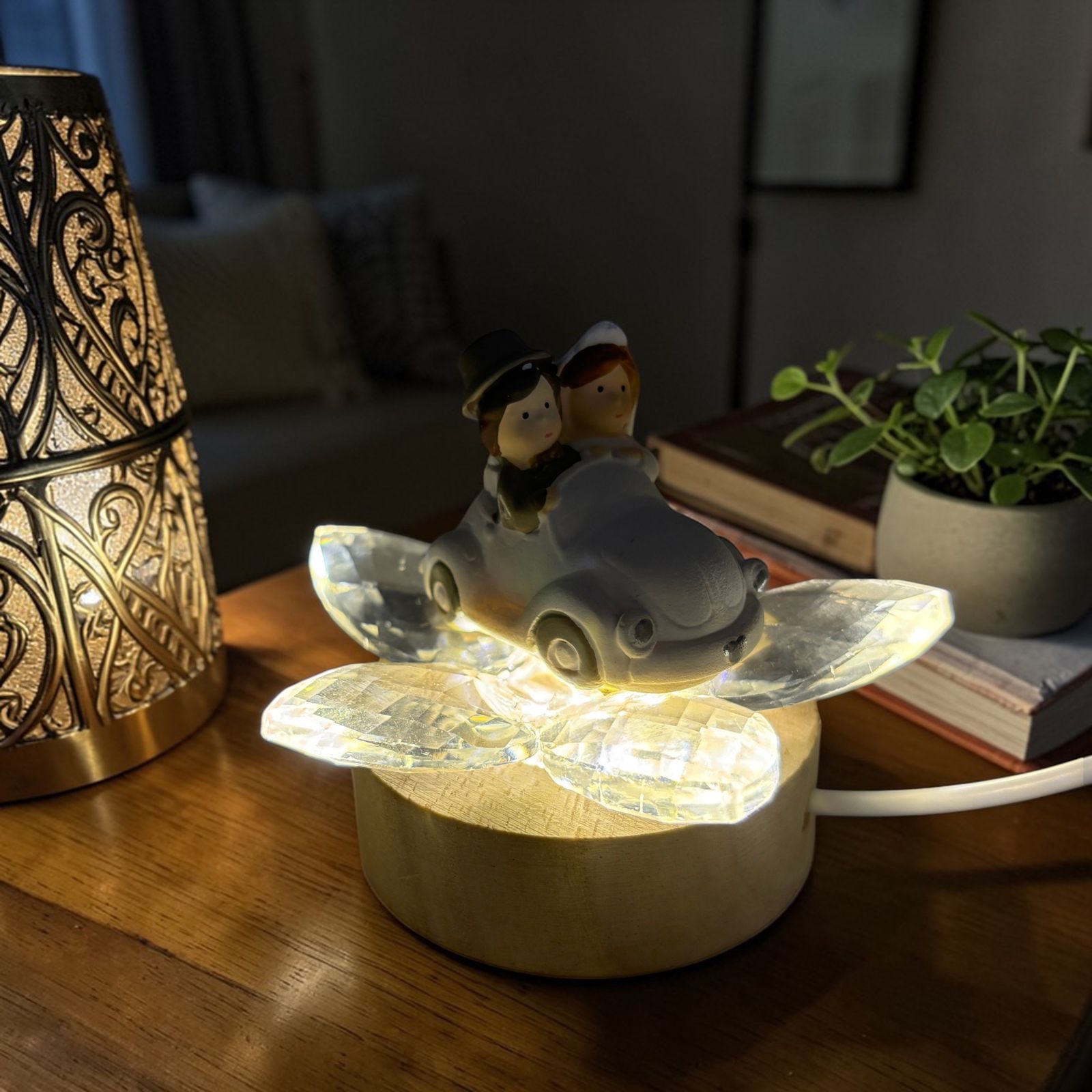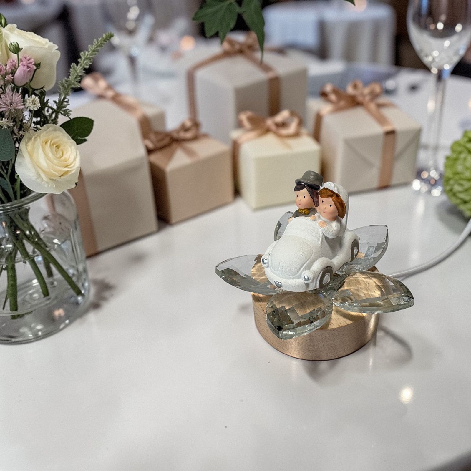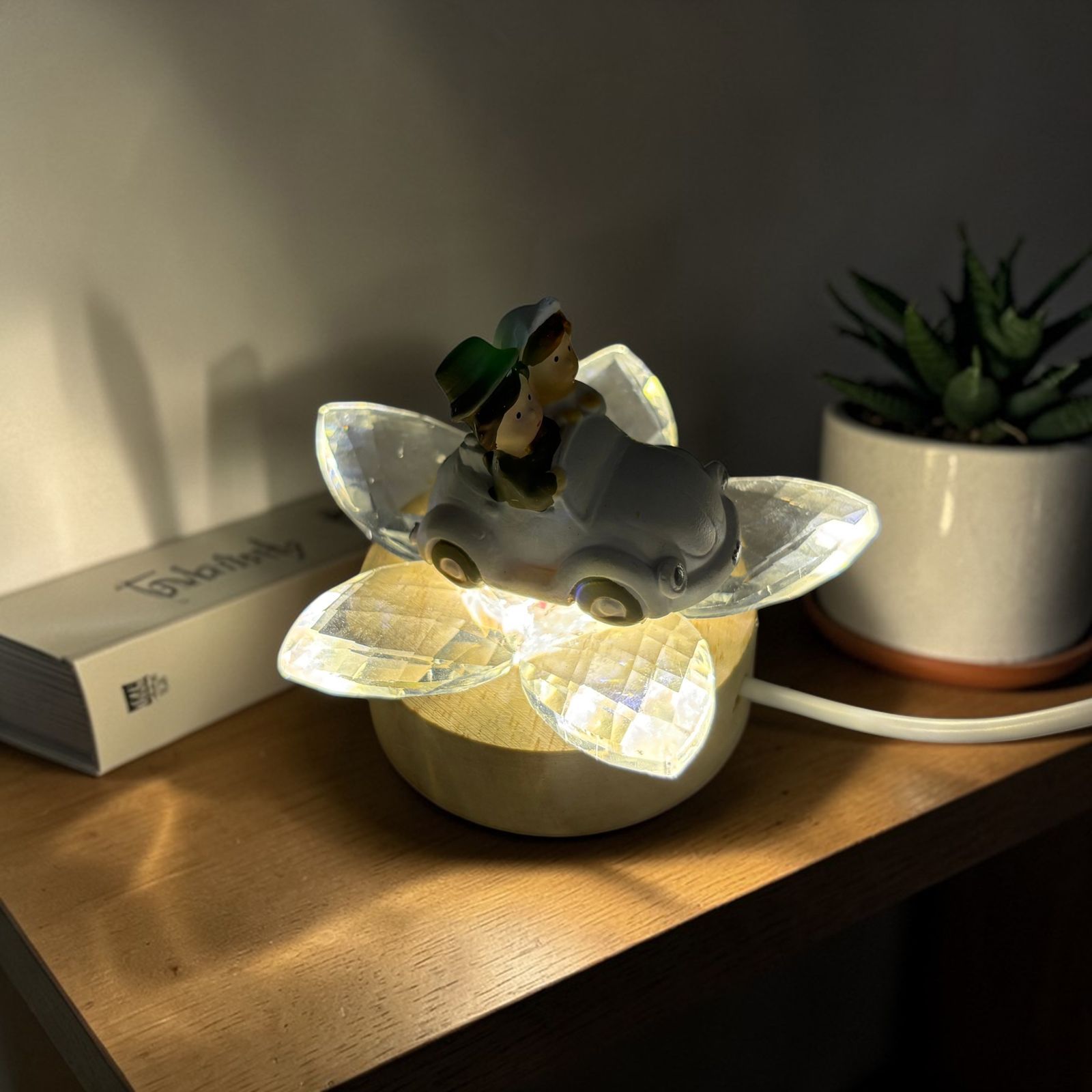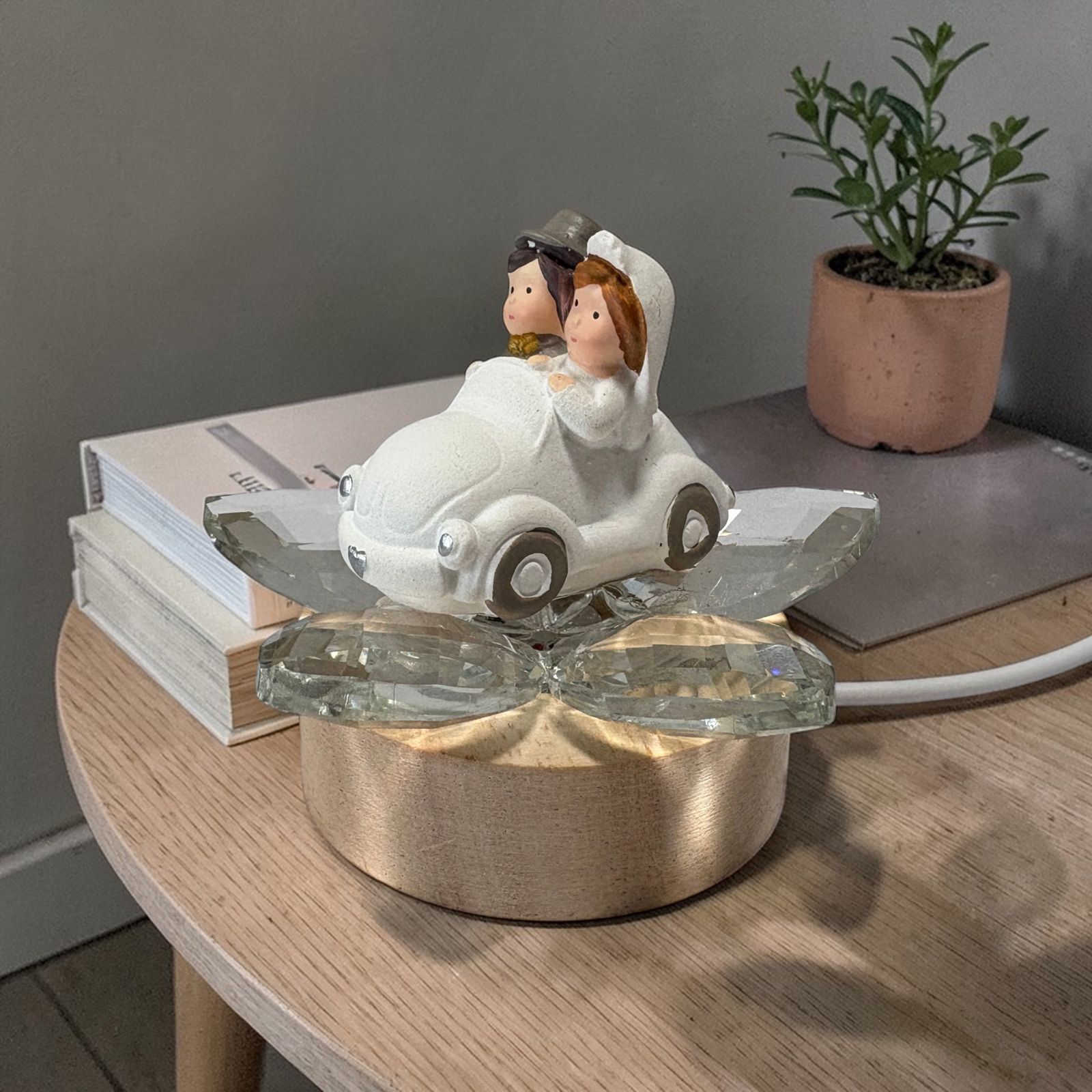 Delicata e ricca di significato, questa bomboniera con base LED e fiore in cristallo racchiude una romantica scena di sposini in auto, simbolo perfetto di un viaggio d’amore che prende il via. La luce valorizza i petali in cristallo dai toni pastello, creando un effetto elegante che conquisterà i vostri invitati. Una scelta tra le bomboniere matrimonio più originali per celebrare momenti indimenticabili.