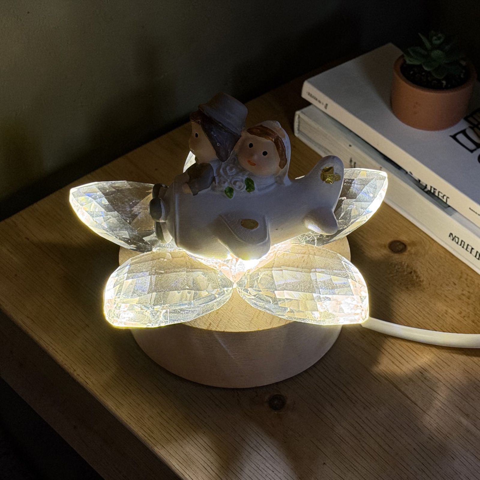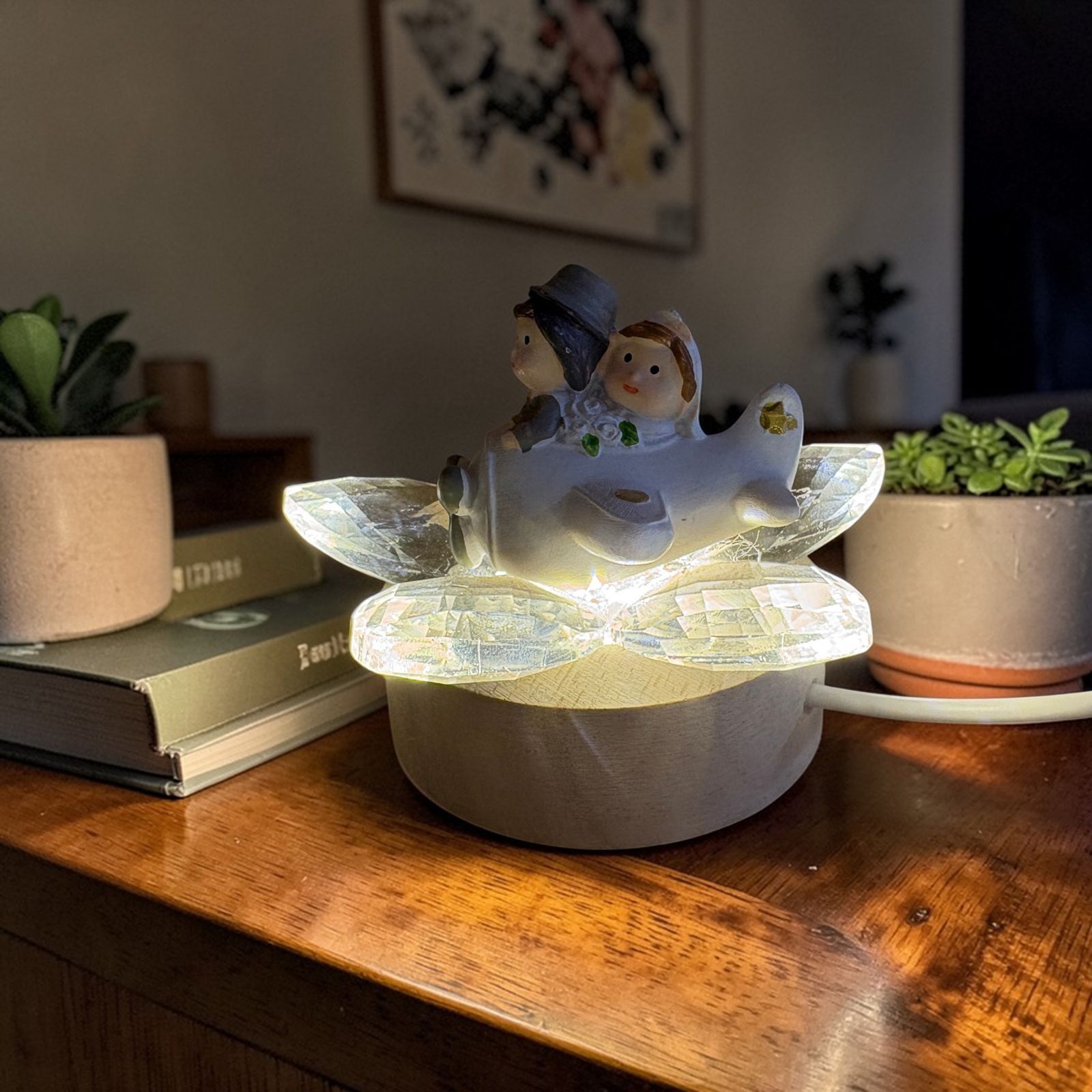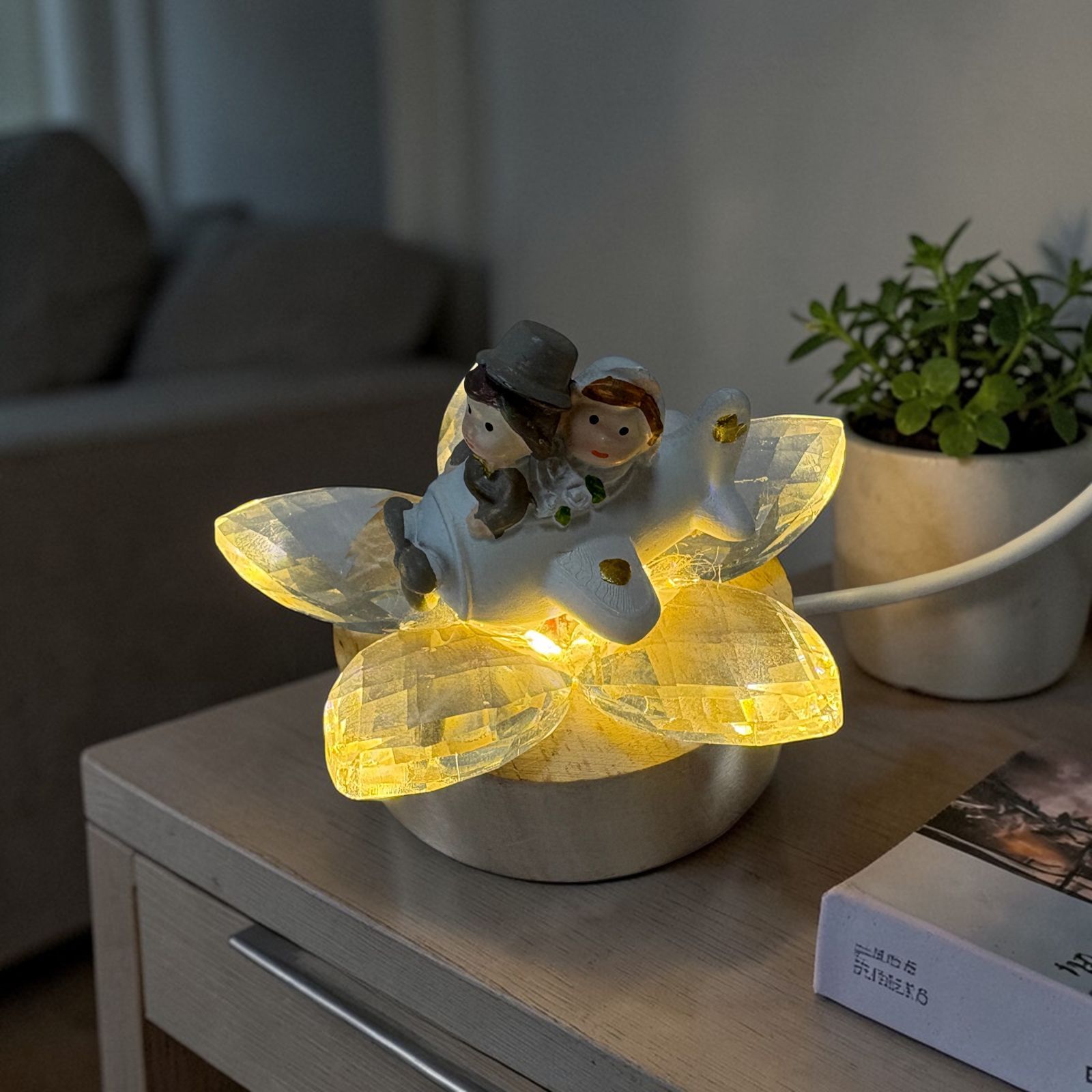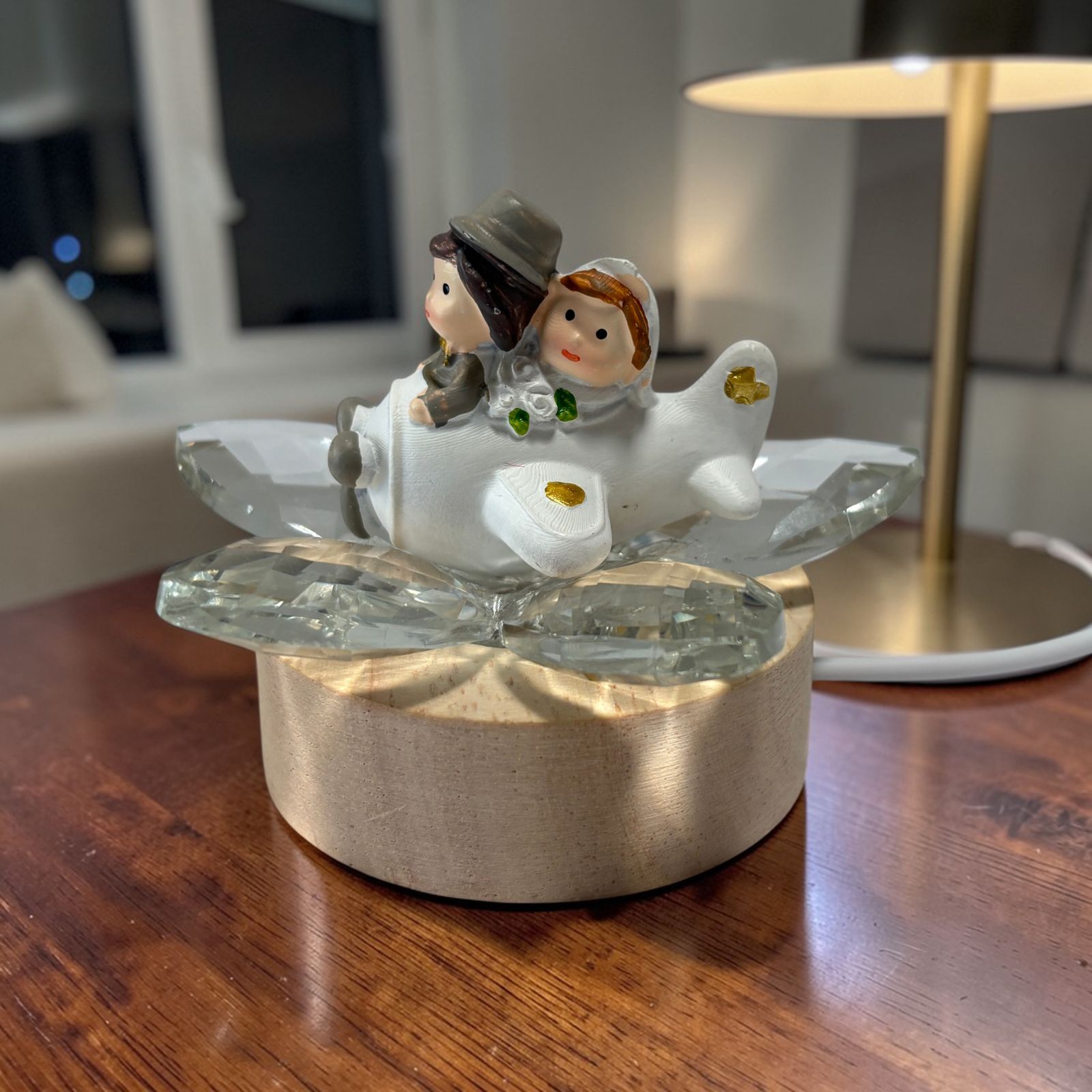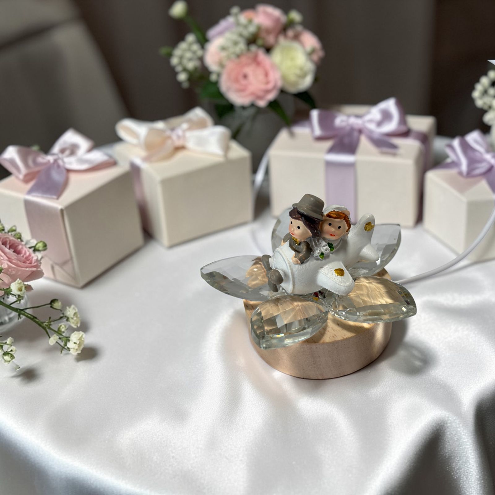 Raffinata e ricca di fascino, questa bomboniera con base LED e fiore in cristallo celebra l’amore con una romantica coppia di sposini in aereo, vestiti con abiti eleganti e curati nei minimi particolari. La scena racconta l’inizio di un viaggio insieme, mentre la luce della base valorizza i petali in cristallo dai delicati colori pastello, creando un effetto di grande classe. Una scelta perfetta tra le bomboniere matrimonio più originali e significative.