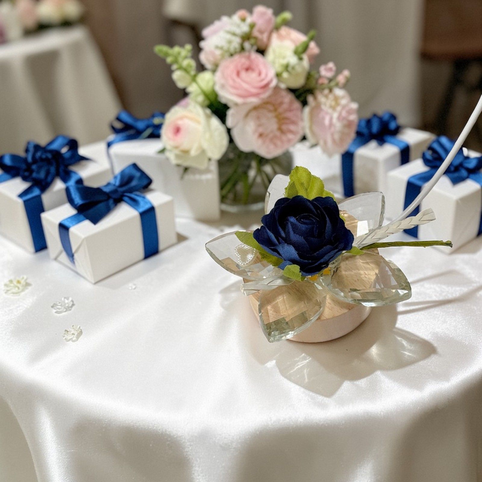 Porta un tocco di luce e colore alle tue celebrazioni con questa lampada led con fiore in cristallo. Perfetta come bomboniera per prima comunione, matrimonio, anniversario o compleanno, la rosa finta con trecciolina nei delicati toni rosa e blu aggiunge eleganza e fascino agli invitati.