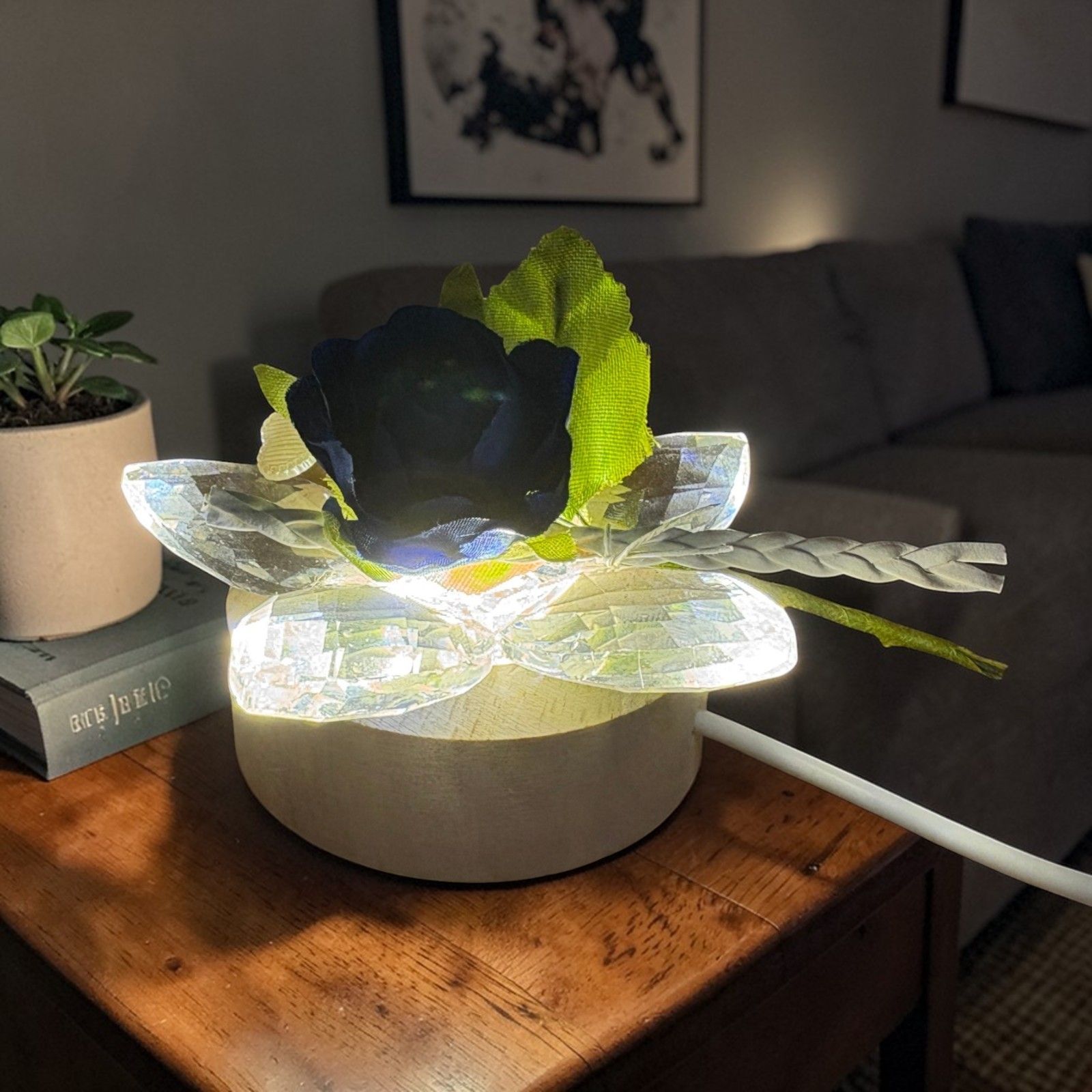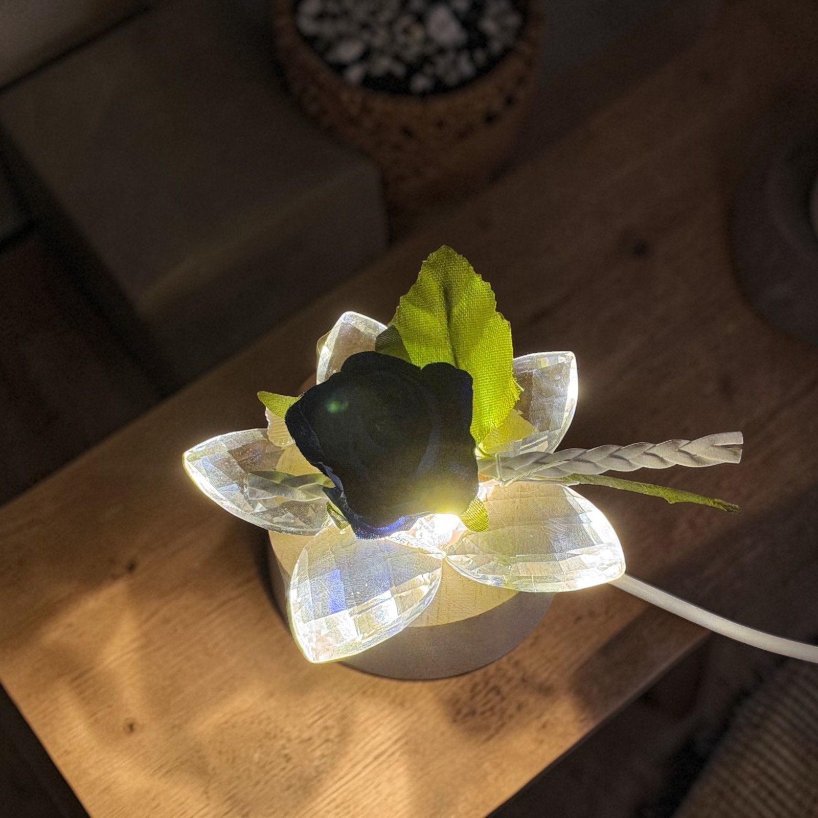 La combinazione di base in legno e fiore in cristallo crea un effetto luminoso unico: il led illumina i petali rendendo questa bomboniera un piccolo oggetto decorativo raffinato da esporre o regalare.