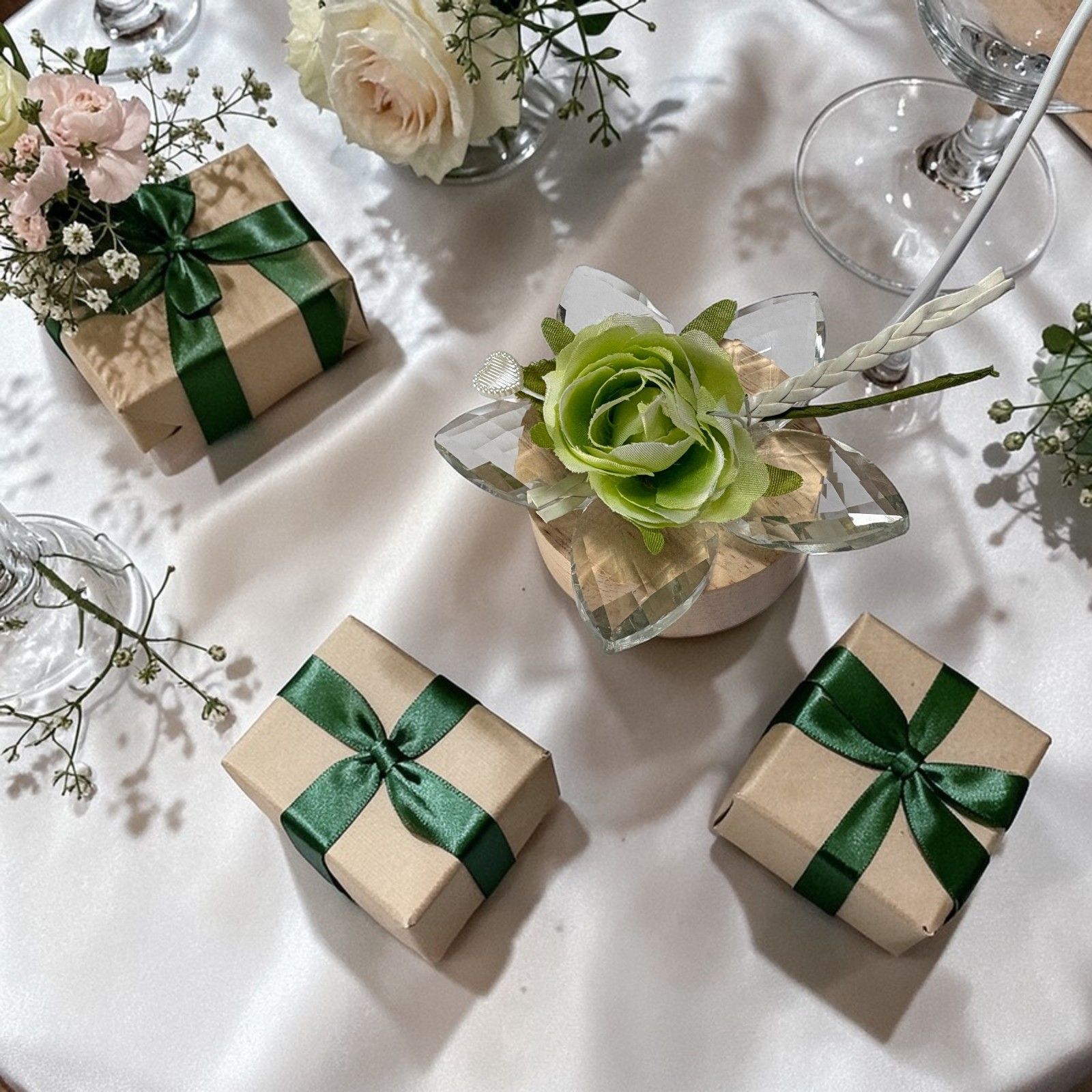 Ogni dettaglio è pensato per sorprendere: il cristallo cattura e riflette la luce creando un effetto scintillante, mentre la rosa verde simboleggia armonia, affetto e gratitudine. Questa bomboniera originale diventa così un ricordo luminoso da custodire con emozione.