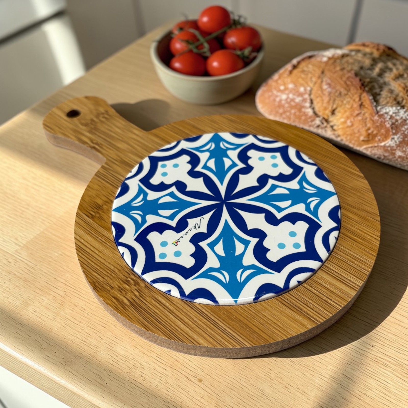 La combinazione di legno naturale e ceramica dipinta a mano rende ogni pezzo unico, ideale come sottopentola o piccolo tagliere. Il manico con foro superiore permette di esporlo facilmente in cucina, trasformandolo in un elegante ricordo da mostrare con orgoglio.