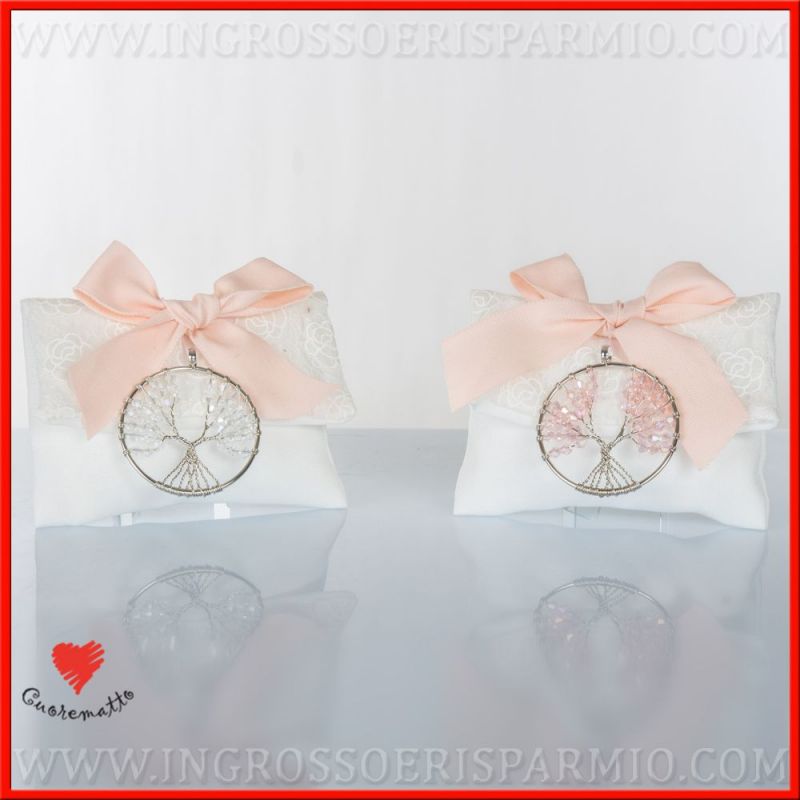 Sacchetto portaconfetti solidale albero della vita. Bustina in poliestere colore bianco e dettaglio fiori ricamati, con fiocco rosa sulla parte esterna e ciondolo della dimensione 5x5 cm c.ca, con albero della vita stilizzato con corallini rosa o bianchi a formare la chioma dell'albero . Chiusura a strappo.