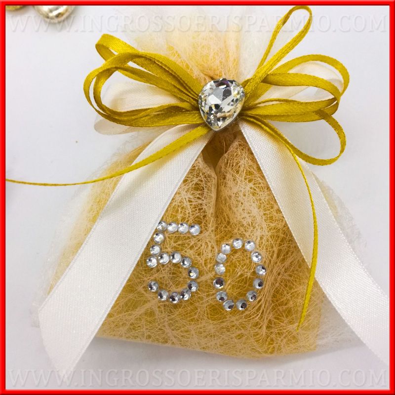 Sacchettini per confetti realizzati in tulle argento/oro e rivestiti da uno strato in TNT bianco. Bomboniere portaconfetti realizzate a mano con cura, adornati con doppio nastro, bianco e oro/argento con strass centrale. Sul fronte del sacchetto sono applicati piccoli brillantini che formano il numero 25 o 50.