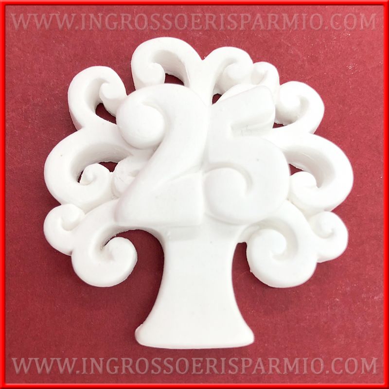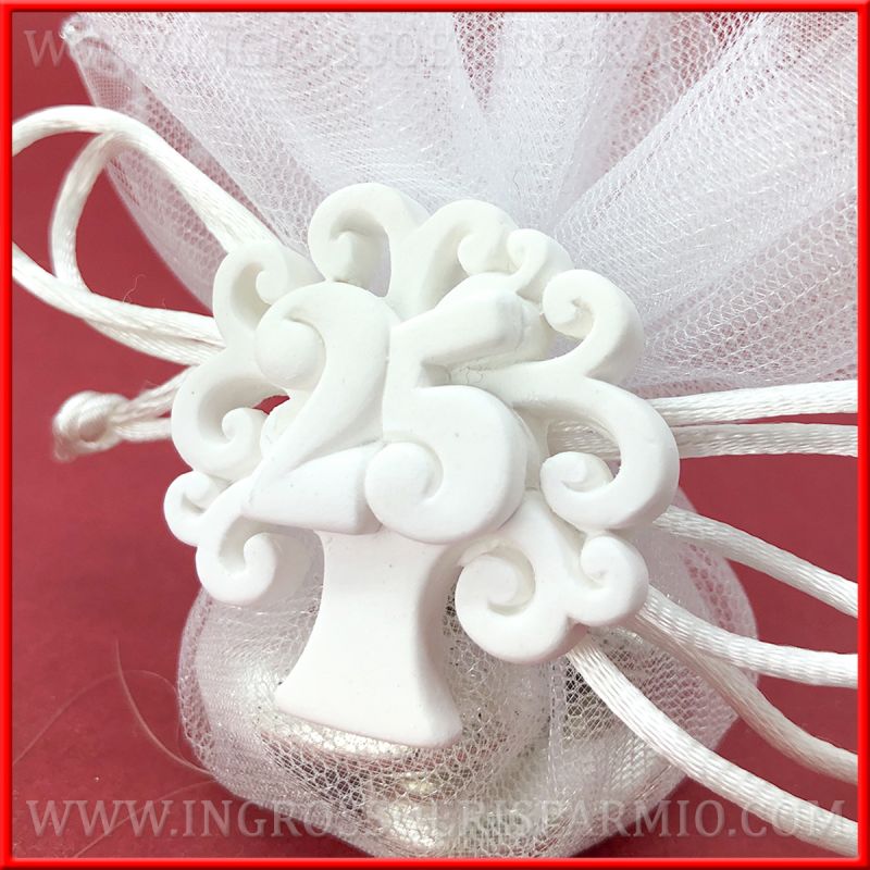 Bomboniere economiche albero della vita in gesso bianco con applicazione centrale del numero 25, in rilevo.