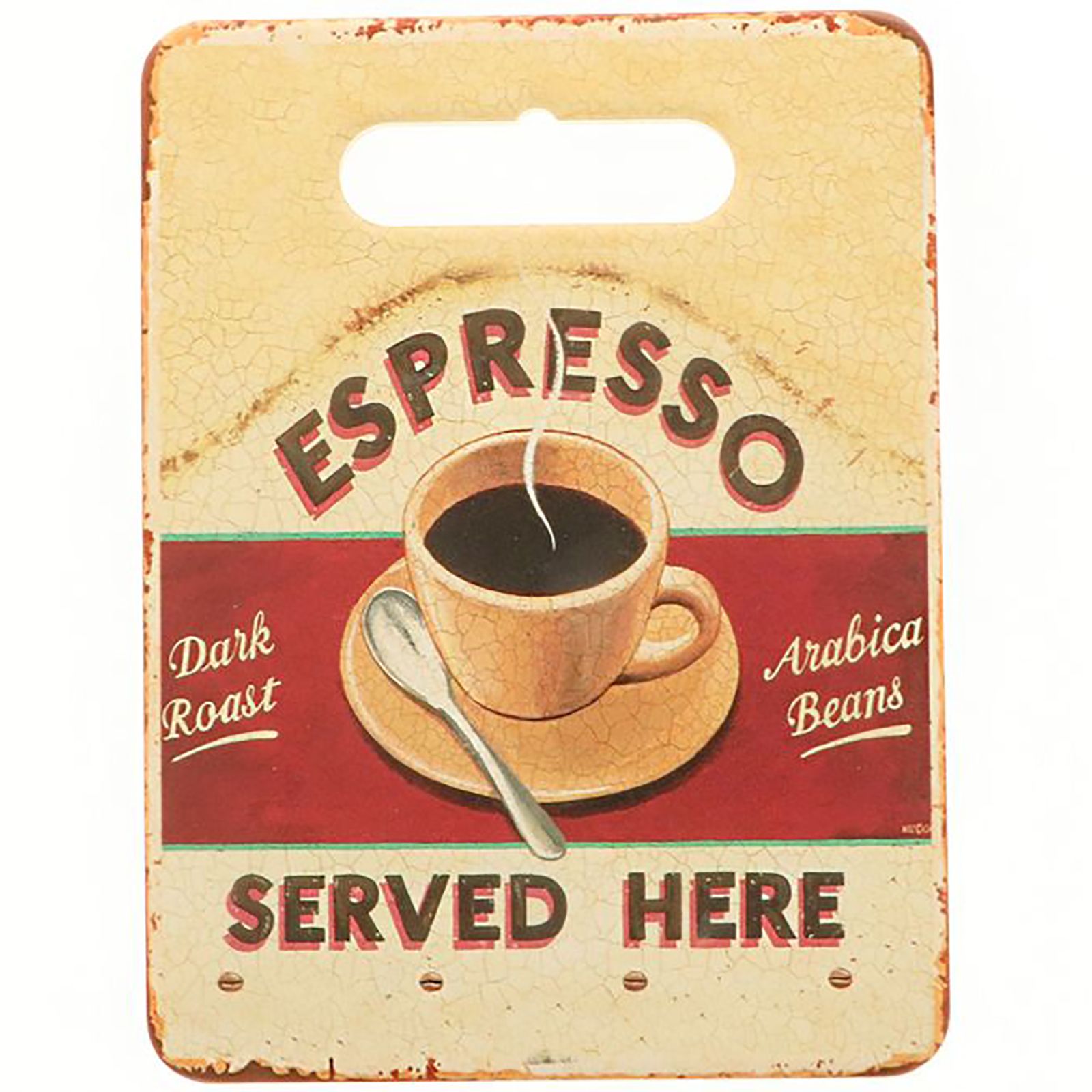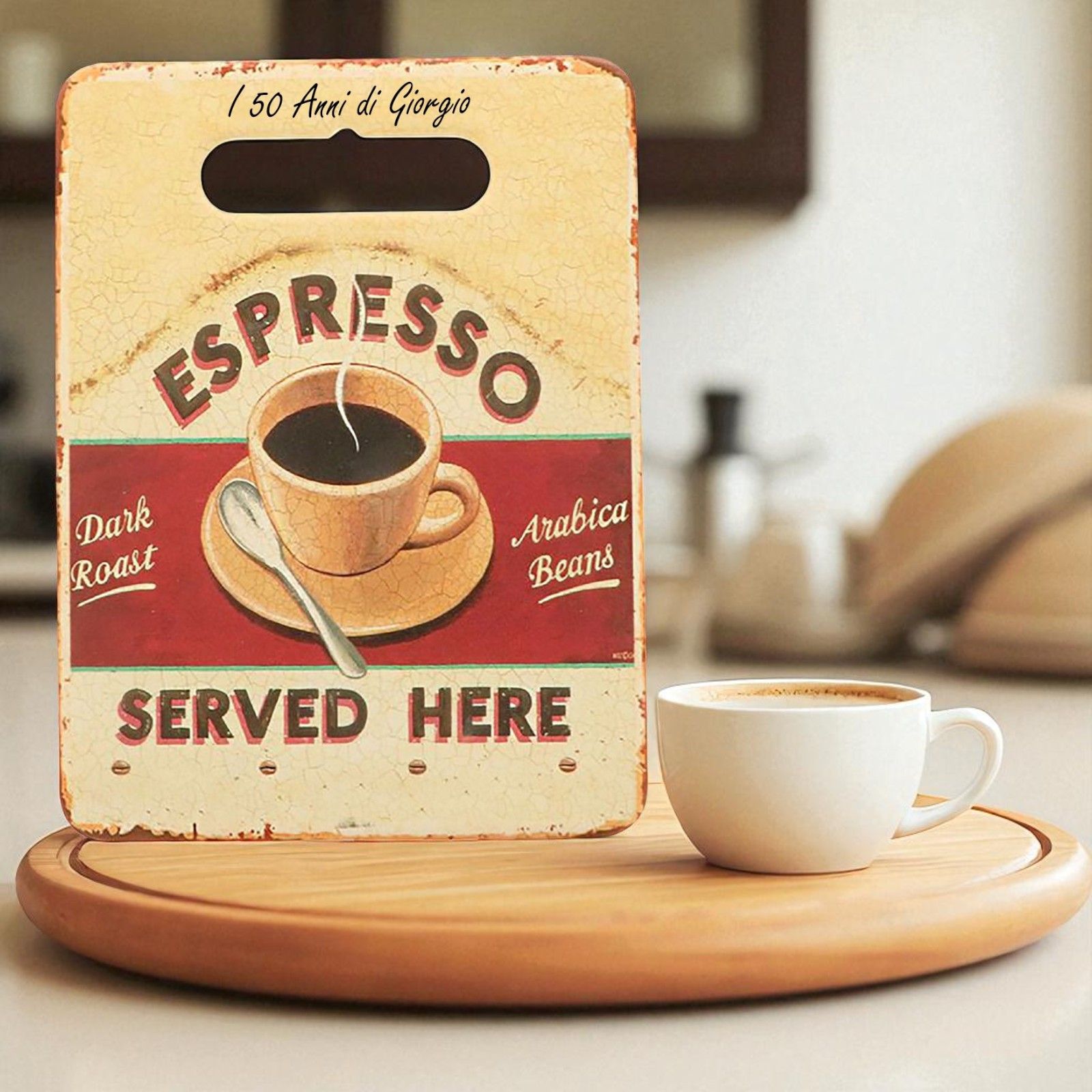 Tagliere rettangolare a doppio strato: lastra in ceramica decorata a mano con tazza da caffè espresso e fondo in sughero, con foro superiore per appenderlo al muro come elemento decorativo.