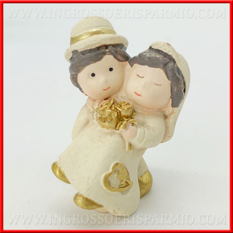 Statuette sposi color avorio con sposa in braccio allo sposo decorate da dettagli in resina color oro.
