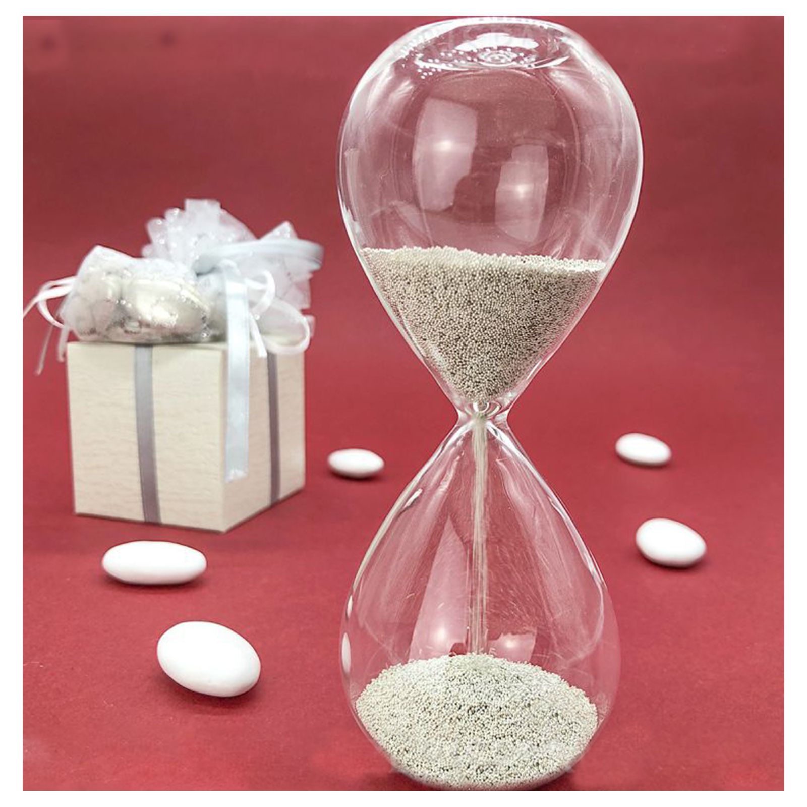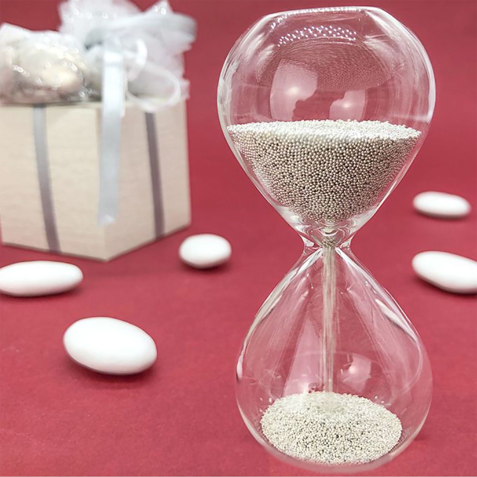 Richiedi bomboniere clessidra vetro già confezionate, scegliendo tra confezione con sacchetto e confetti o confezione con scatola!
