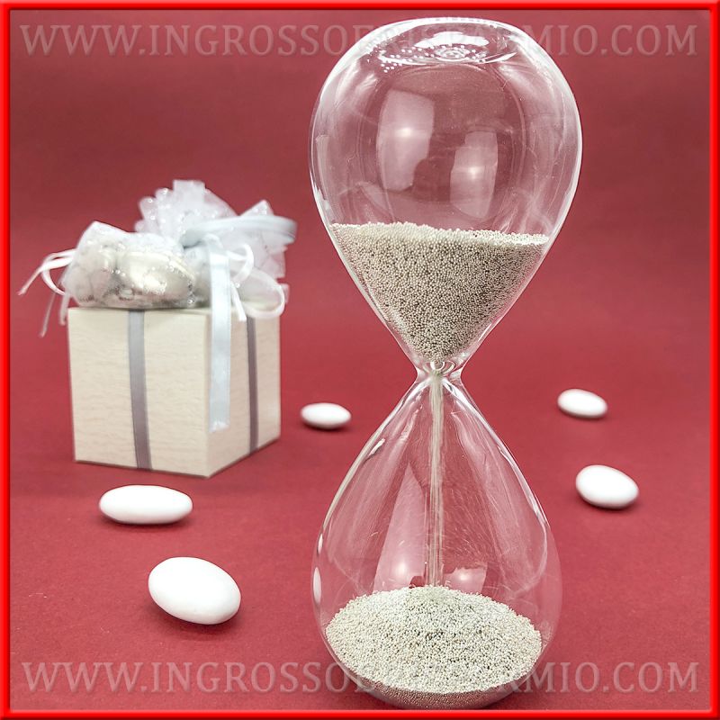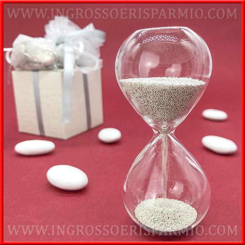 Utilizzala come clessidra bomboniera matrimonio, per donare agli invitati un cadeau nozze diverso dal solito; particolarmente indicata come bomboniere 25° anniversario di matrimonio, data la presenza di sabbia argento.