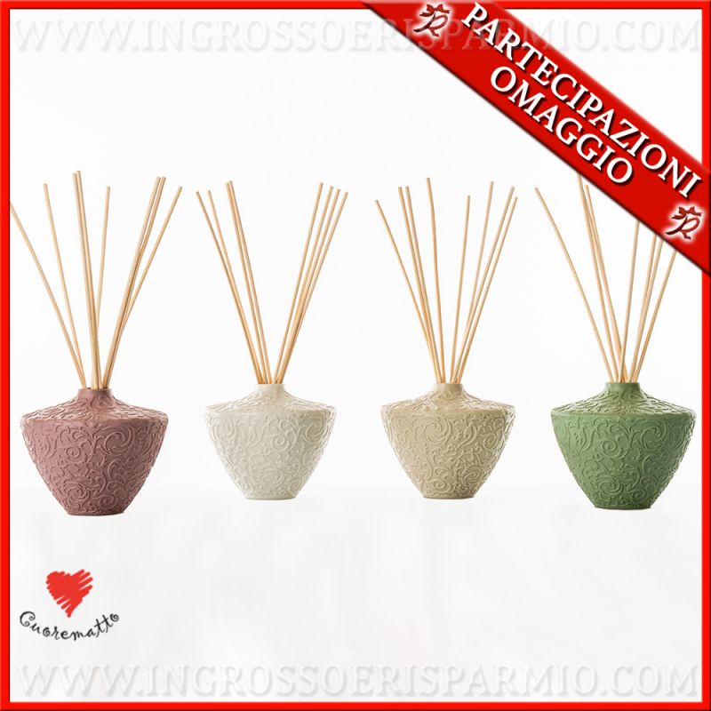 Il profumatore ambienti bomboniera è realizzato in porcellana bisquit (porcellana opaca, non smaltata), con forma particolare e minuziosi decori curvilinei in rilievo. Assortiti in ben 4 varanti di colore: rosa antico, bianco, crema e verde.
