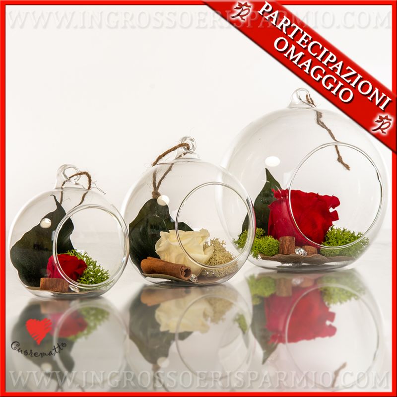 Sfera/palla vetro soffiato all'interno della quale è stata creata una piccola decorazione floreale con una rosa stabilizzata rossa o bianca, un chicco di cannella, una foglia verde e del muschio.