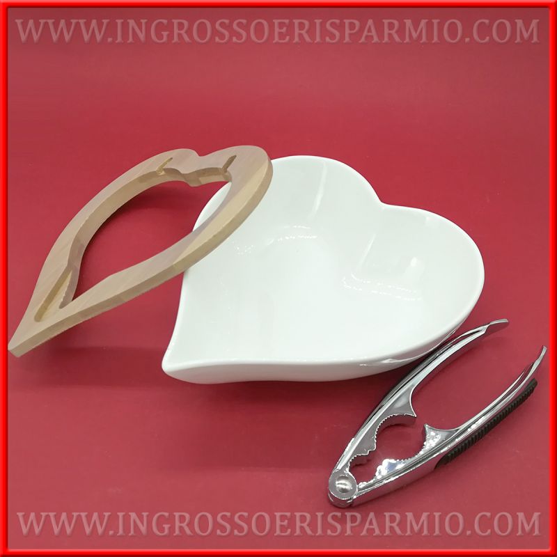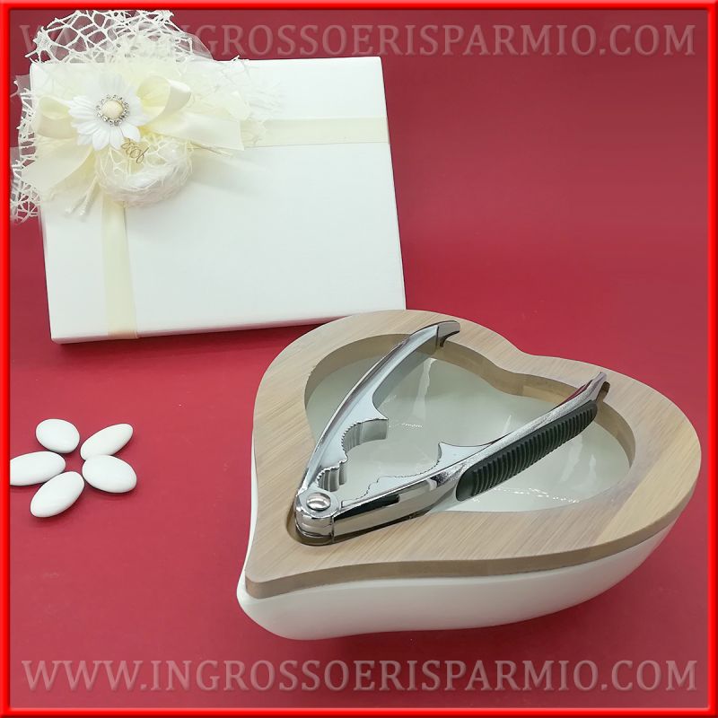 Elegante e moderno contenitore a forma di cuore in porcellana bianca per frutta secca con bordo in legno e schiaccianoci bomboniera in materiale resistente, con impugnatura antiscivolo, che si ripone sul coperchio ad incastro.