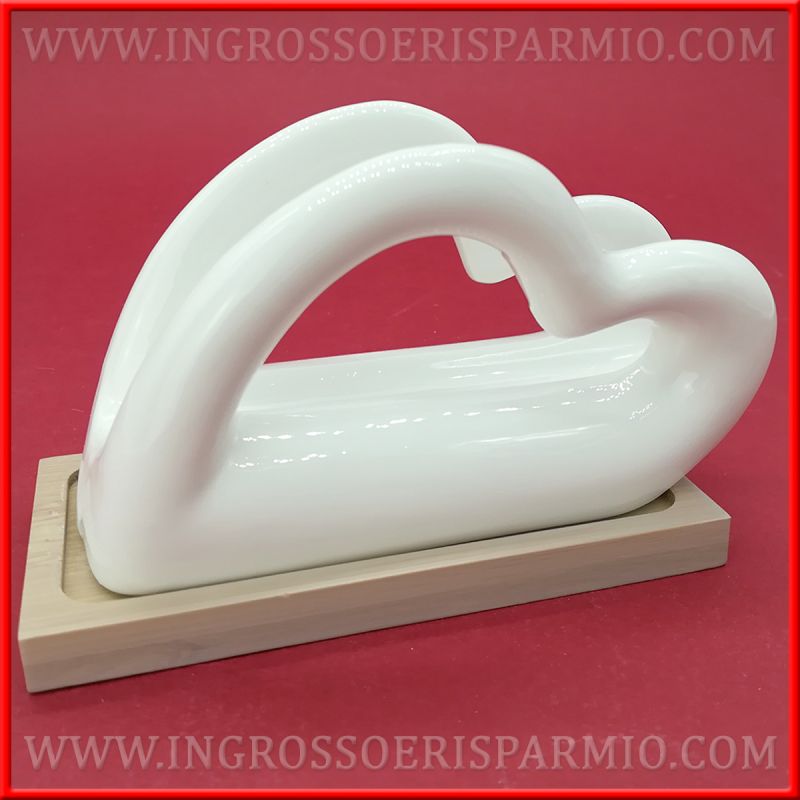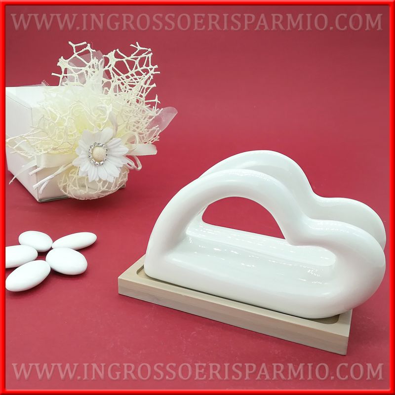 Il porta tovaglioli ceramica cuore si completa di una base in legno: l'accostamento di questi materiali differenti crea un contrasto di colori moderno, ma elegante al tempo stesso.