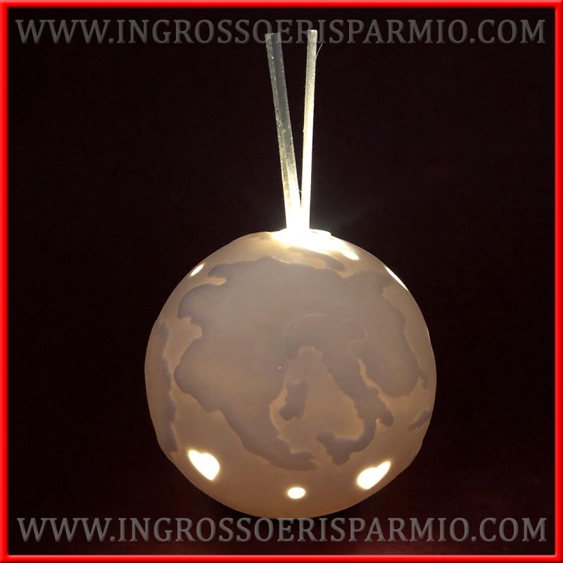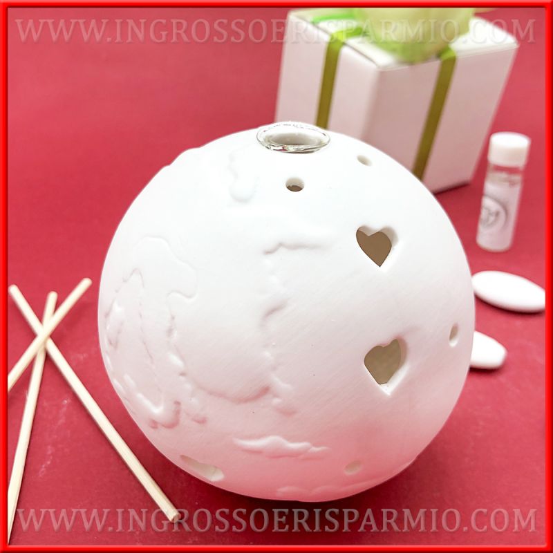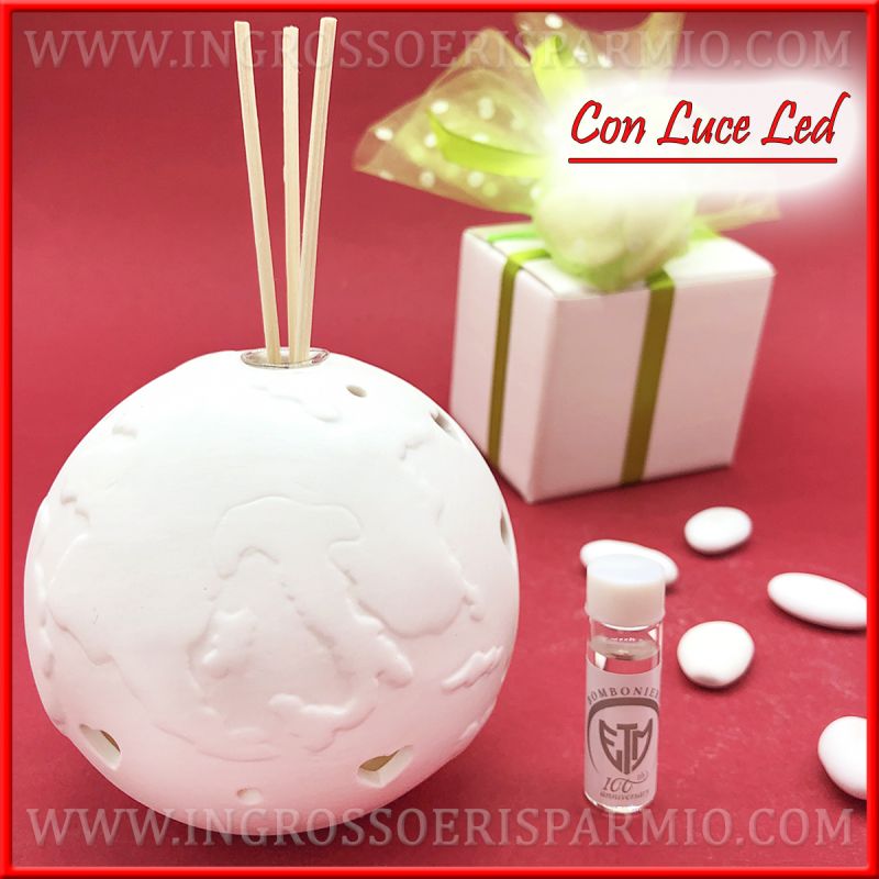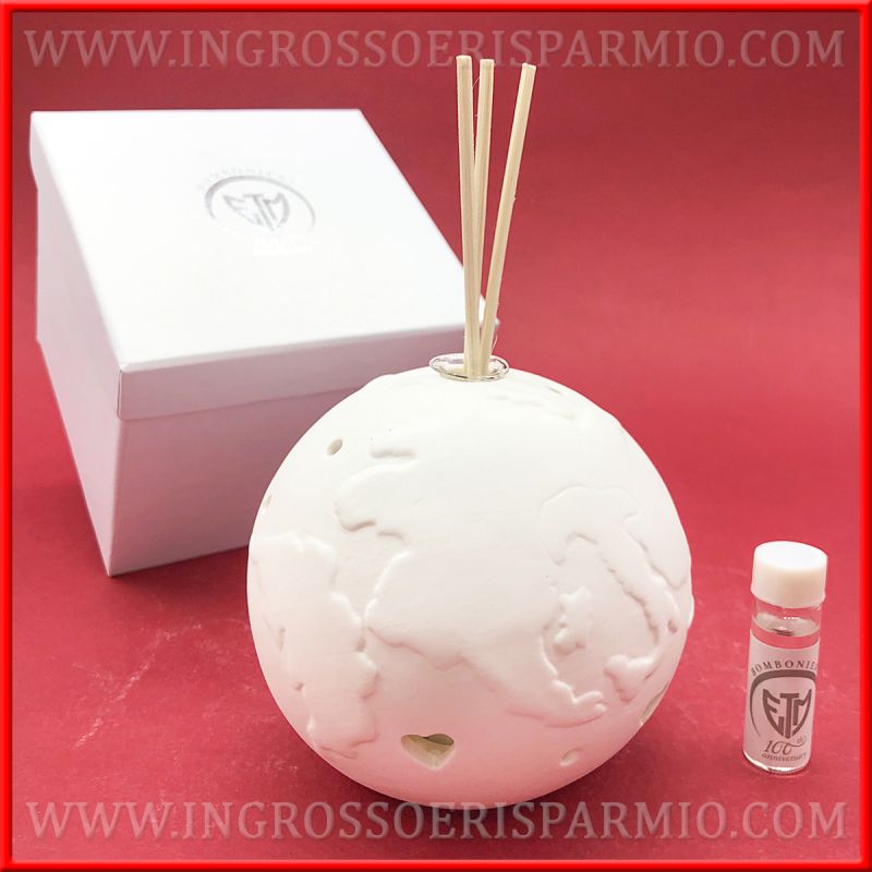 Mappamondo profumatore ambienti, realizzato in ceramica bianca con sagoma continenti in rilievo e fori da cui fuoriesce la luce del led presente all'interno del globo bomboniera. Nella parte superiore è presente un foro in cui inserire una fiala in vetro trasparente che serve a contenere la fragranza ed in cui inserire i bastoncini in legno.