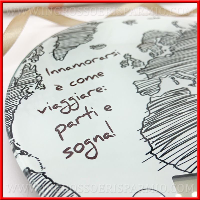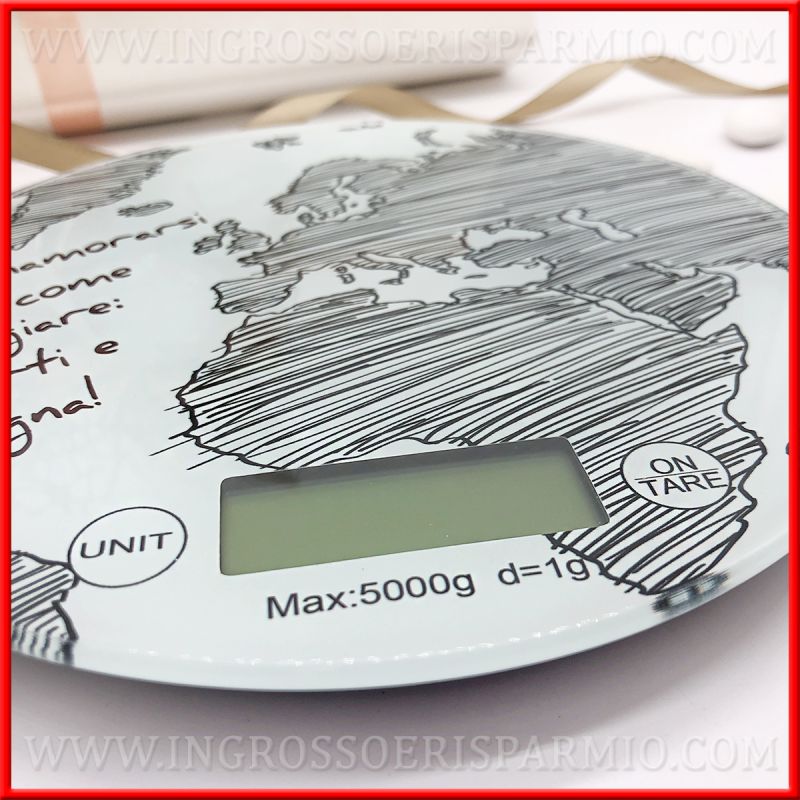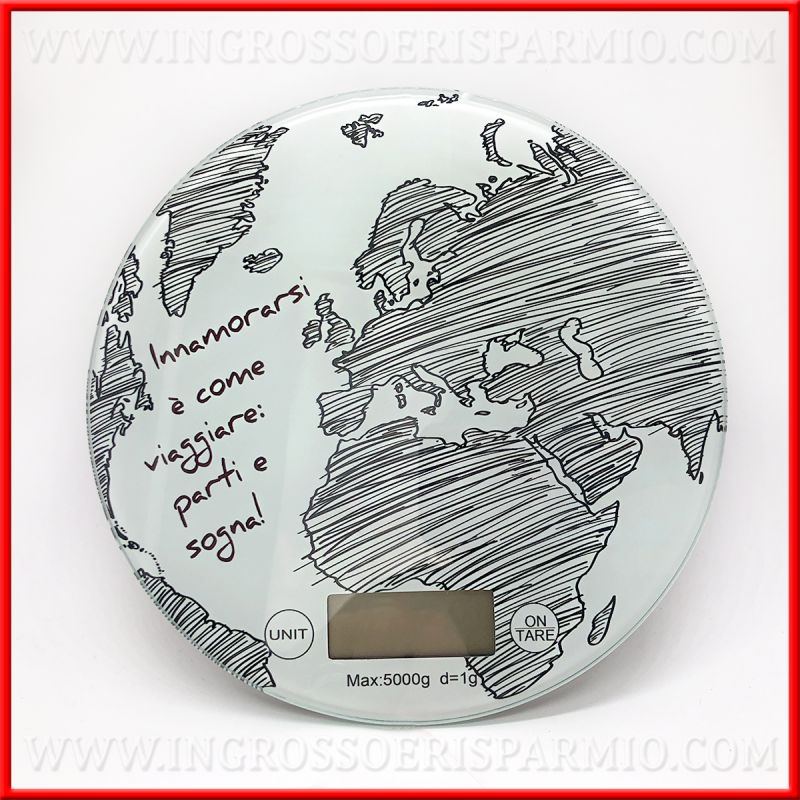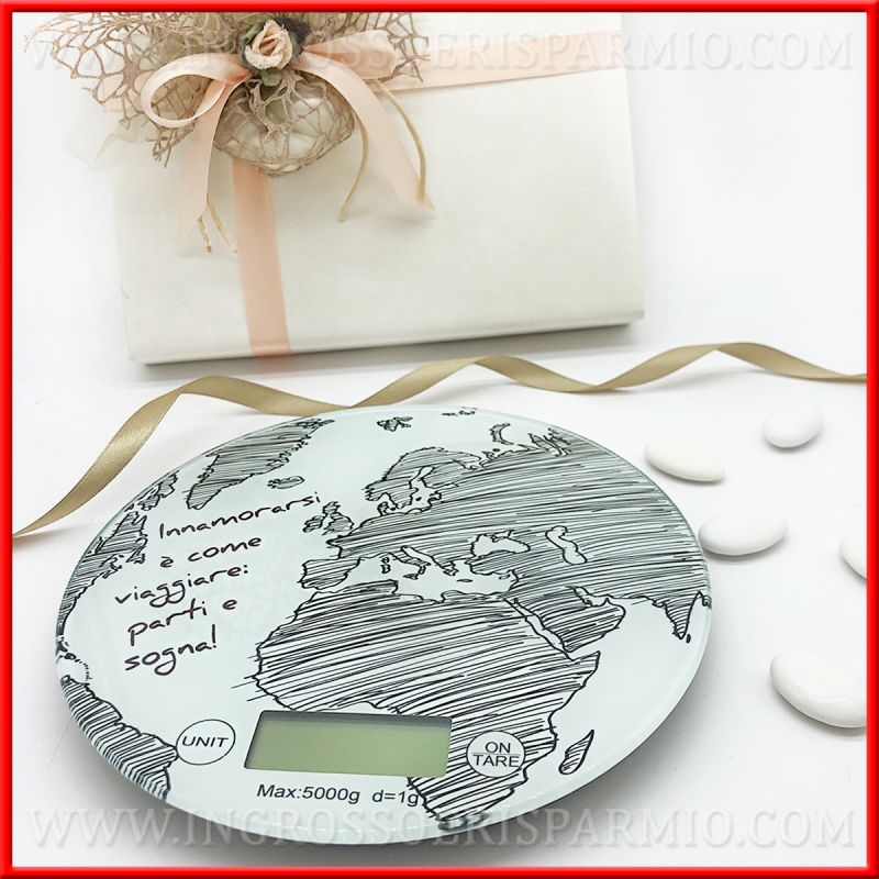 Bomboniere mappamondo con funzione di bilancia per alimenti: bilance digitali di forma rotonda, con superficie in vetro e disegno mondo/planisfero. Oltre alla raffigurazione dei continenti, sulla bilancia pesa alimenti è scritta la frase "Innamorarsi è come viaggiare: parti e sogna!": le bilance bomboniere mondo sono così rese specifiche per bomboniere matrimonio o bomboniere anniversario!