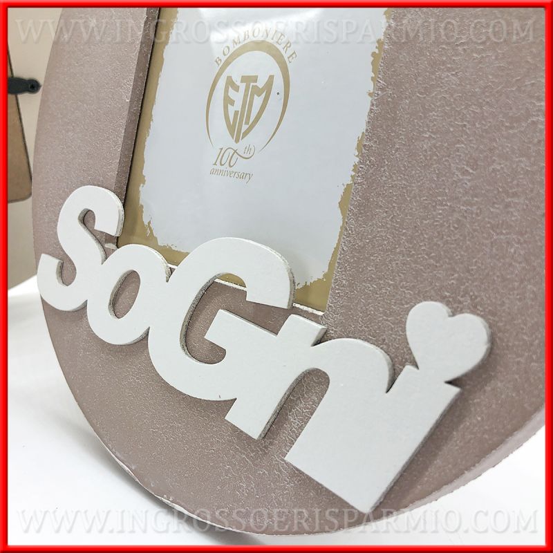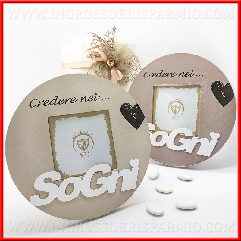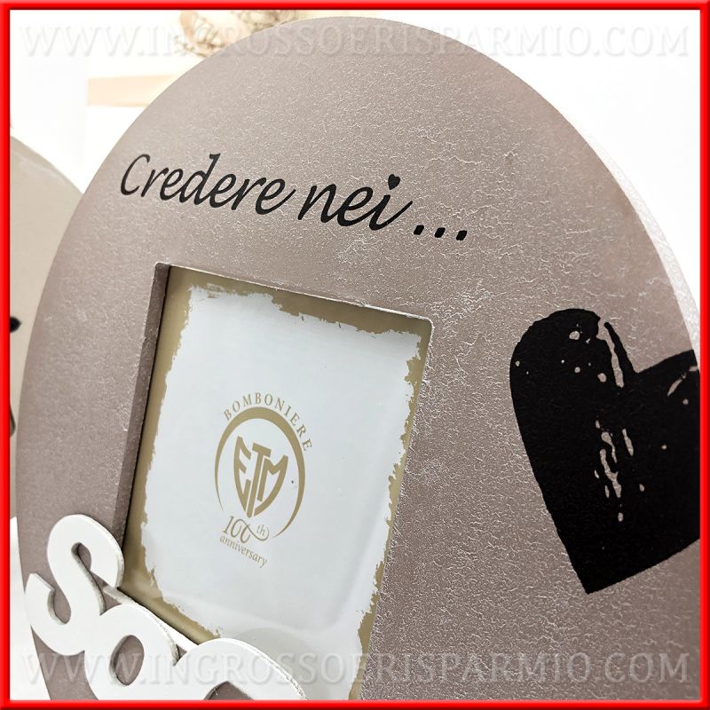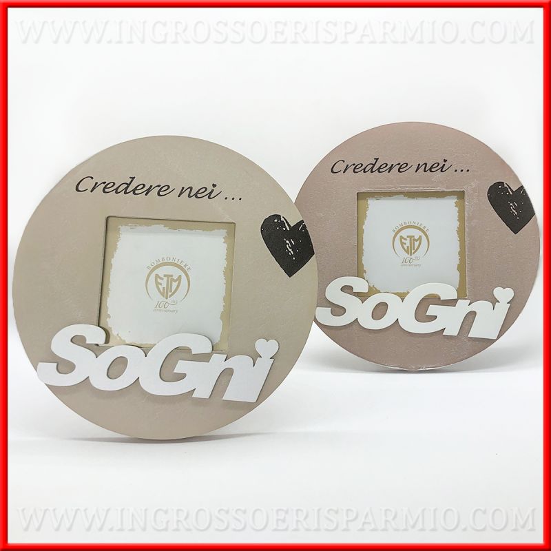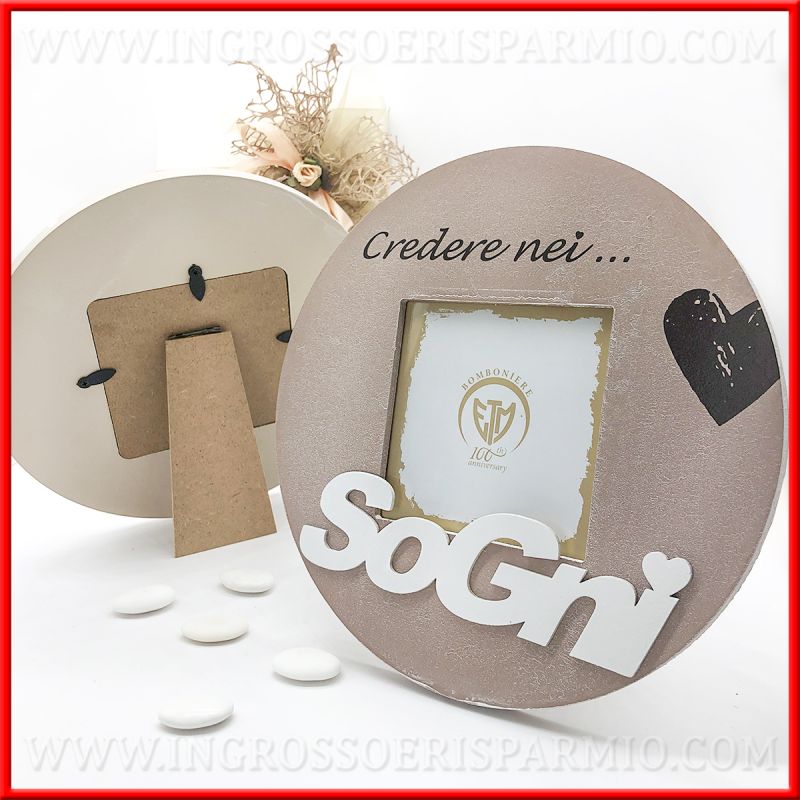 Il portafoto da tavolo ha una particolare forma rotonda con spazio per la foto di forma quadrata. La cornice in legno è dipinta in modo non uniforme, con effetto "screpolato" in due tonalità assortite, crema e rosa antico (non è possibile selezionare una sola variante di colore). In alto c'è la stampa "Credere nei..." ed in basso una scritta in legno "SoGni": i portafoto con scritte saranno un'idea speciale per omaggiare i tuoi invitati nel giorno delle tue nozze.