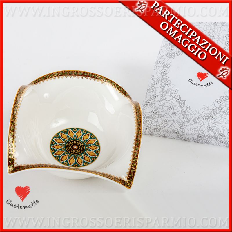 Porta cioccolatini Cuorematto, linea Cuor d'Oriente, in ceramica bianca, quadrato con fondo tondo e capiente per essere utilizzato come portaconfetti, portacaramelle o semplicemente come svuotatasche...