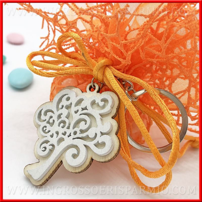 Il porta chiavi si compone di due sagome albero della vita sovrapposte, una in color legno naturale e l'altra, finemente intagliata, di colore bianco. I colori neutri permetto di utilizzare queste bomboniere portachiavi per qualsiasi ricorrenza: chi li riceverà apprezzerà senza dubbio questo originale pensiero.