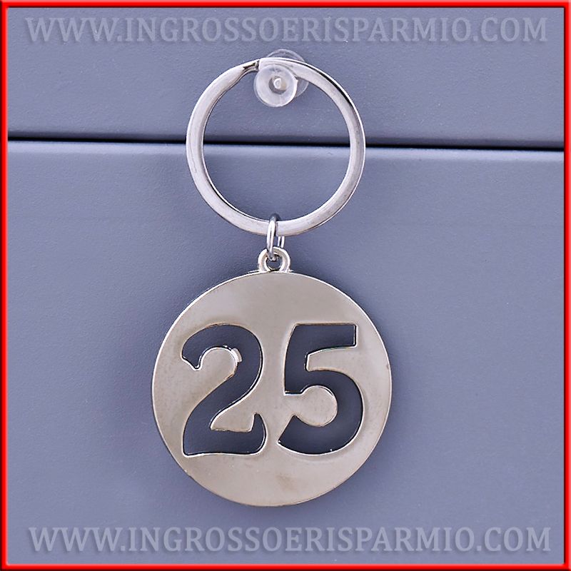 Portachiavi con ciondolo a forma di medaglia intagliata con numero 25, in metallo silver/argentato, neutro, ideale sia come bomboniere compleanno ragazzo o ragazza, sia come bomboniere economiche per anniversario di matrimonio.