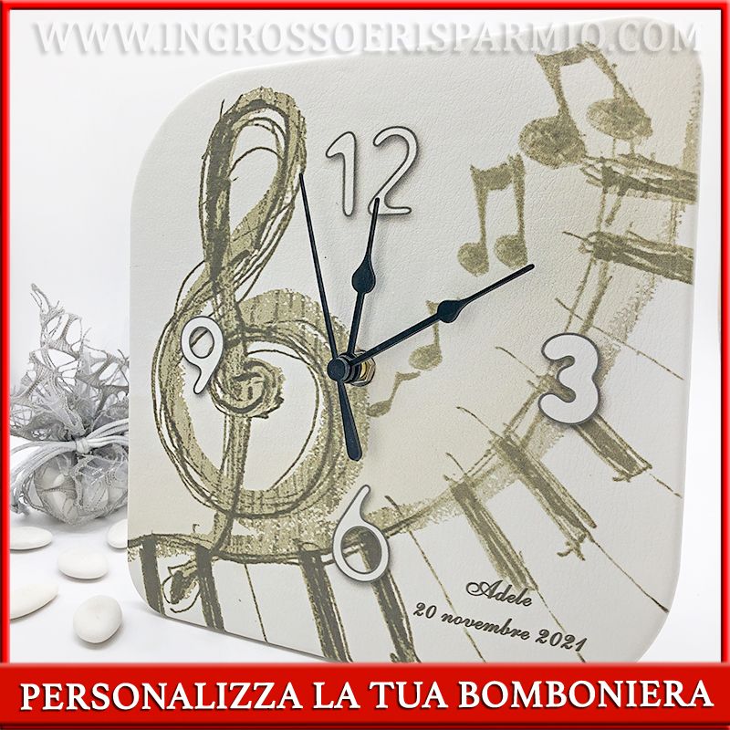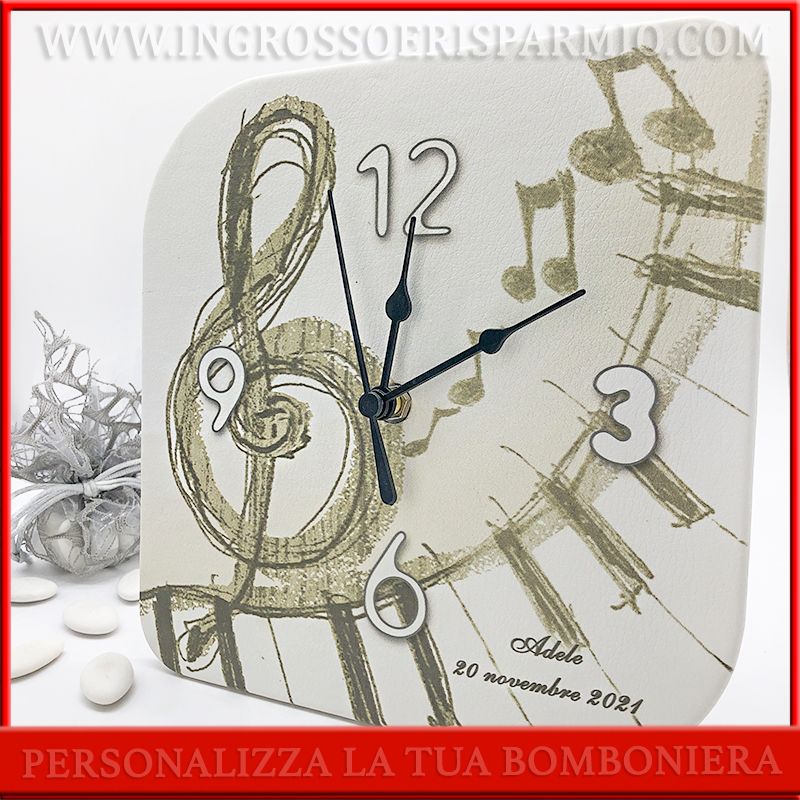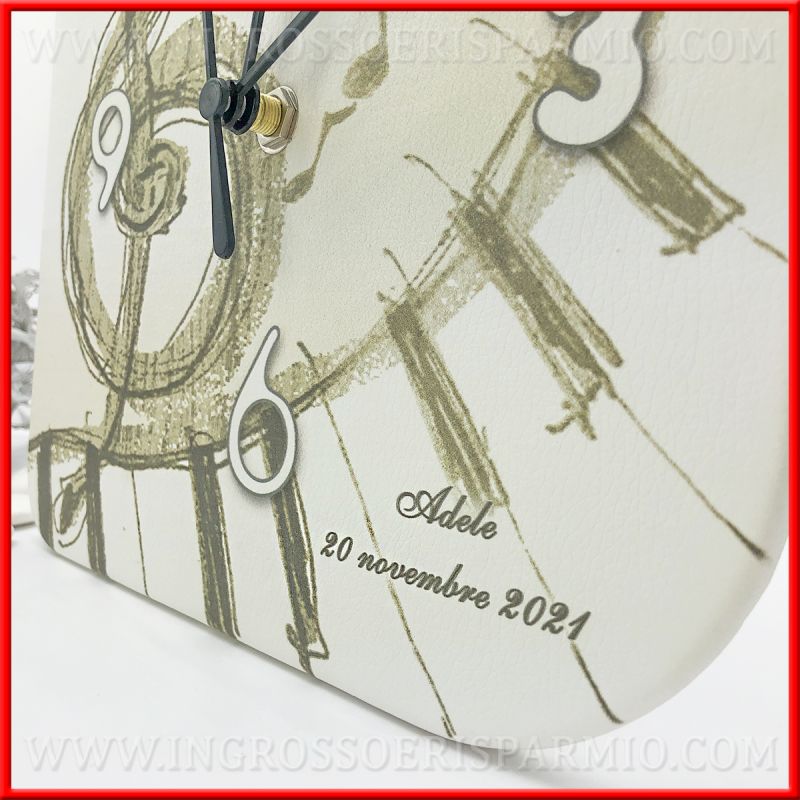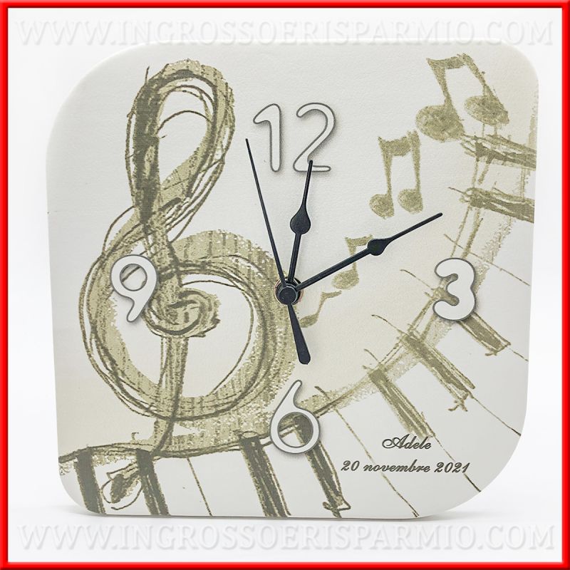 Orologio da parete o tavolo di forma quadrata, con angoli rotondi, composti da un supporto in legno, rivestito in ecopelle con stampa sui toni del tortora, raffigurante i tasti di un pianoforte, con note musicali e chiave di violino.